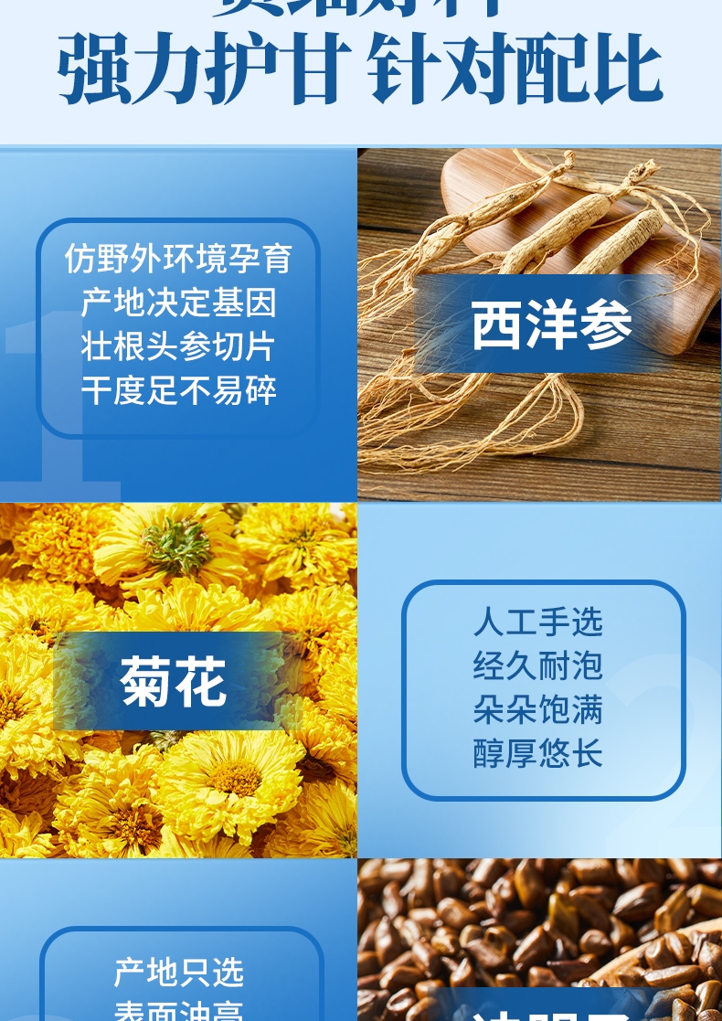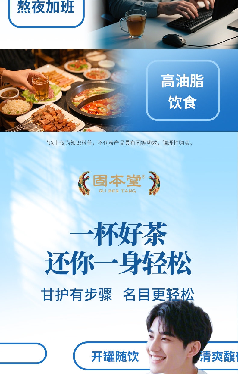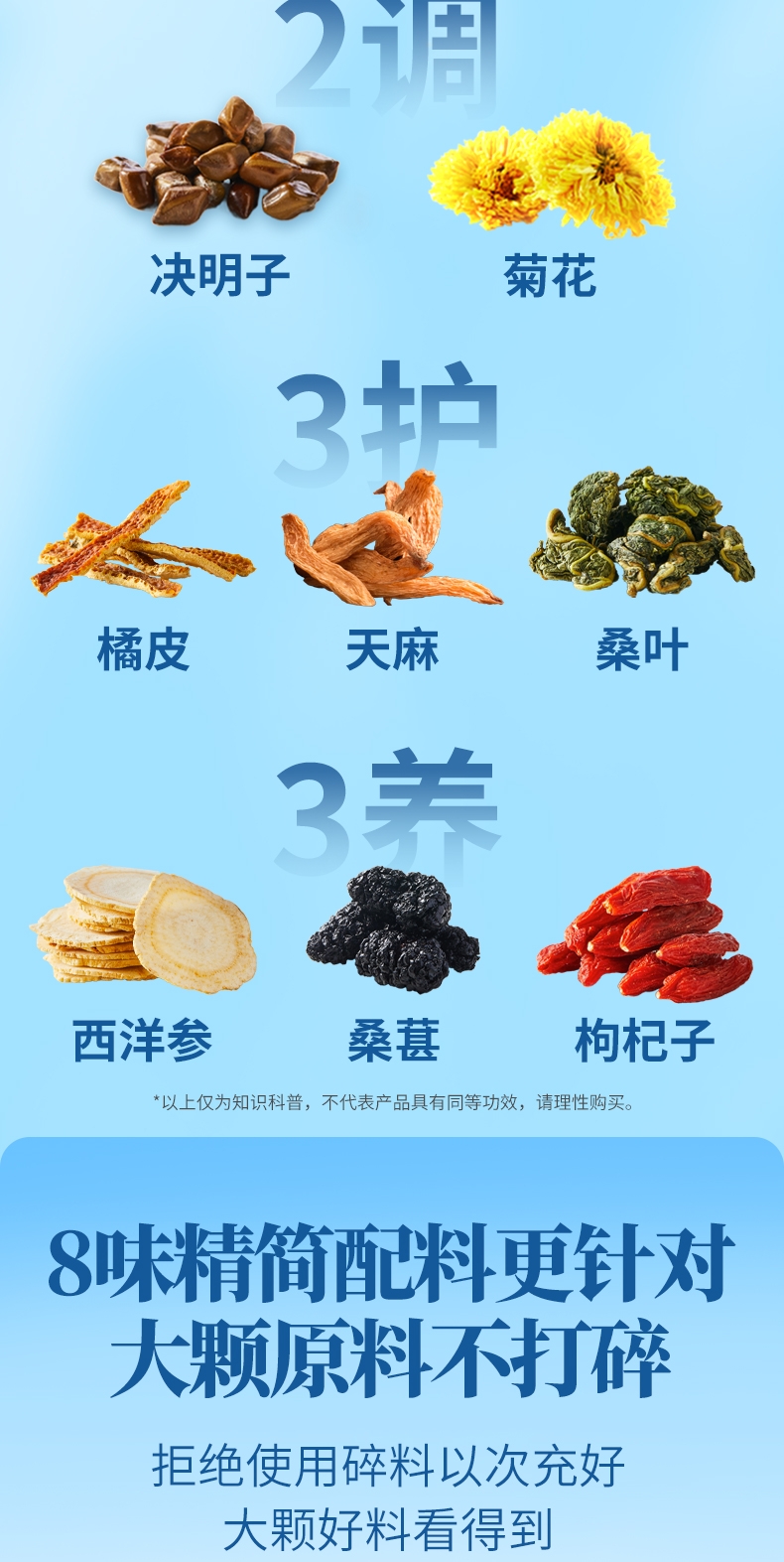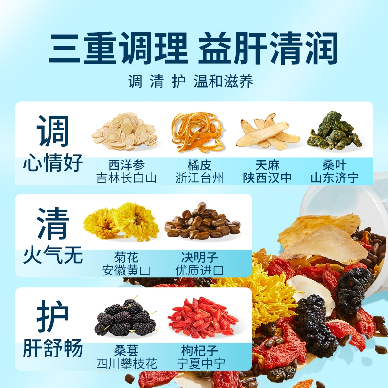 三重调理 益肝清润;呵护心肝宝贝 视轻燥消身清爽;贵细好料 强力护甘 针对配比