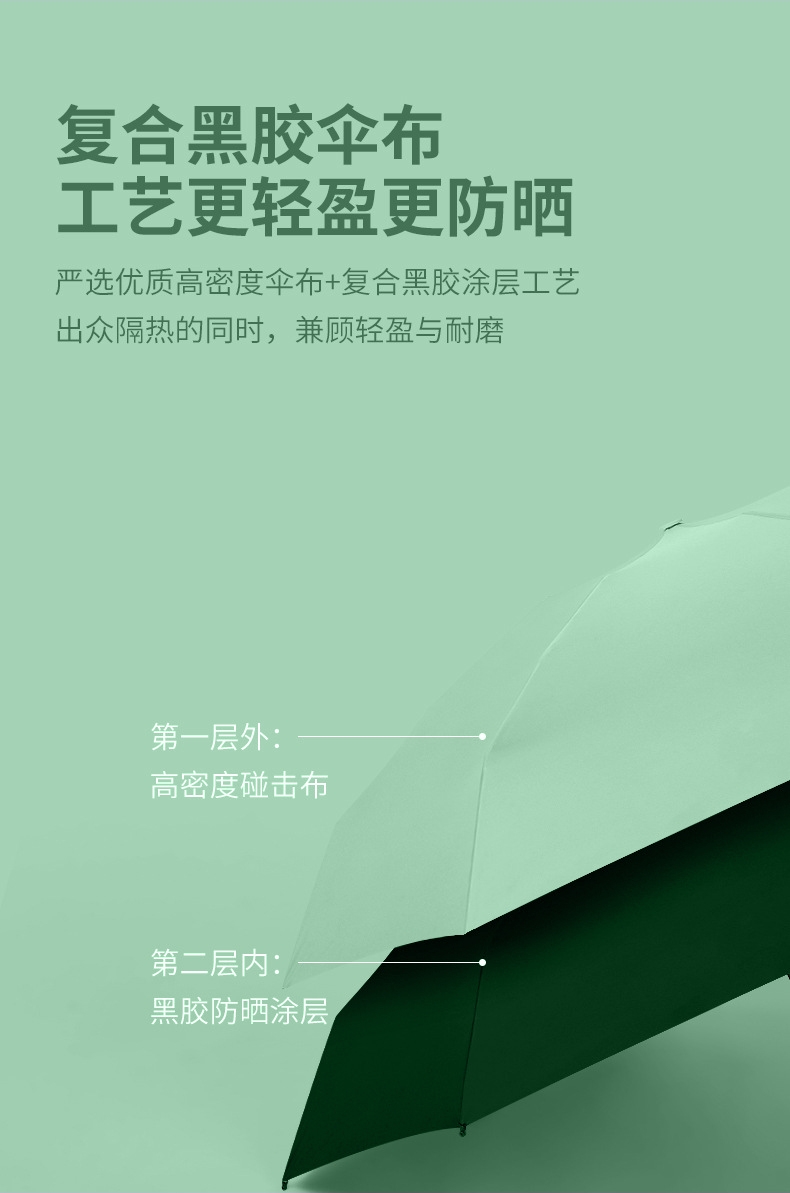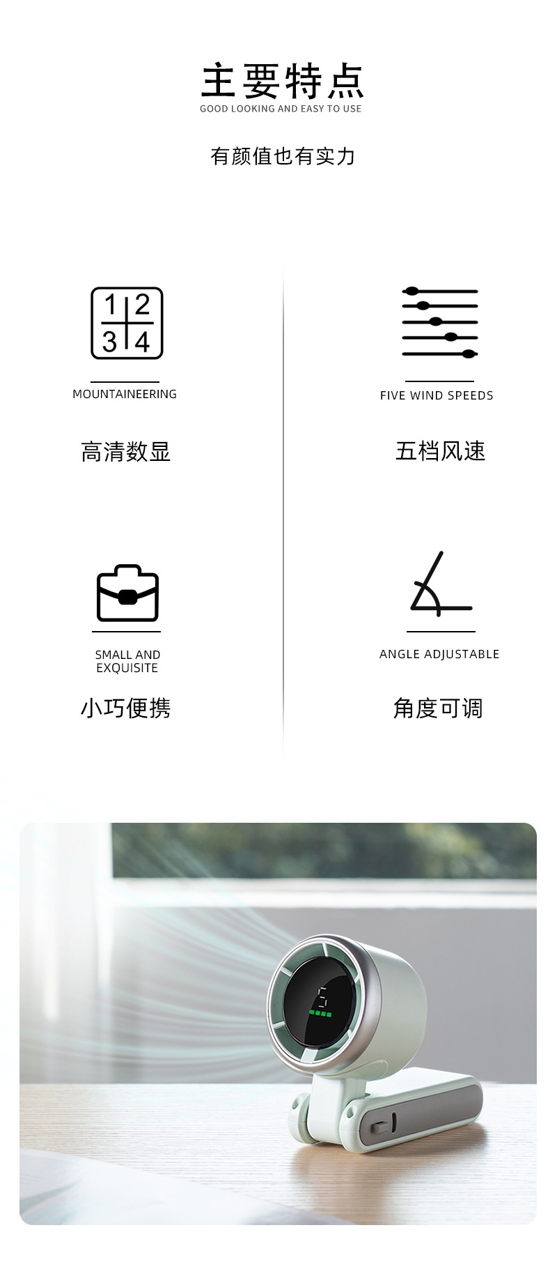 产品风量五档可调,风力强劲,携带方便;迷你便携防紫外线雨伞:21寸5折6骨;夏季防晒冰袖:高弹力透气冰丝锦纶面料