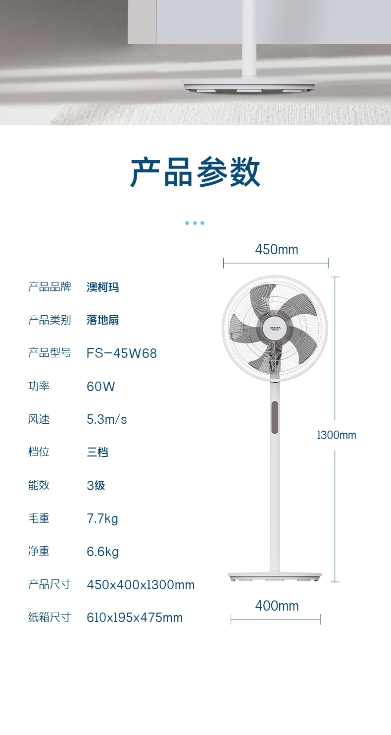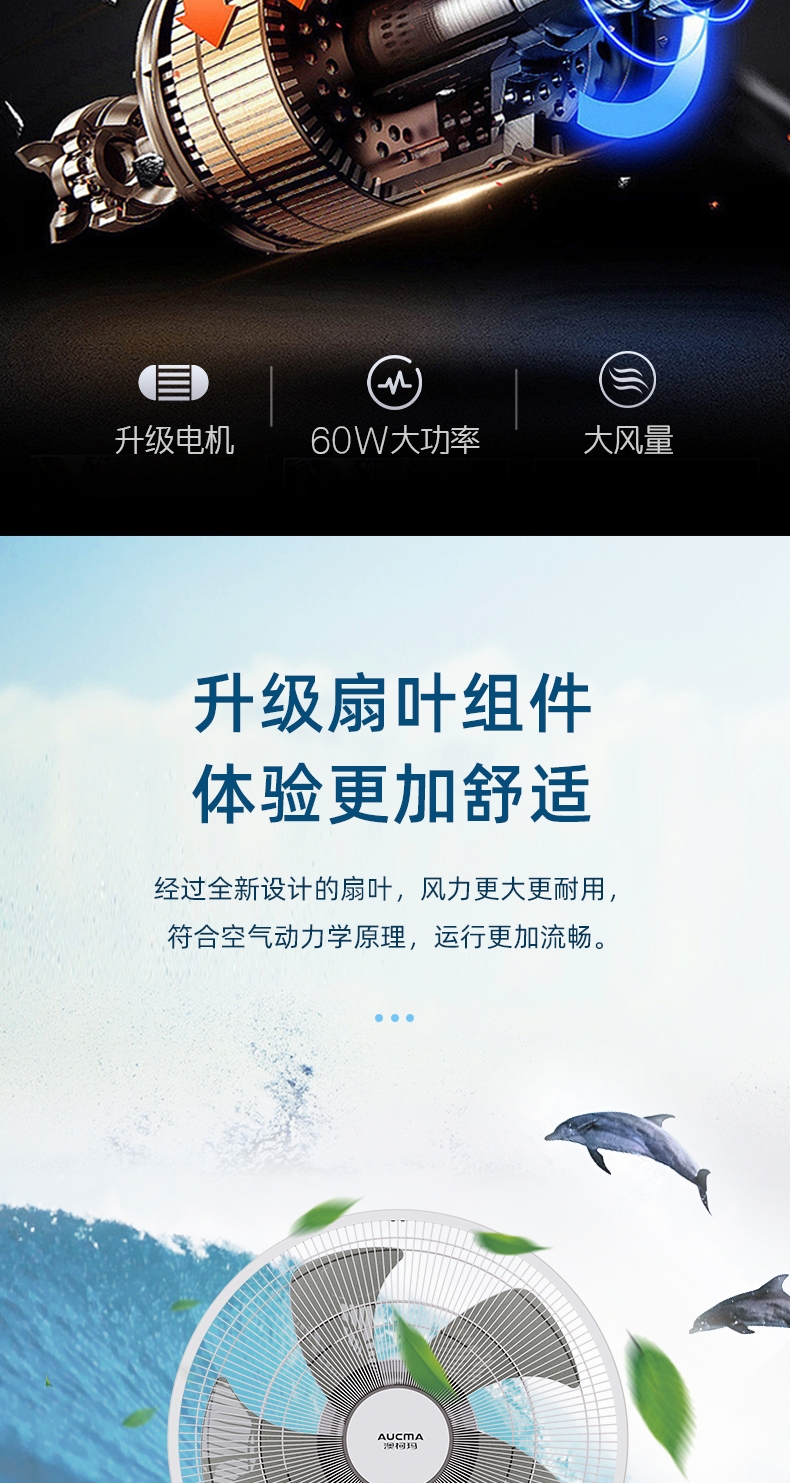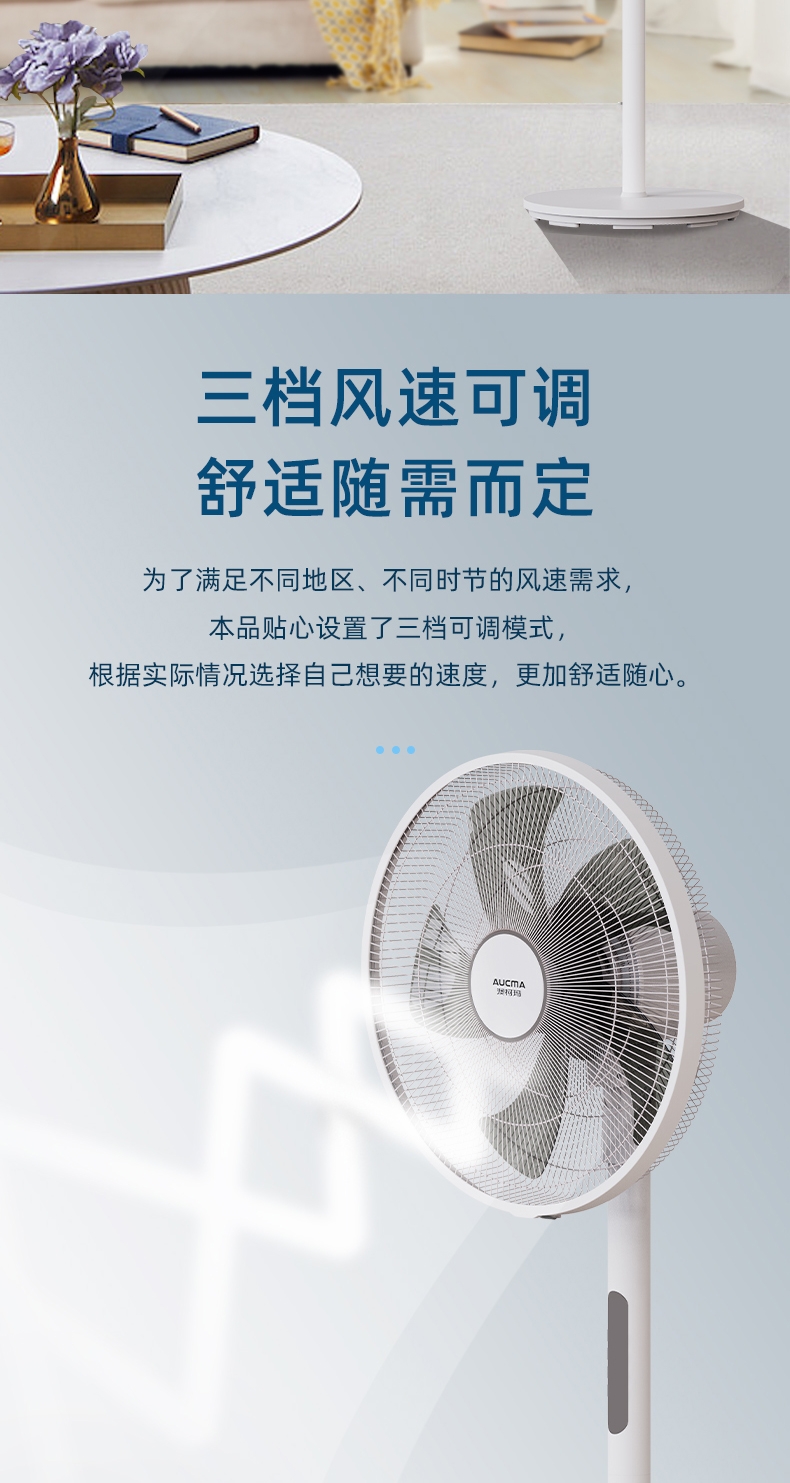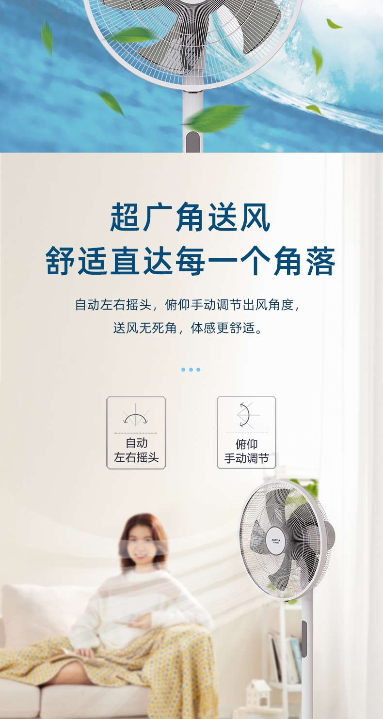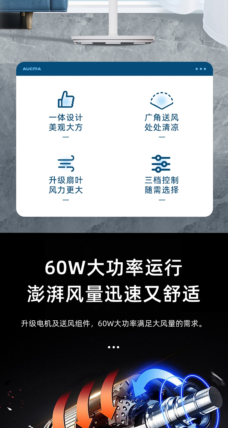 升级电机及送风组件,60W大功率满足大风量的需求;自动左右摇头,俯仰手动调节出风角度,送风无死角;满足不同时节的风速需求,设置三档可调模式
