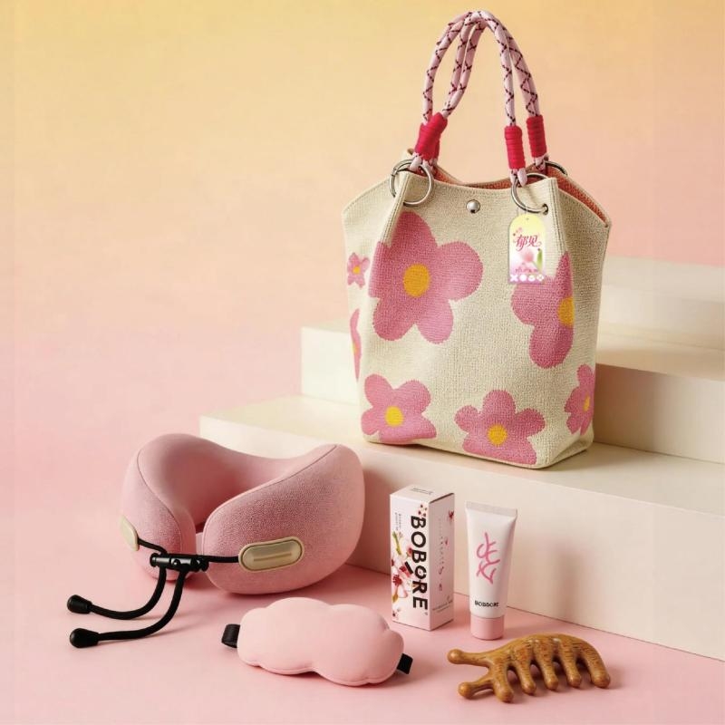 礼盒配置:针织手提包*1、 冰丝眼罩*1、 U型枕*1 波波护手霜*1 檀木梳子*1