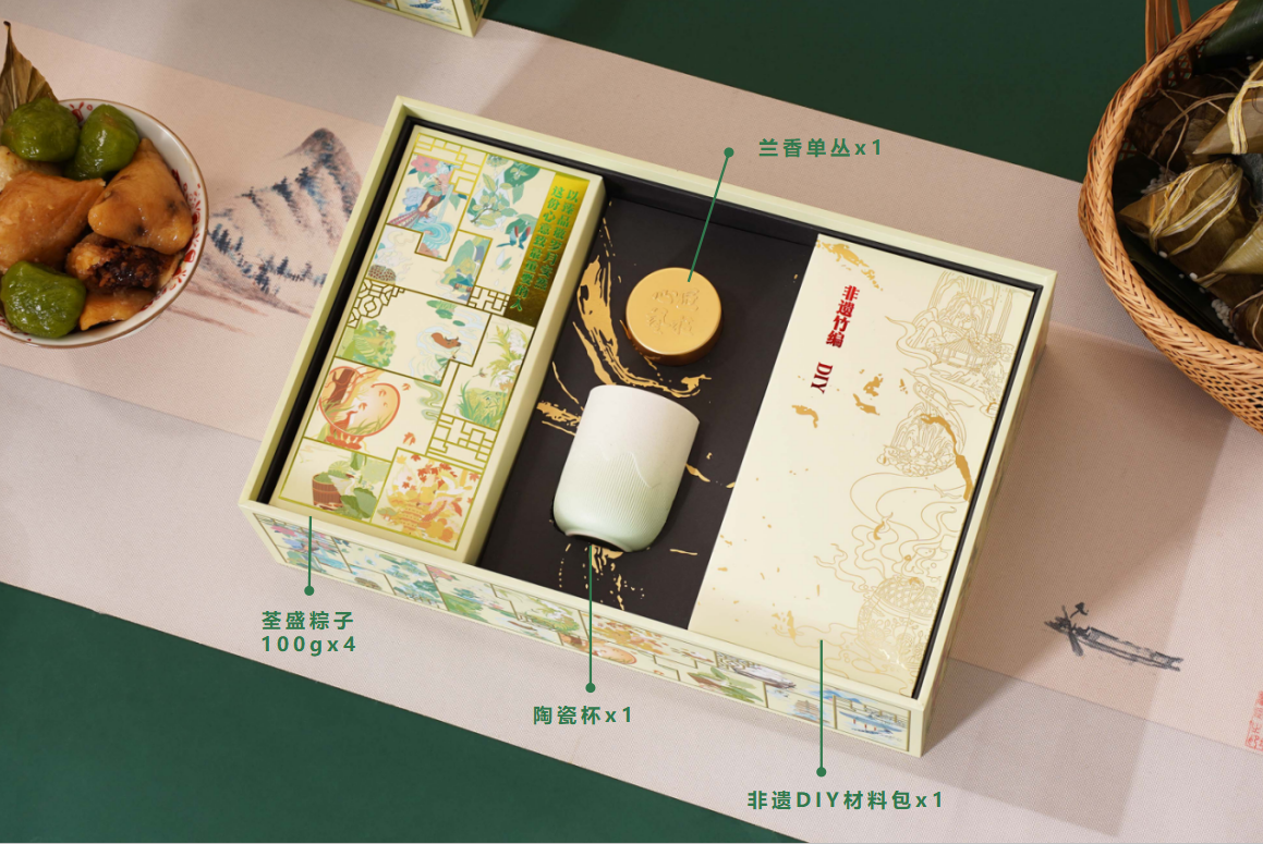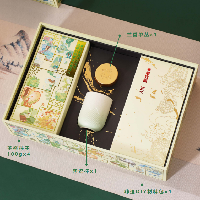 配置清单:荃盛粽子100gx4(经典鲜肉粽x1,飘香桂花粽x1,低糖青稞蛋黄肉粽x1,低糖青稞豆沙粽子x1),陶瓷杯x1,兰香单丛x1,非遗竹编DIY材料包x1