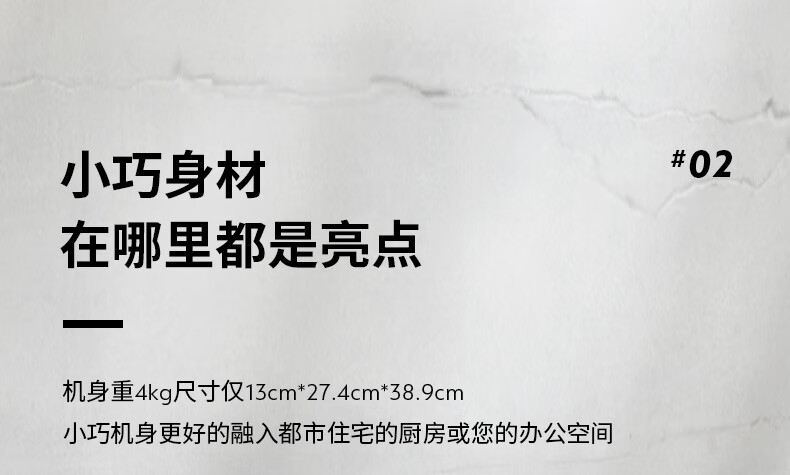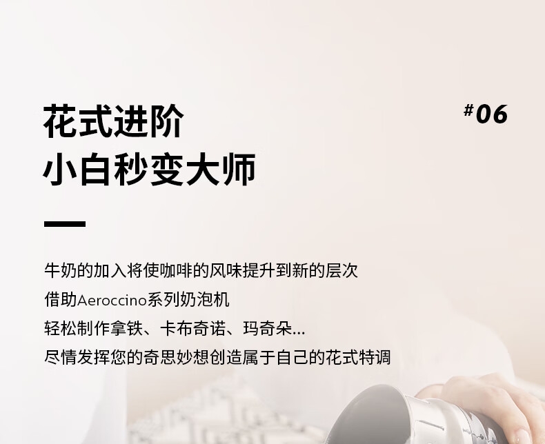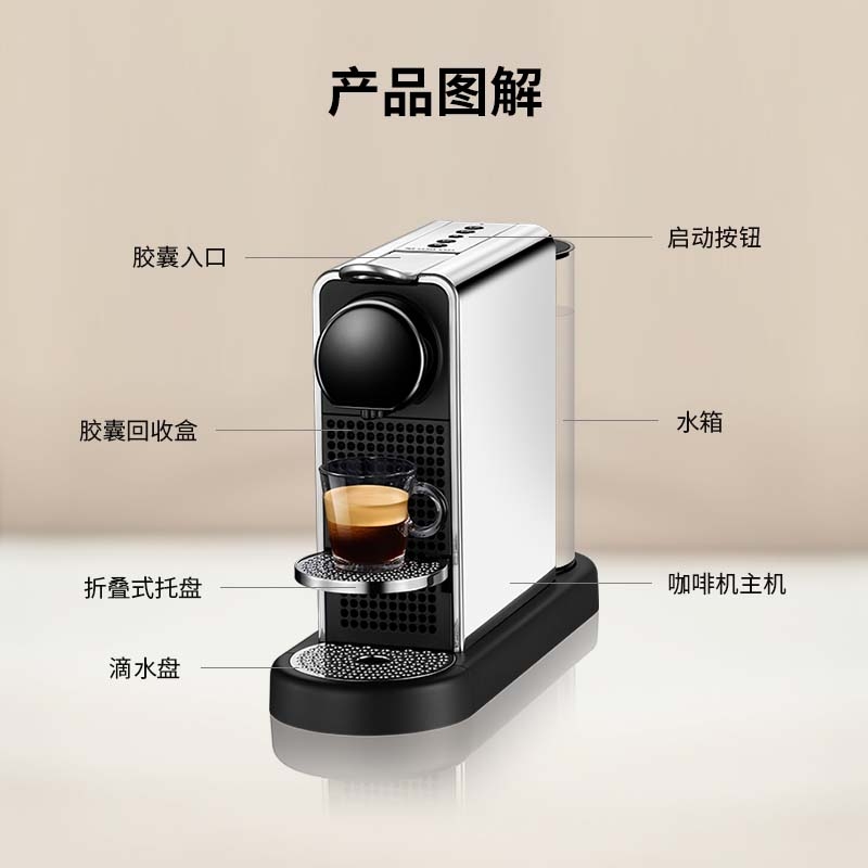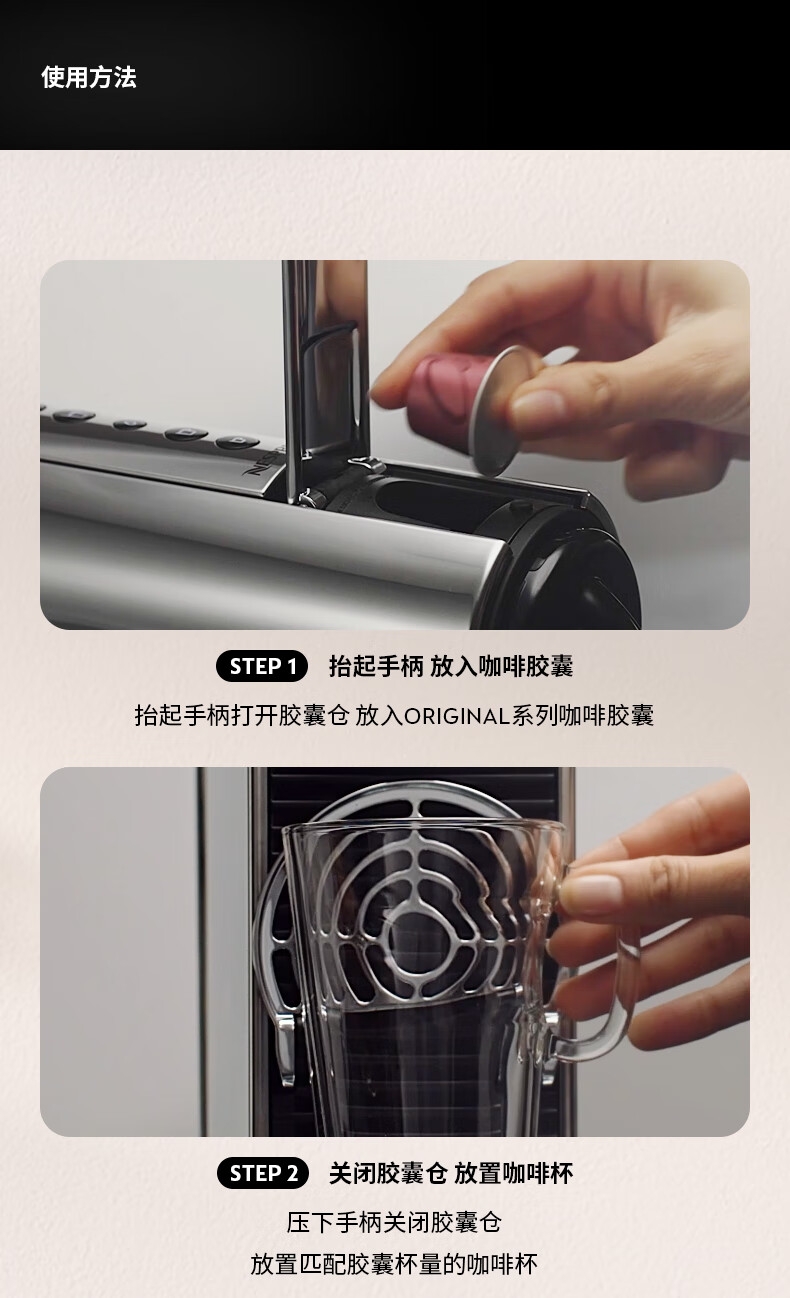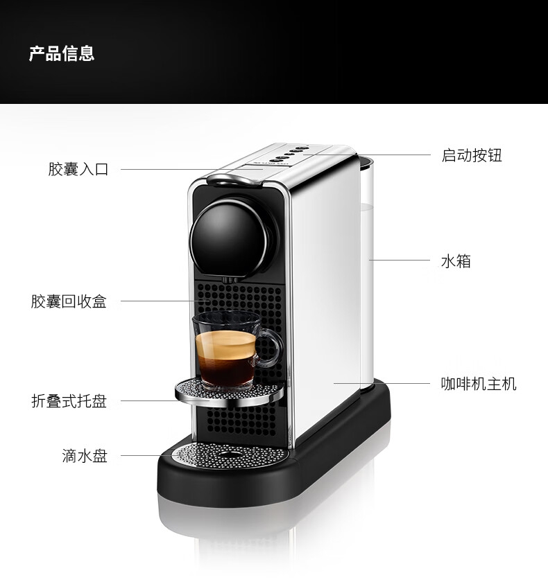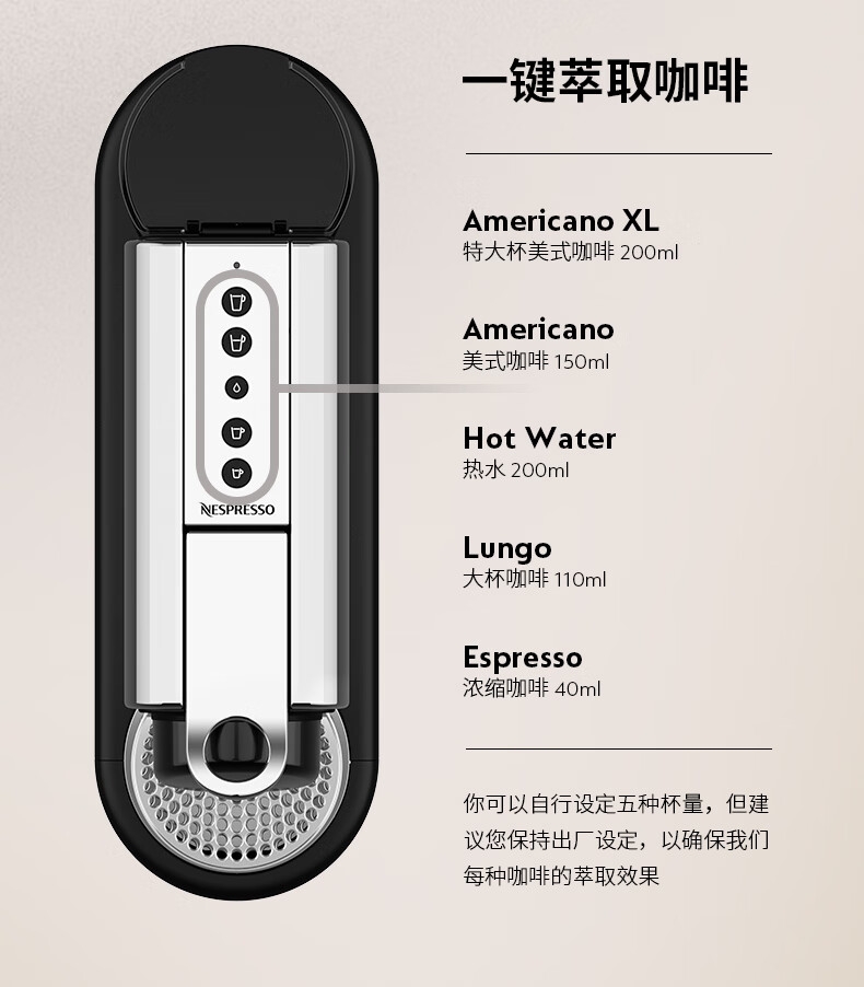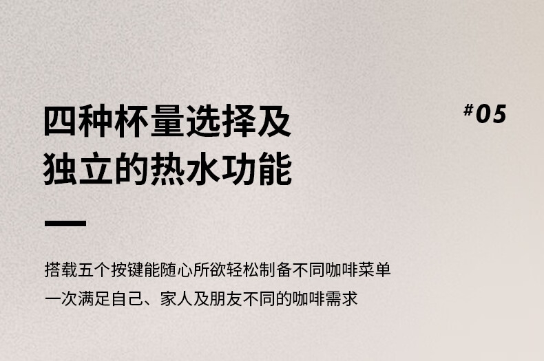 摩登时尚,一键美式;小巧便携,机身流畅;咖啡浓醇,油脂丰富,操作便捷