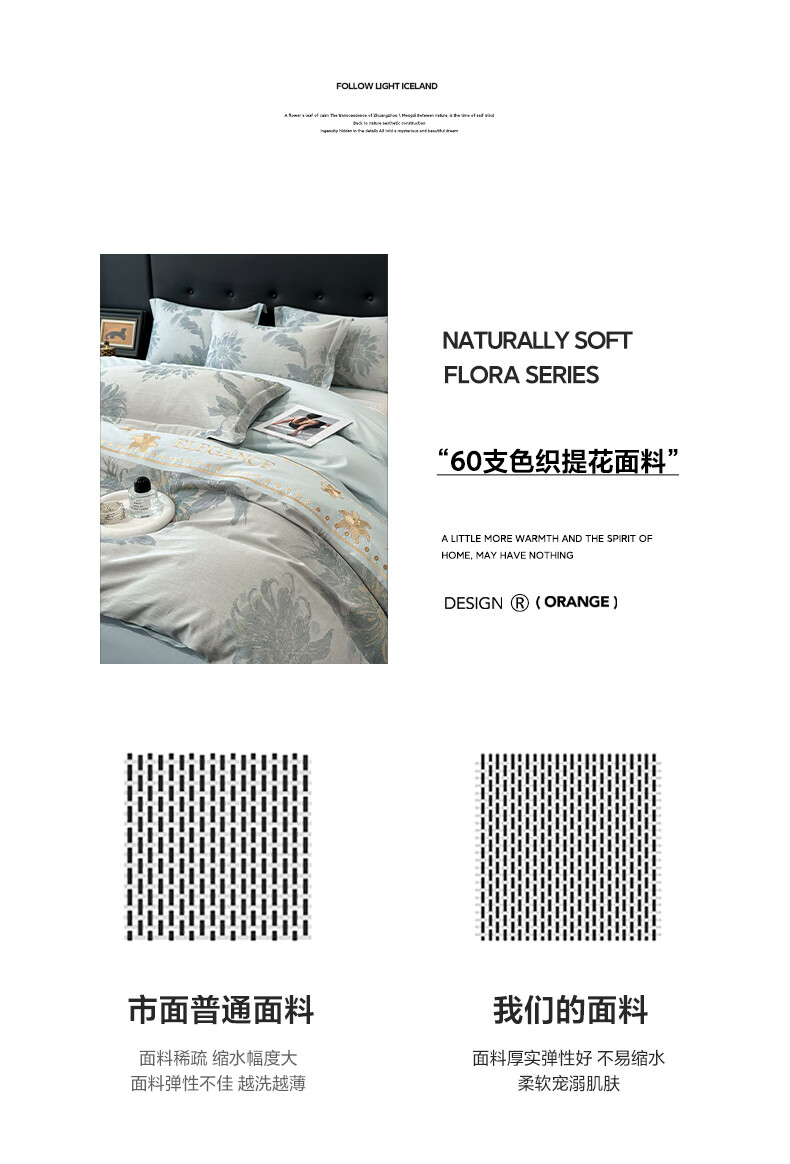 甄选60支色织提花面料追加13372纯棉;触感软糯亲肤每一寸肌肤都能感受到轻柔抚摸;新一代活性印染工艺不易晕染不易变形可机洗,