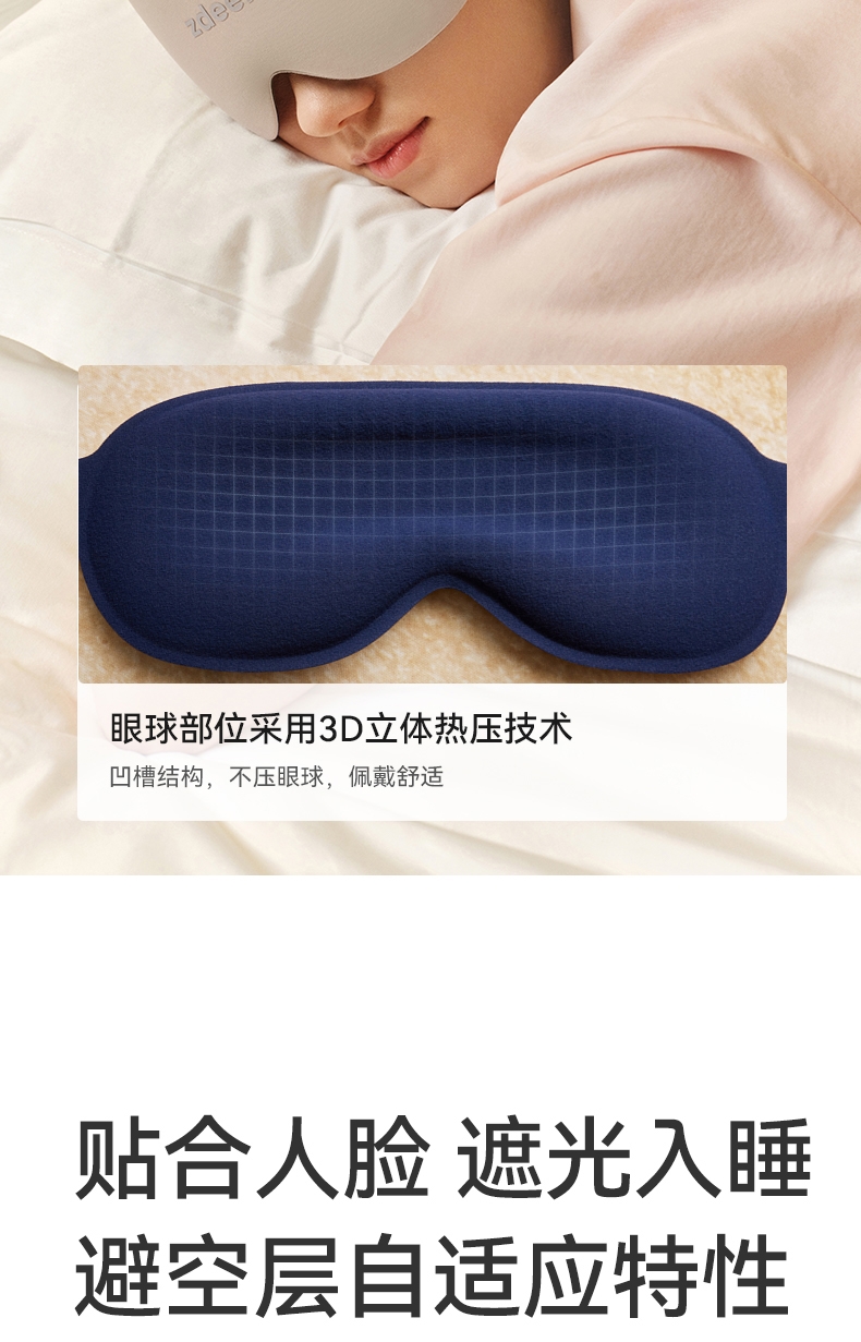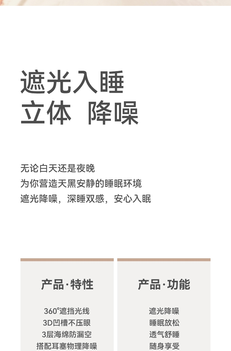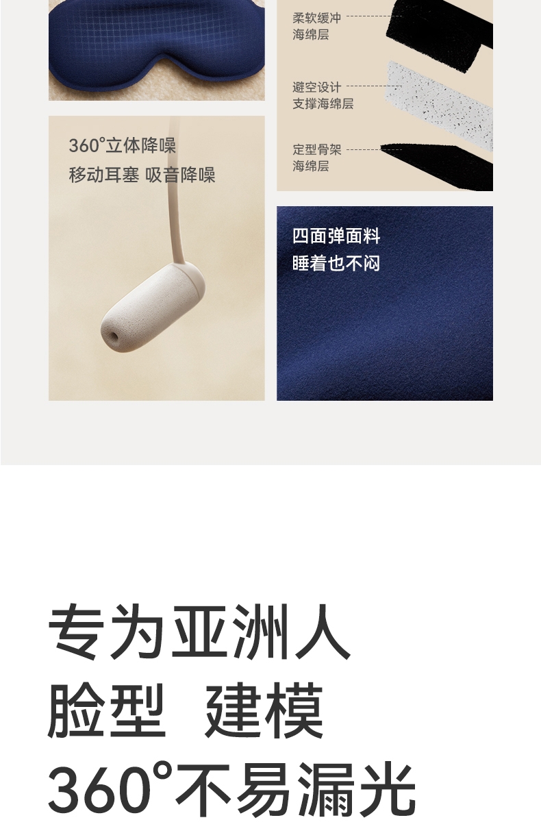 3D立体剪裁驼峰设计宽边设计,实现全包裹式遮光效果;亲肤透气、高弹性贴合面部曲线,舒适包裹感;降噪耳塞,零感佩戴无胀痛,侧睡舒适不压耳