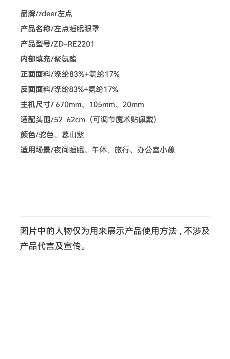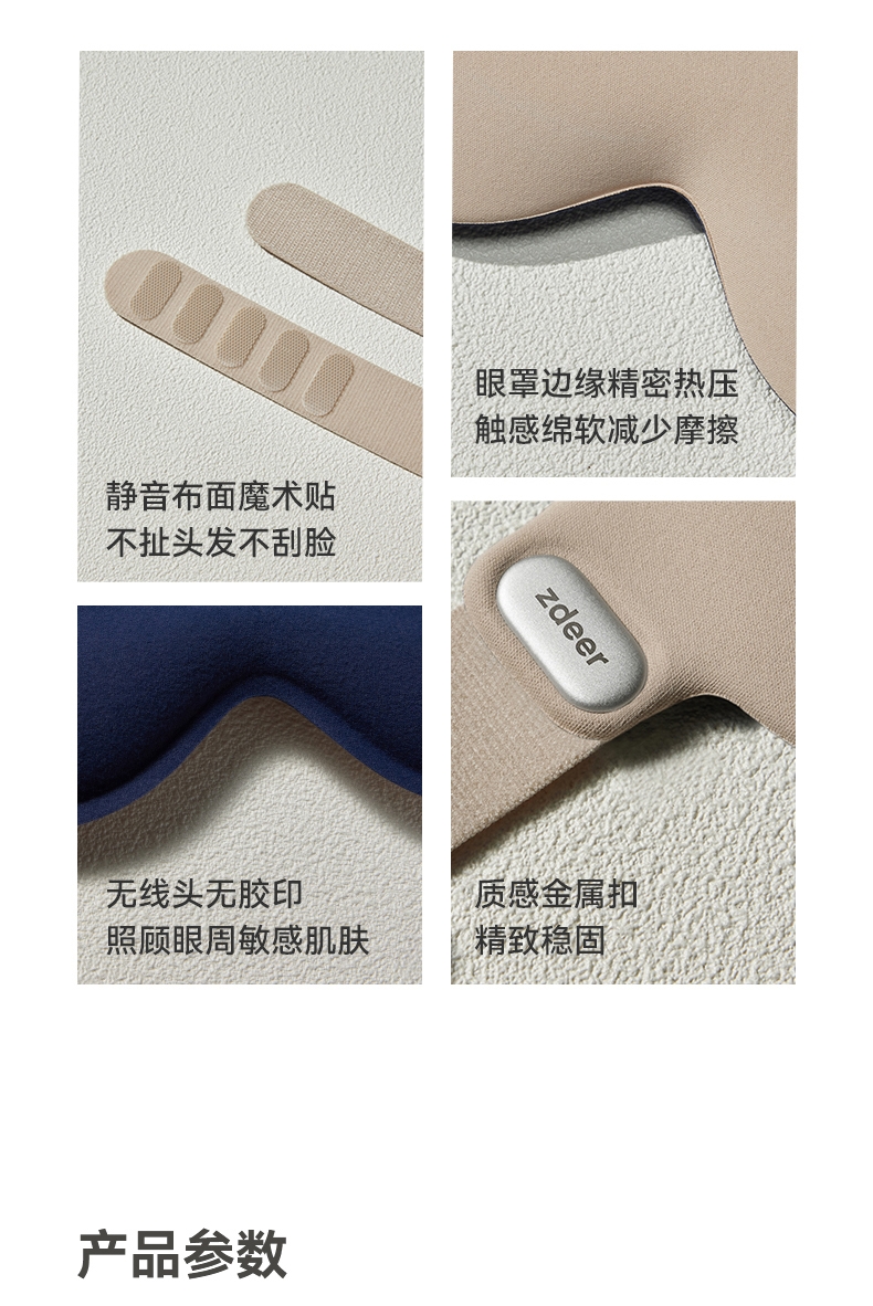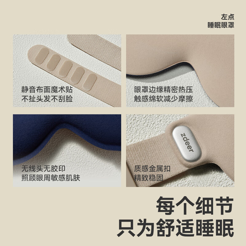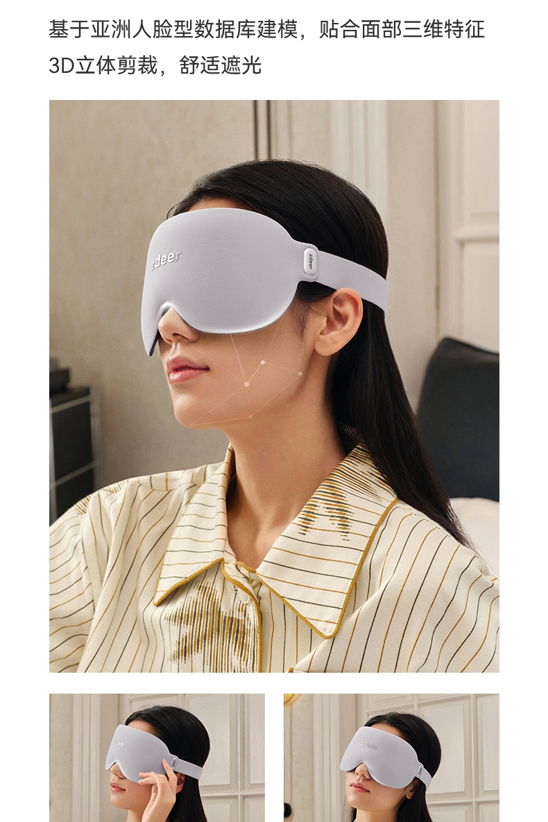 3D立体剪裁驼峰设计宽边设计,实现全包裹式遮光效果;亲肤透气、高弹性贴合面部曲线,舒适包裹感;降噪耳塞,零感佩戴无胀痛,侧睡舒适不压耳