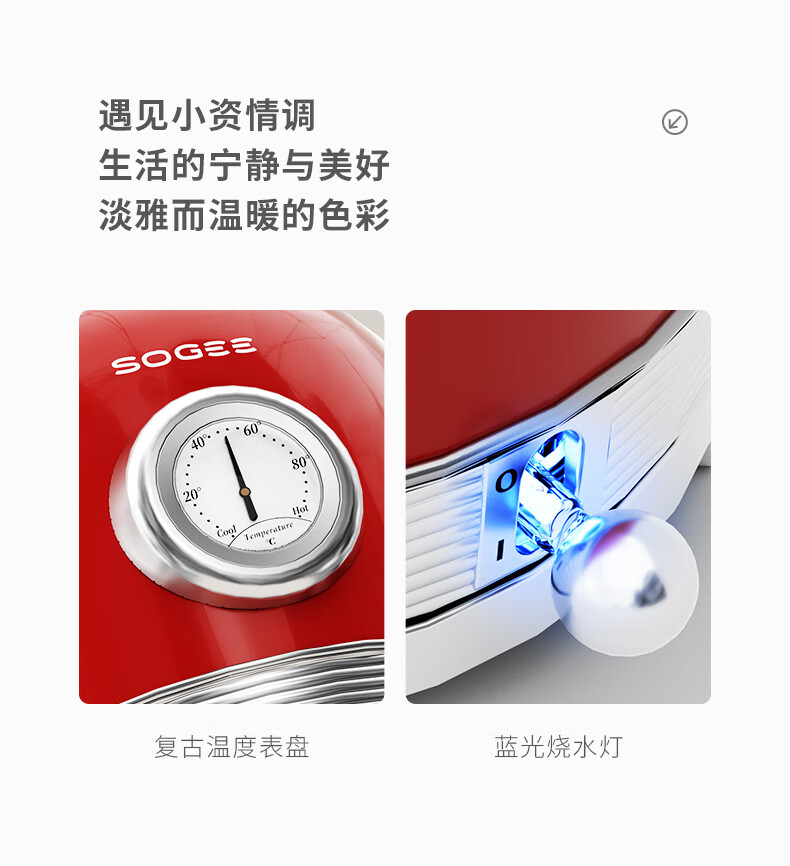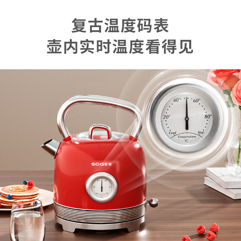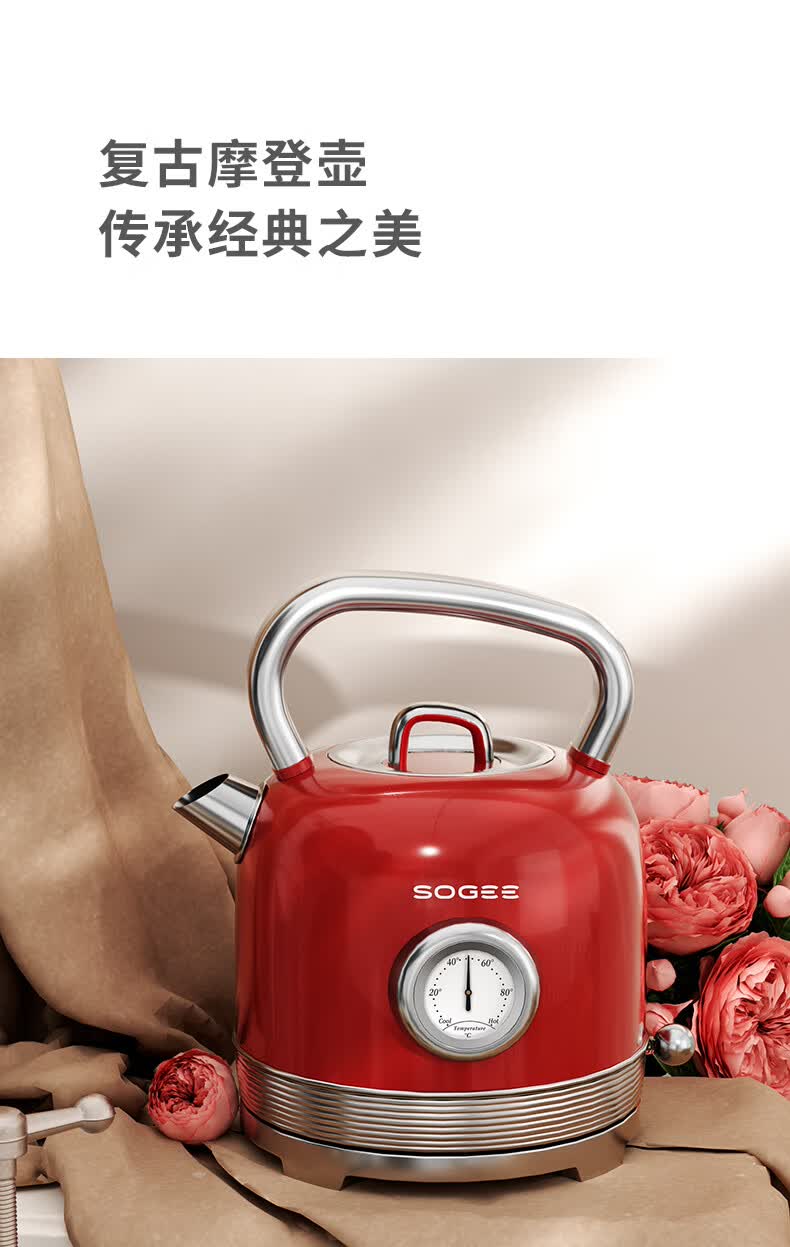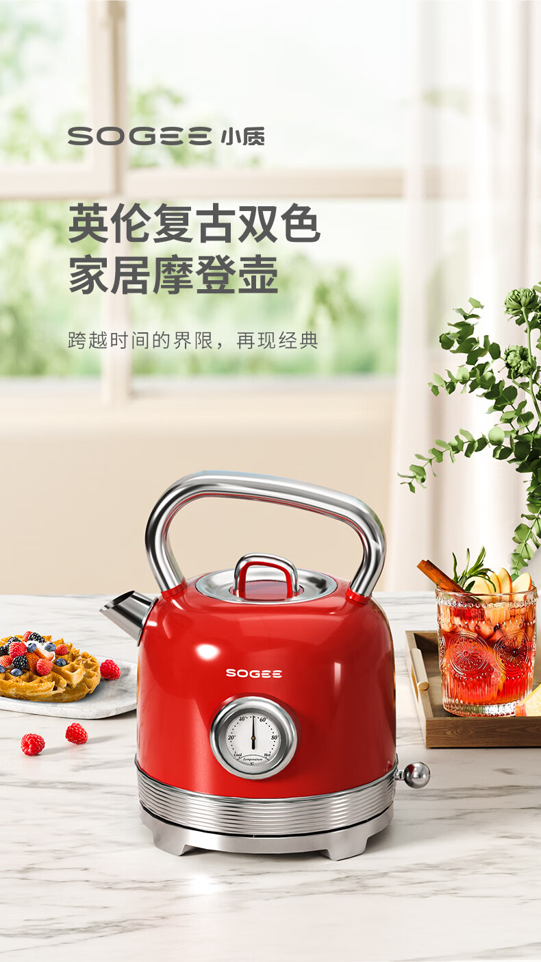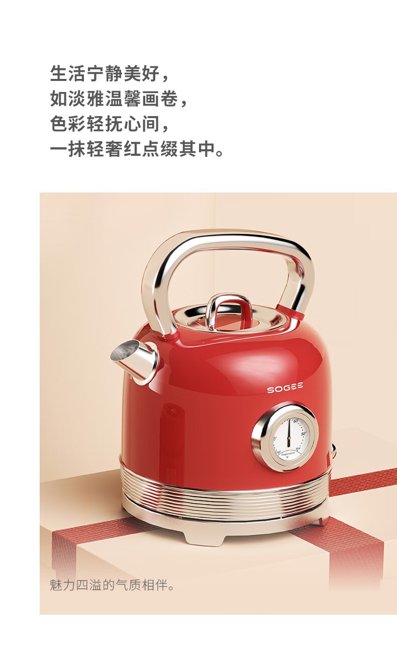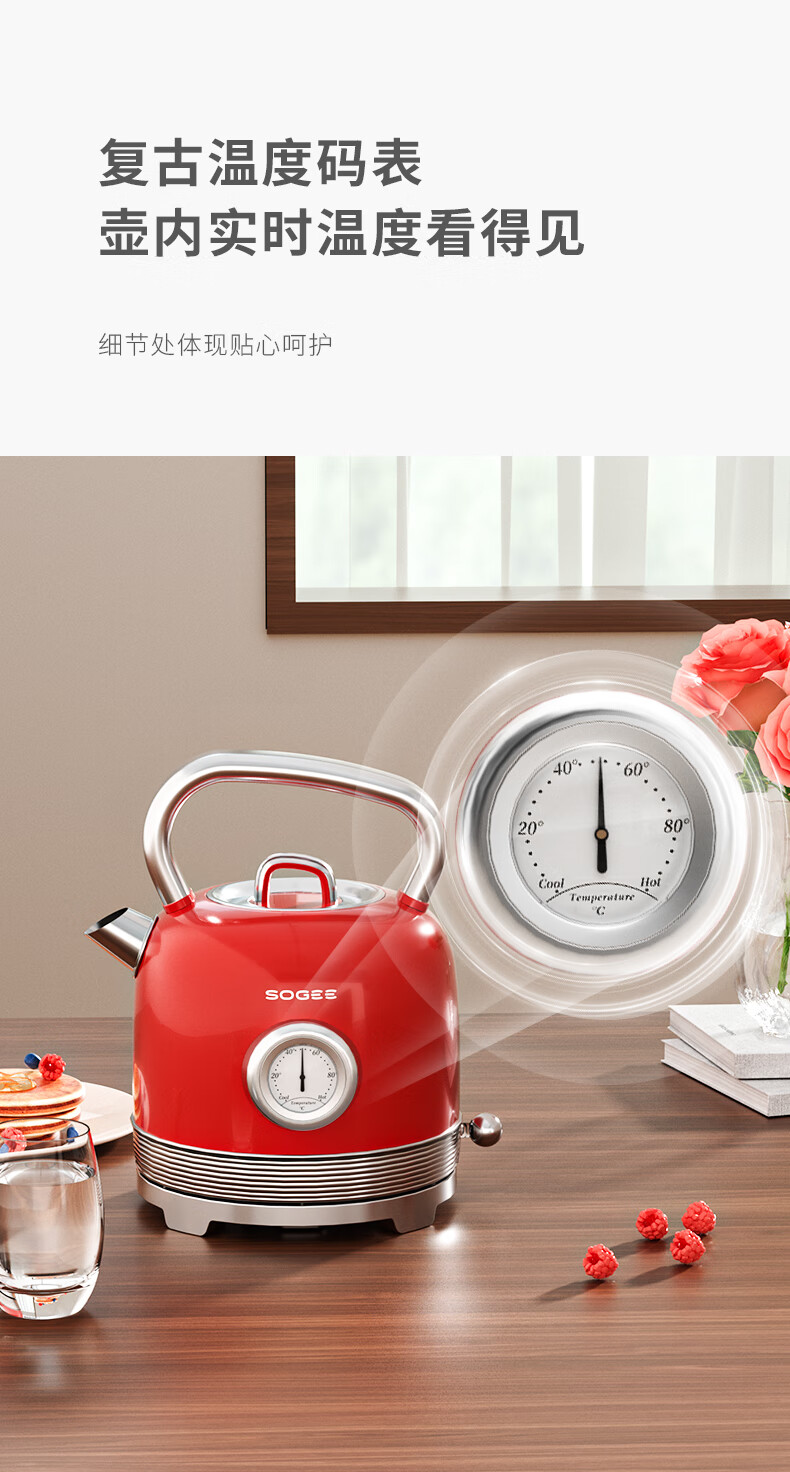 造型复古,时尚大气;外置精准温度器,水温一目了然;双重防干烧保护