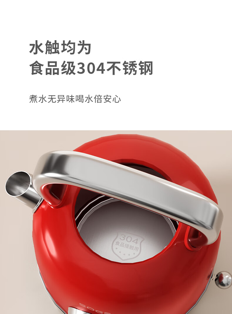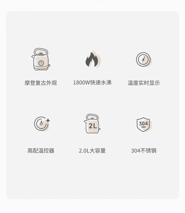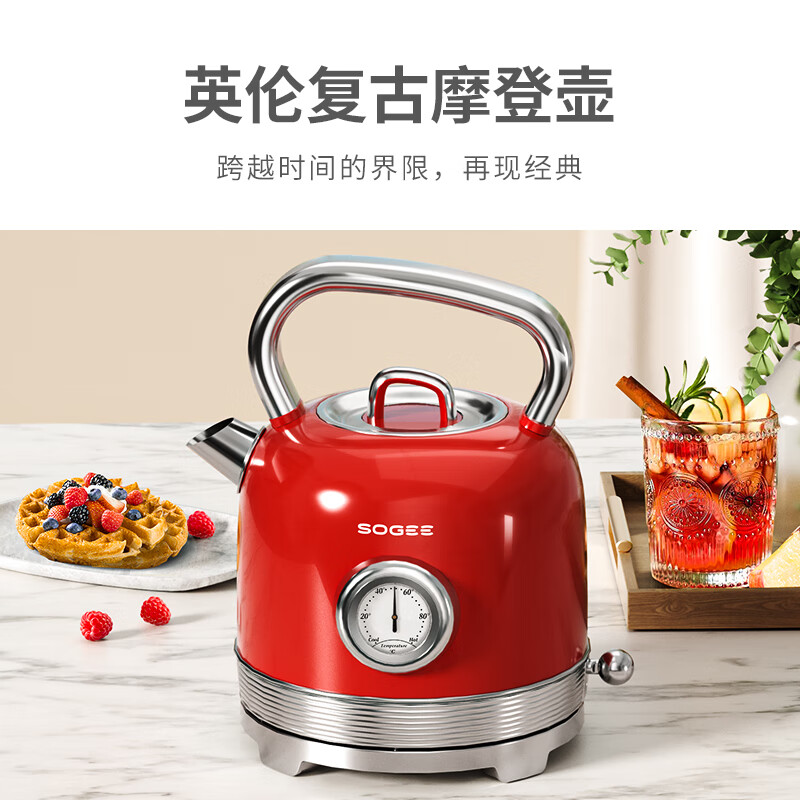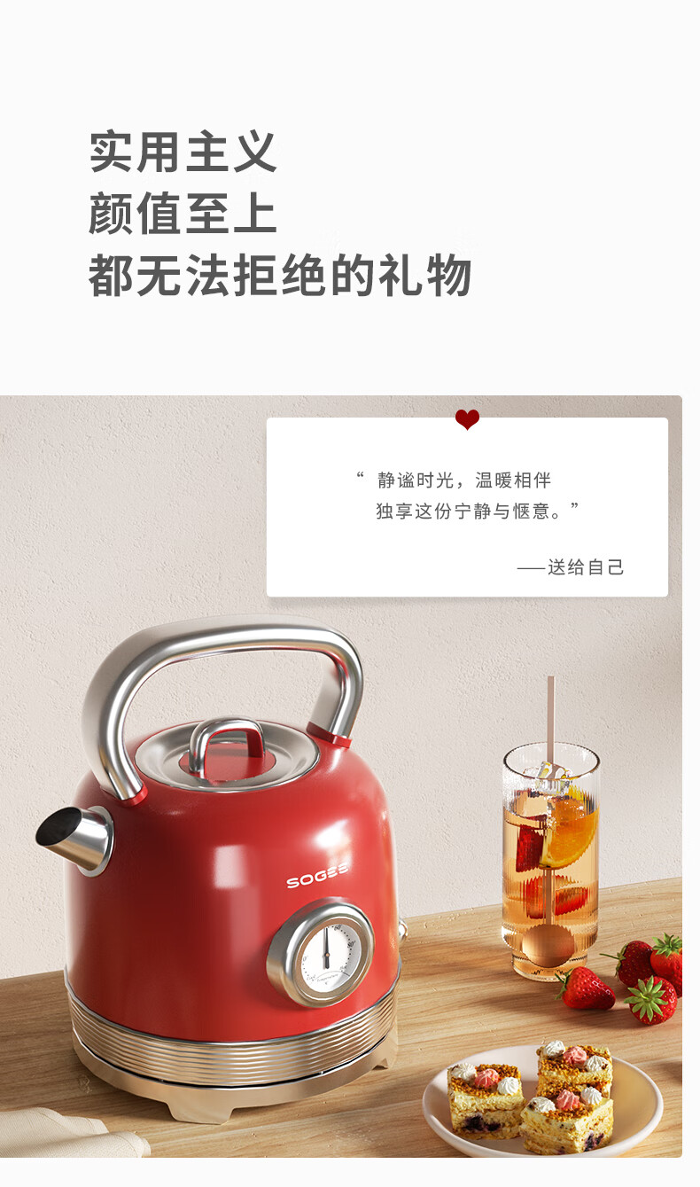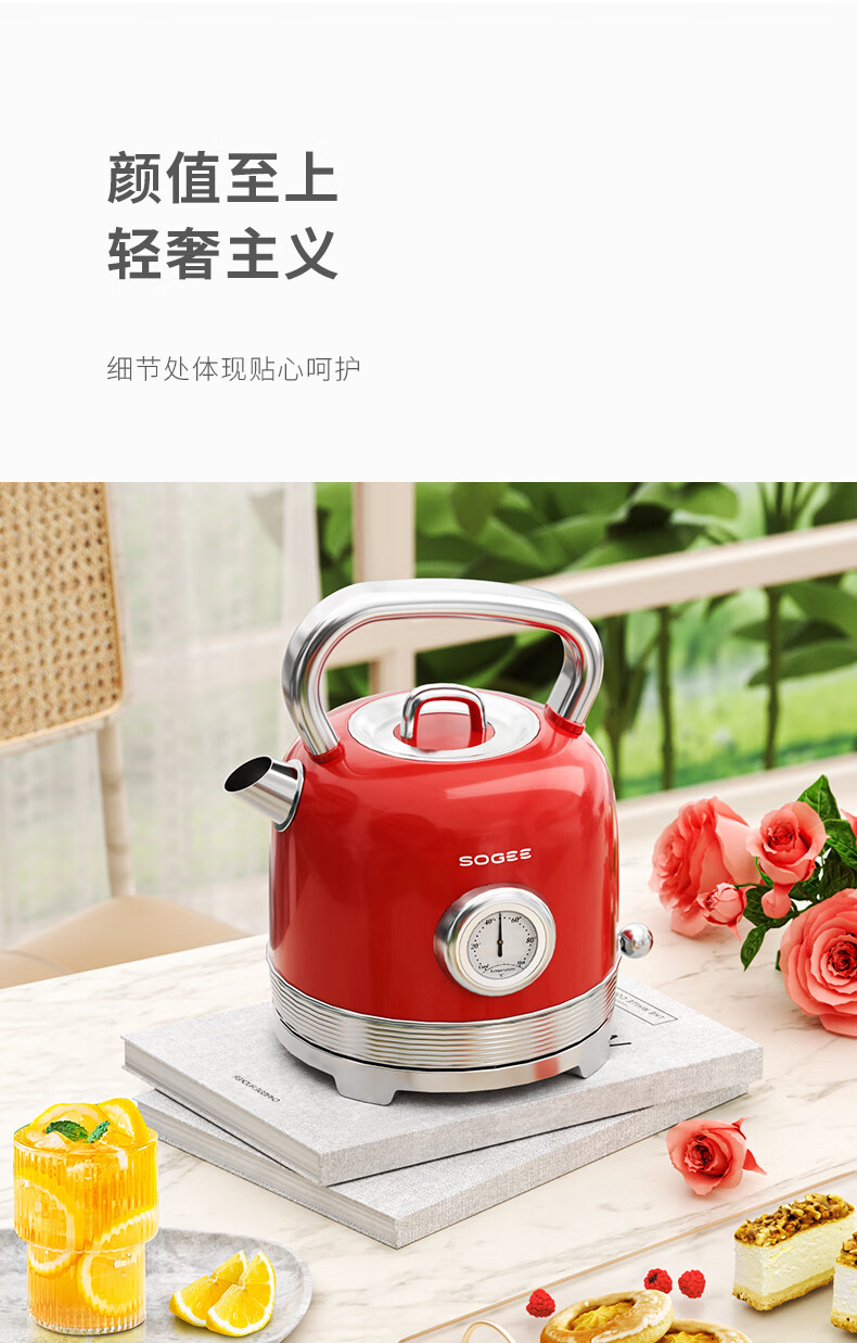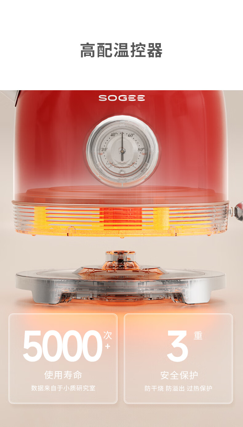 造型复古,时尚大气;外置精准温度器,水温一目了然;双重防干烧保护