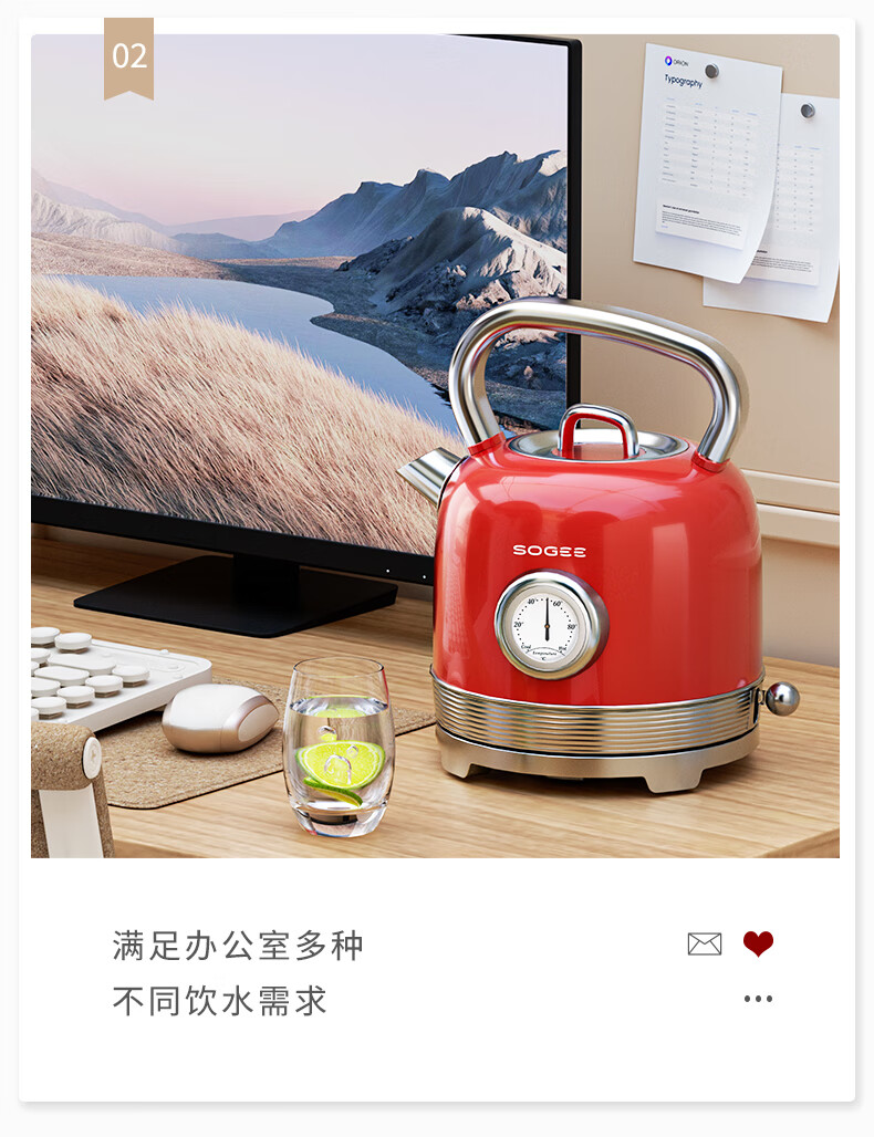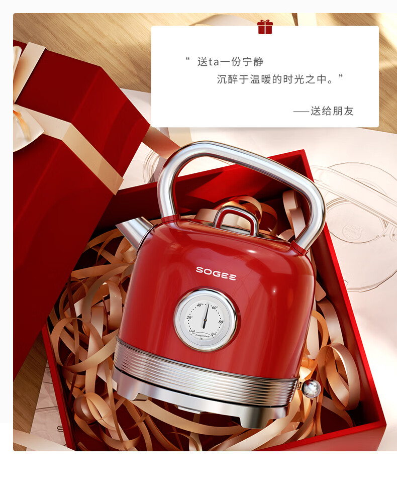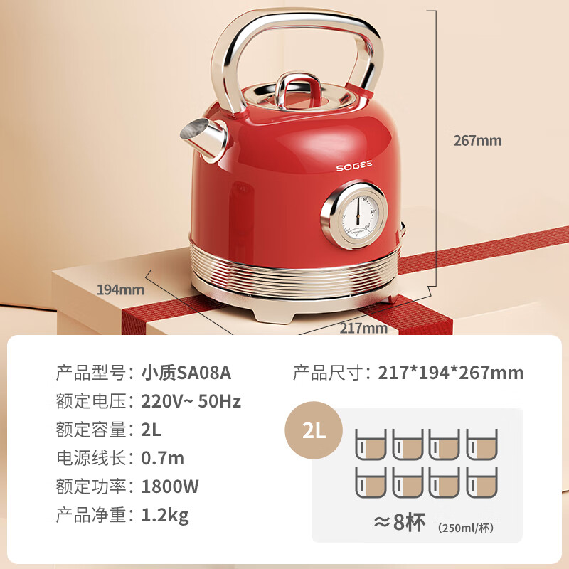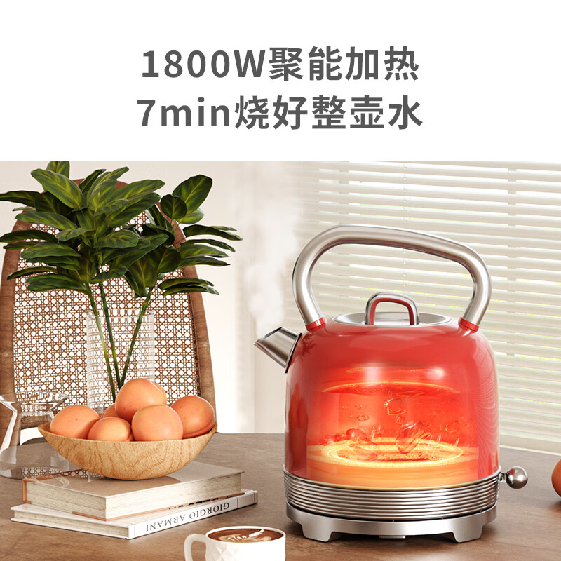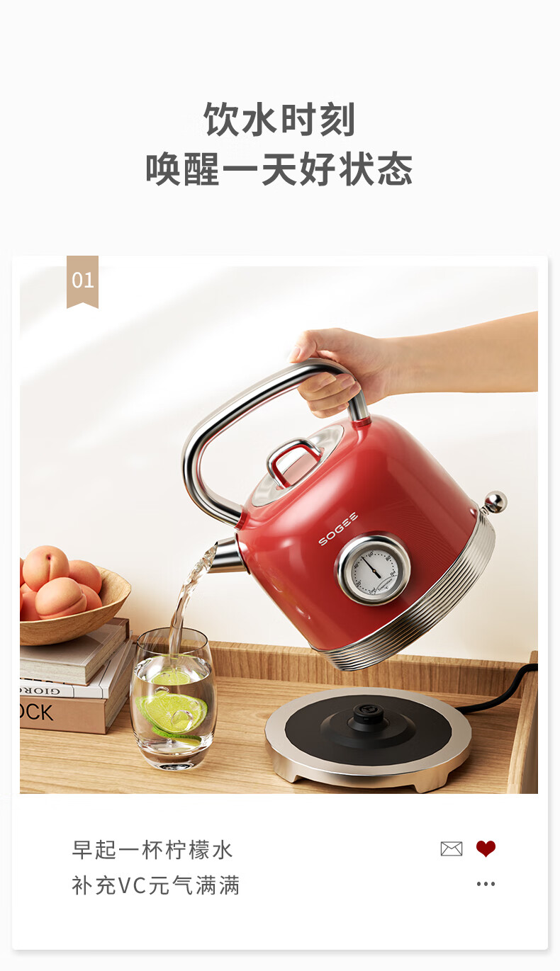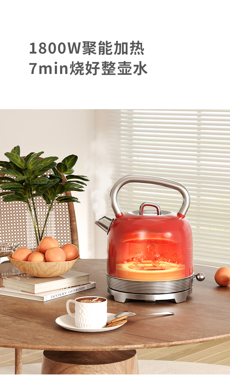 造型复古,时尚大气;外置精准温度器,水温一目了然;双重防干烧保护