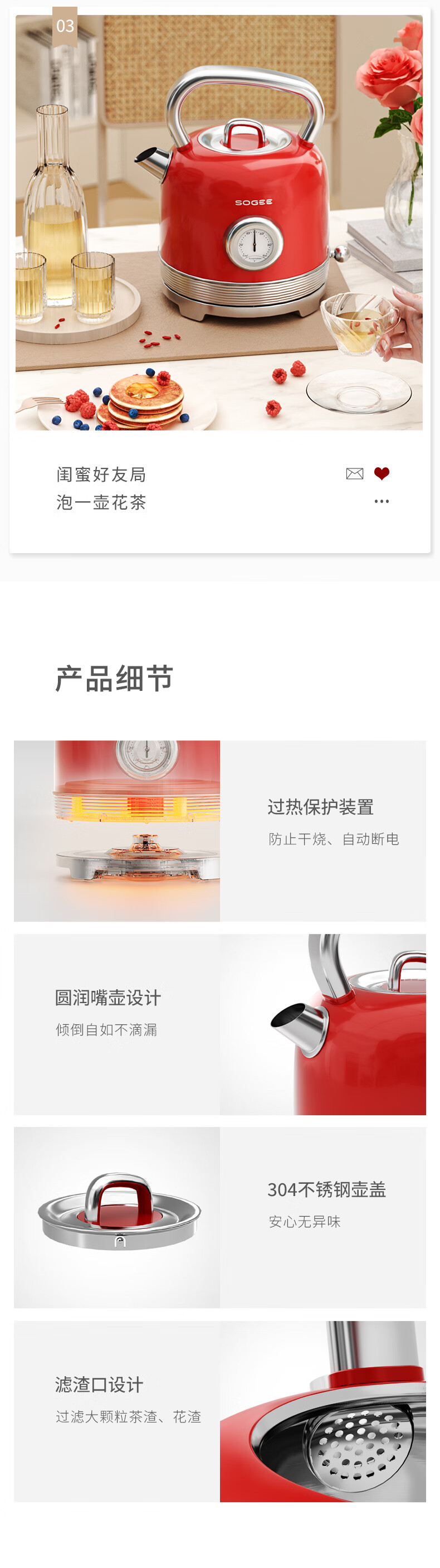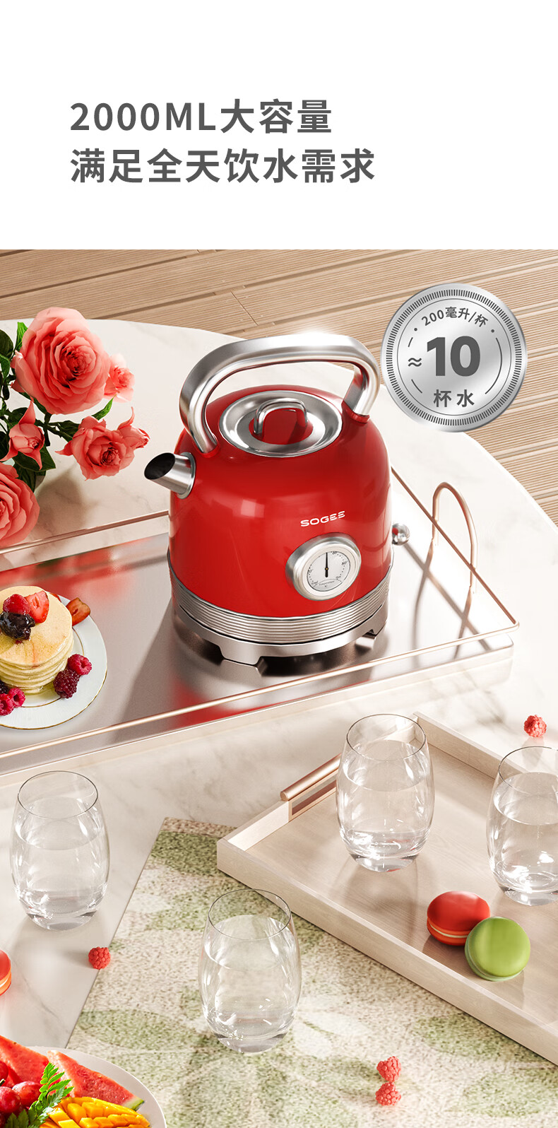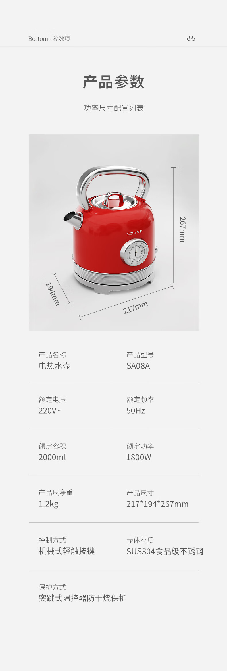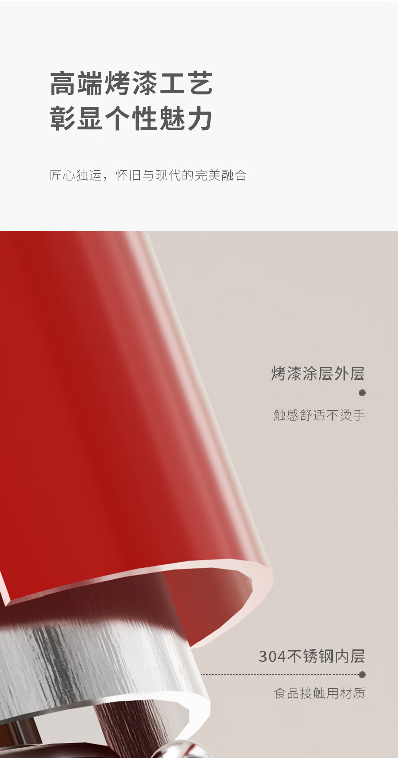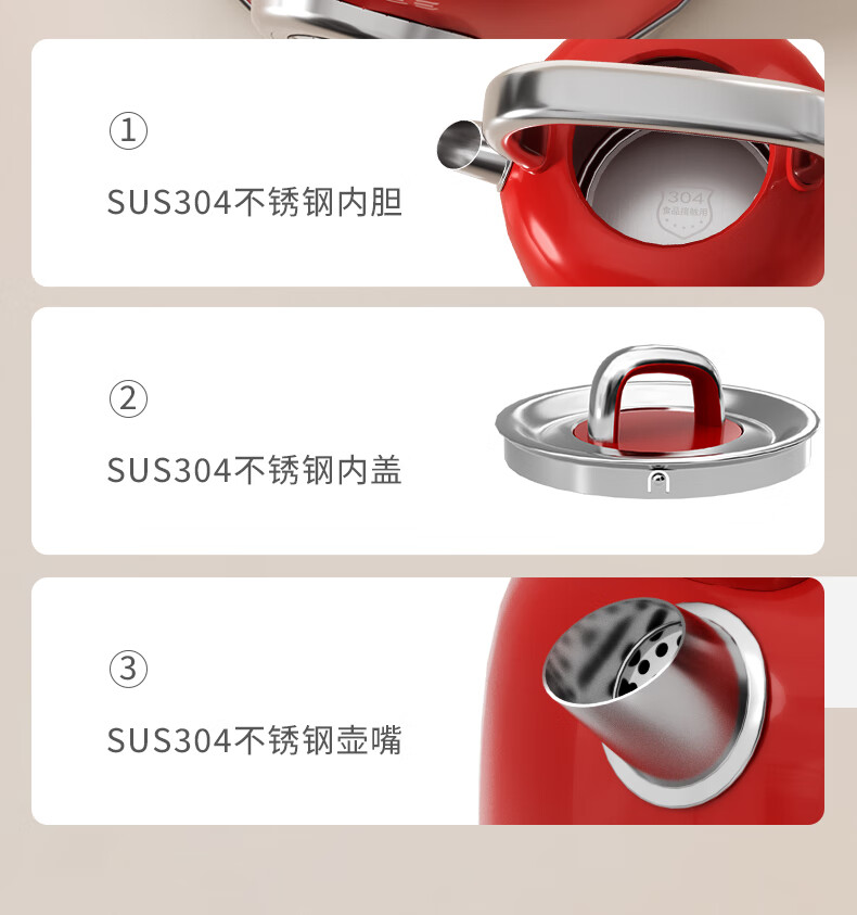 造型复古,时尚大气;外置精准温度器,水温一目了然;双重防干烧保护