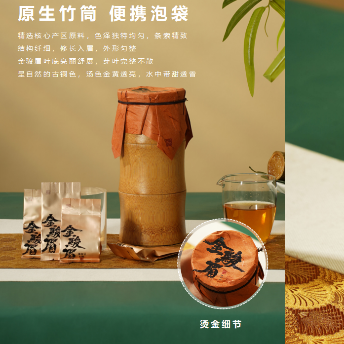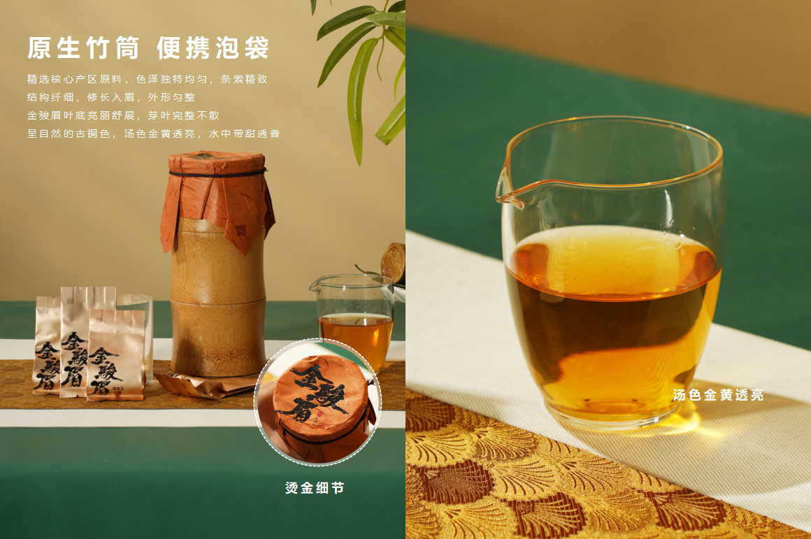 精选竹筒粽,竹香与粽香的融合;金骏眉叶底亮丽舒展,芽叶完整不散;竹叶香插 太行崖柏香