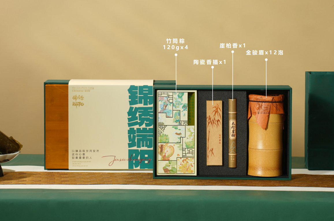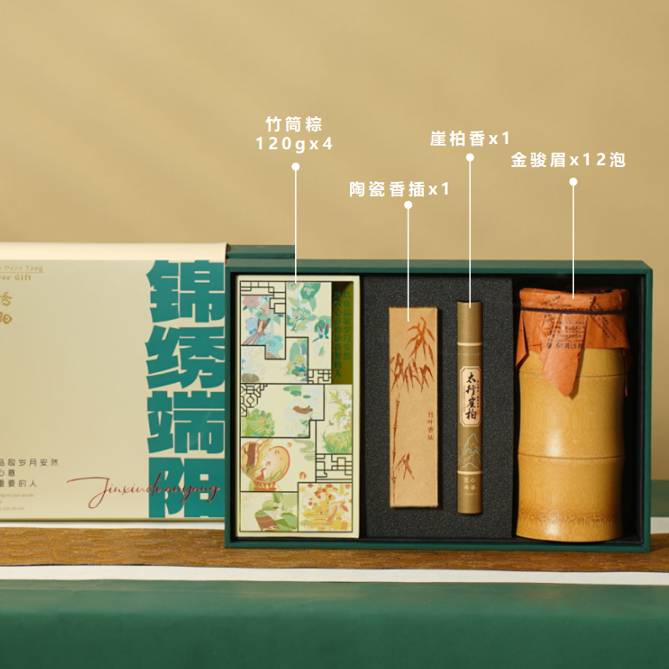 配置清单:竹筒粽120gx4(蛋黄牛肉粽x1、相思红豆粽x1、鲜肉粽x1、紫糯黑米粽x1) 太行崖柏x1,陶瓷香插x1,金骏眉x1(5gx12泡),多功能竹盖x1,手提袋x1