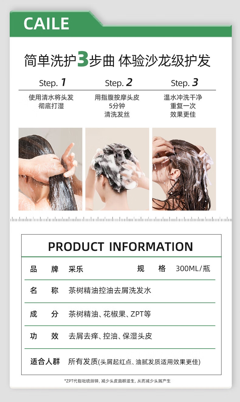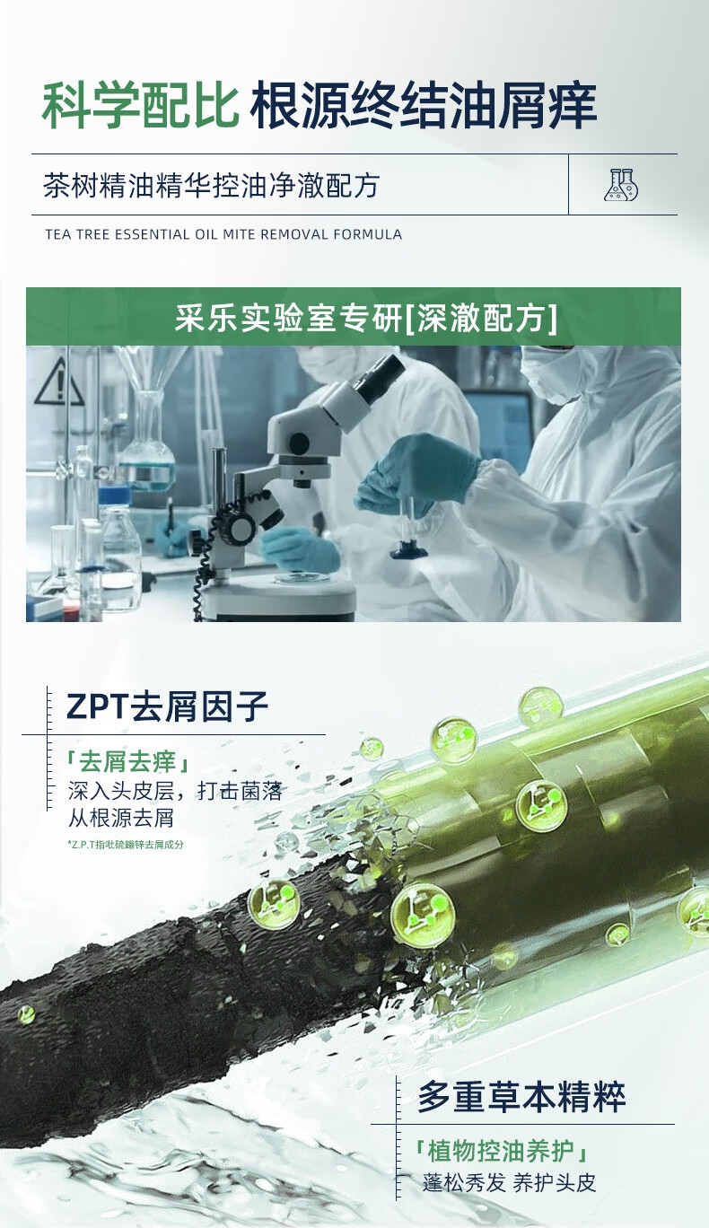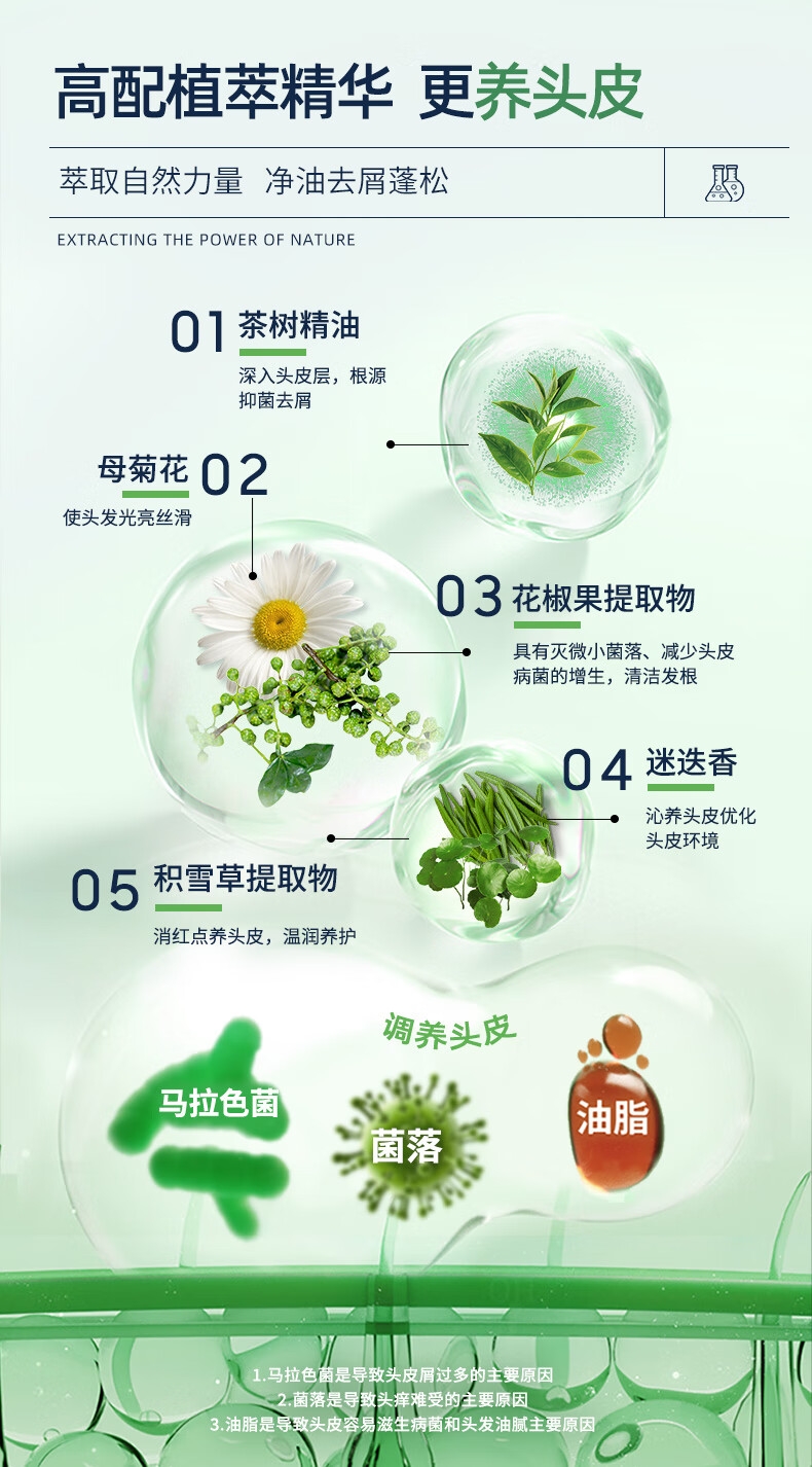 茶树精油,植萃修润,温润控油,净肤不油腻;专研ZPT去屑止痒配方,减少菌落滋生;柔润肌肤减少干燥,清新茶树香气不发腻