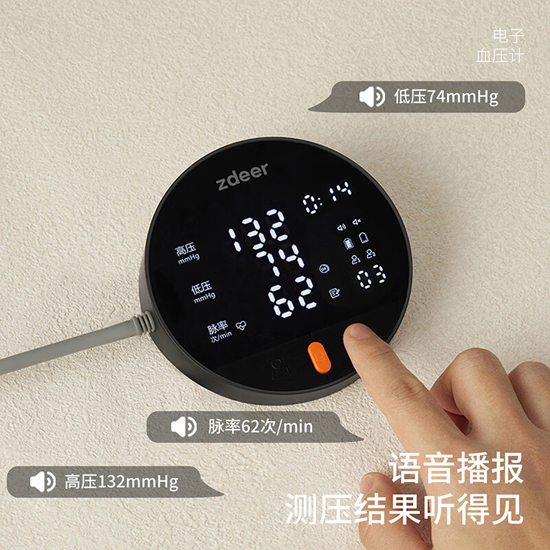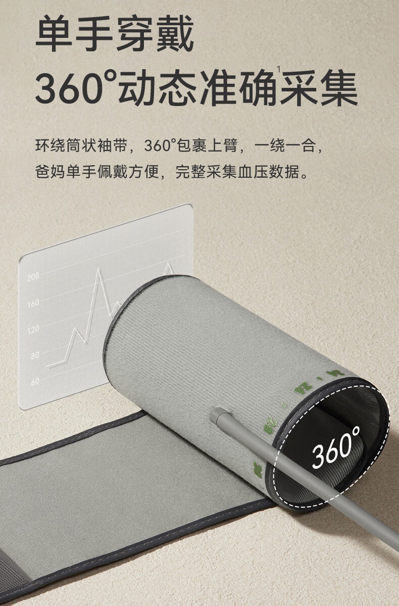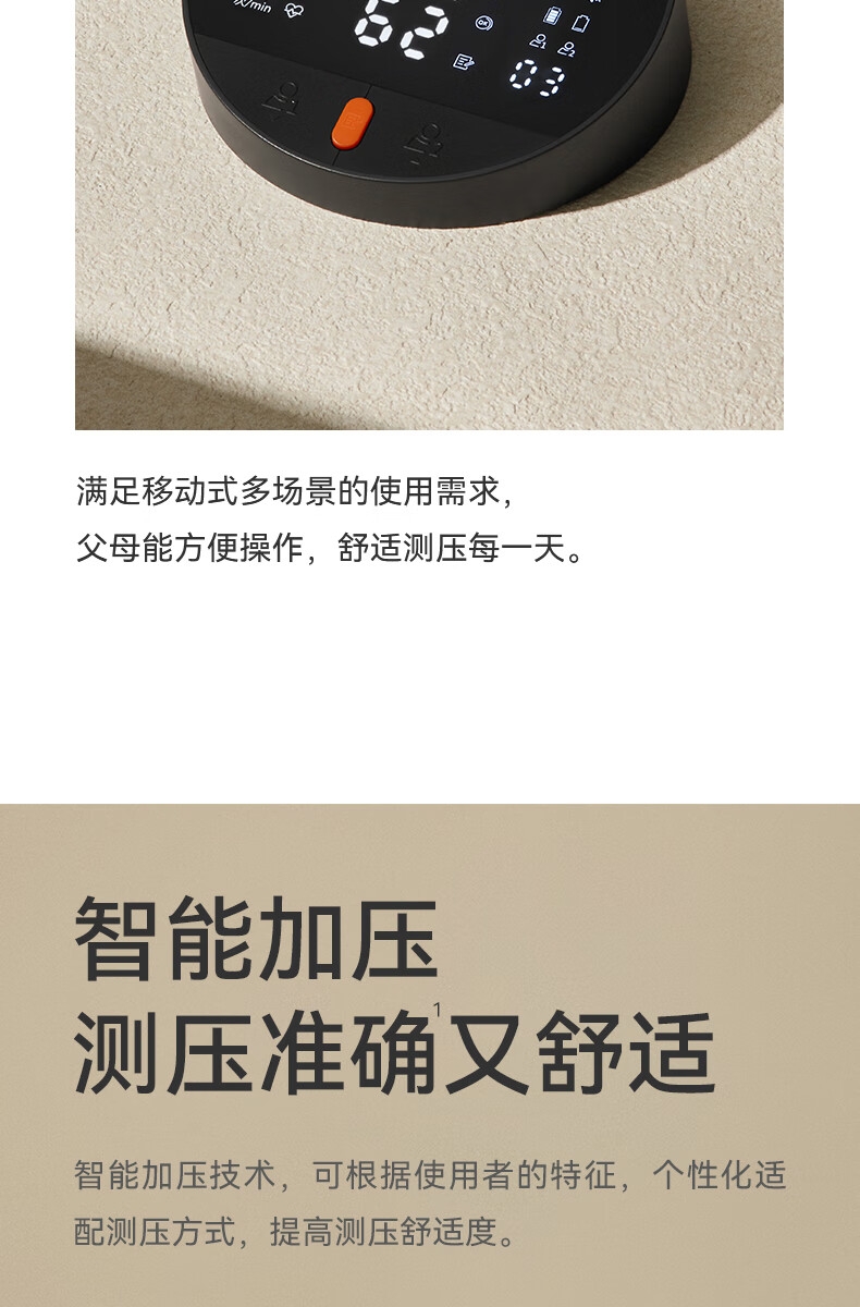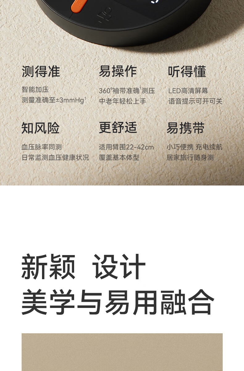 360°袖带准确'测压中老年轻松上手;适用臂围22-42cm 覆盖基本体型;LED高清屏幕 语音提示可开可关