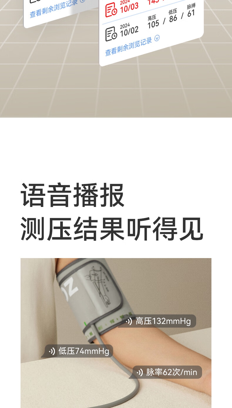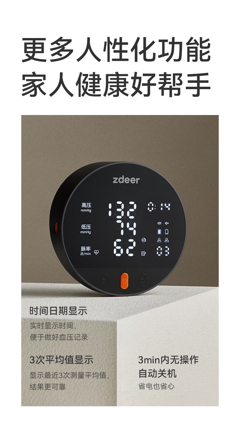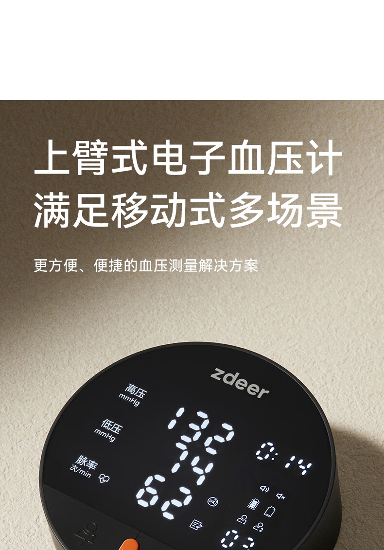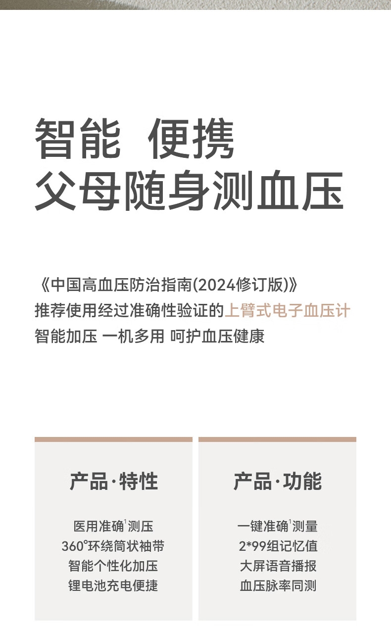 360°袖带准确'测压中老年轻松上手;适用臂围22-42cm 覆盖基本体型;LED高清屏幕 语音提示可开可关