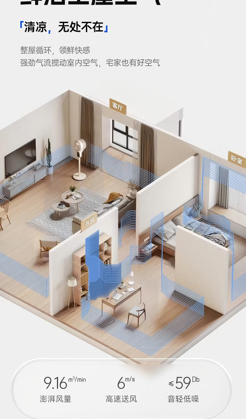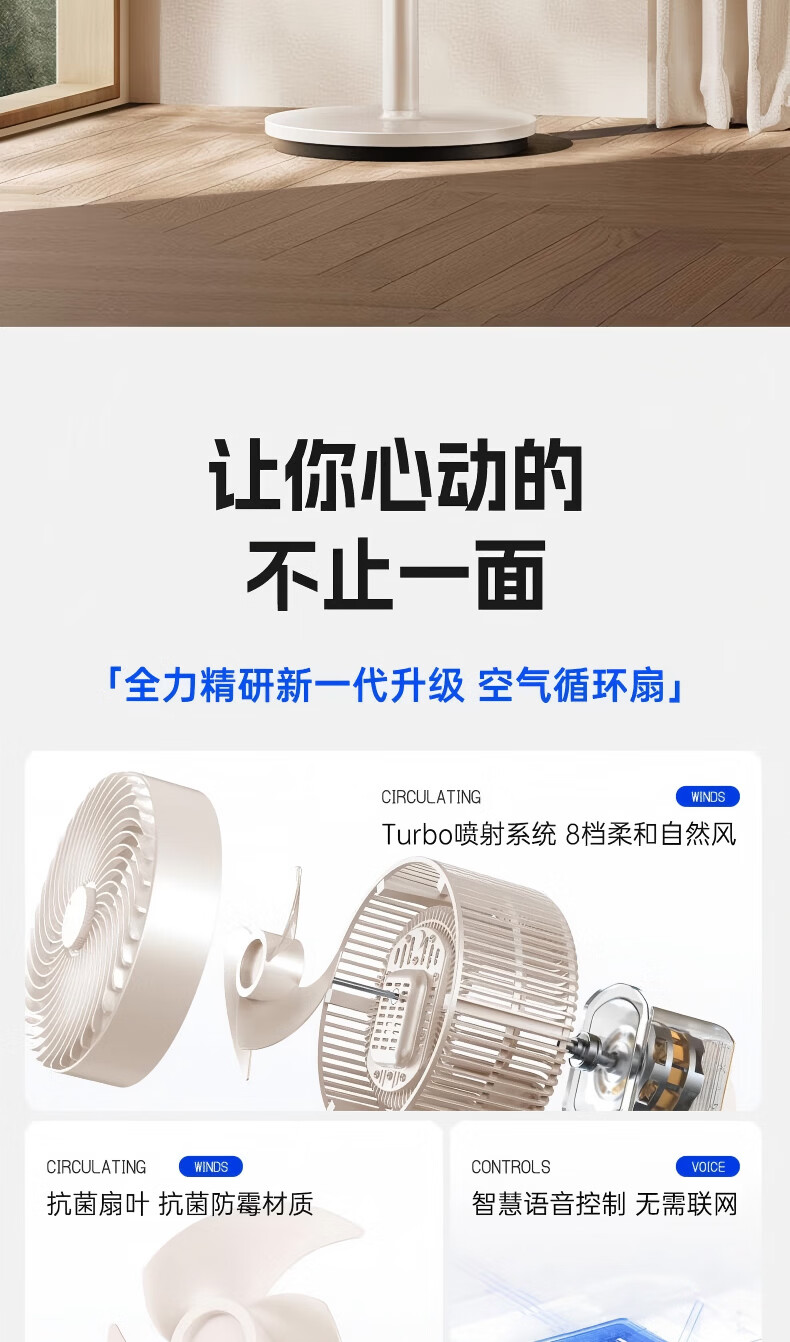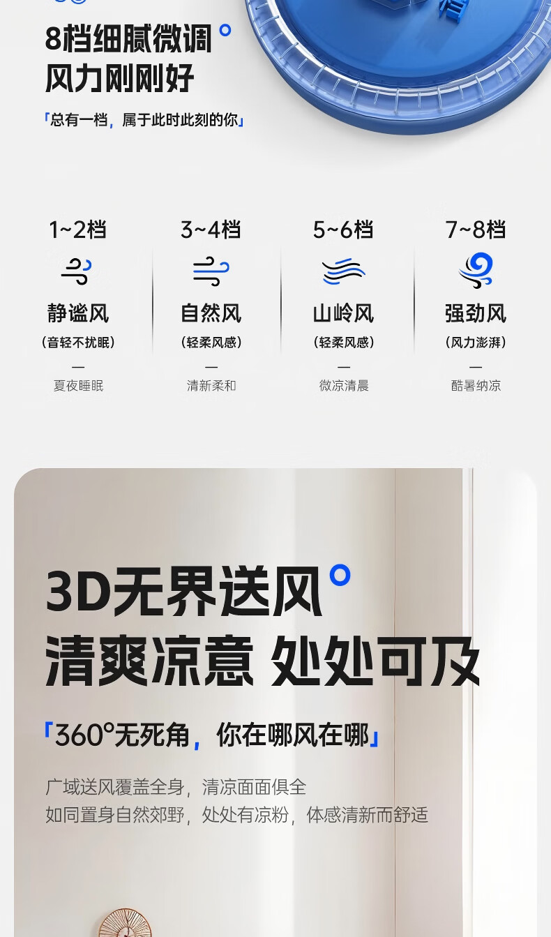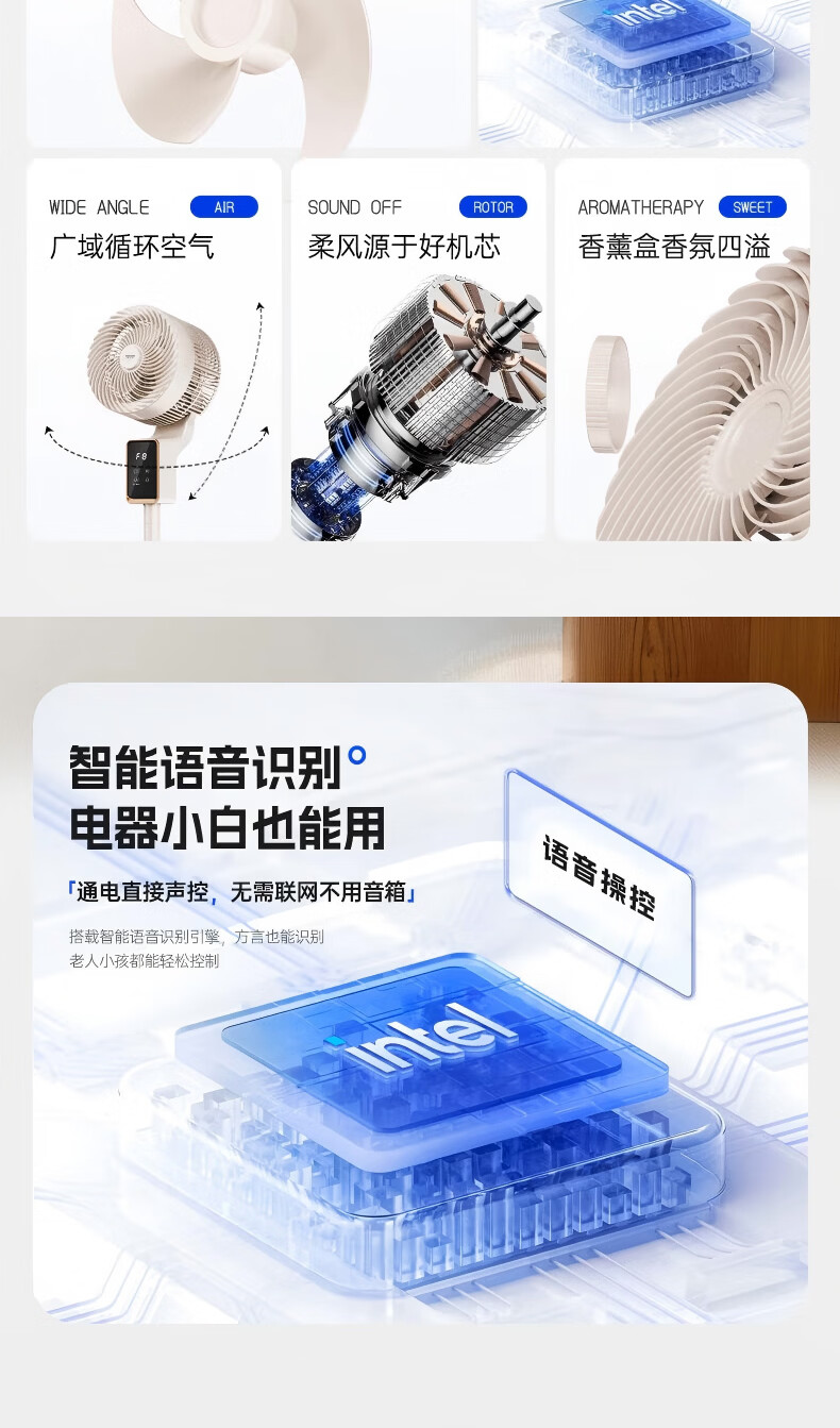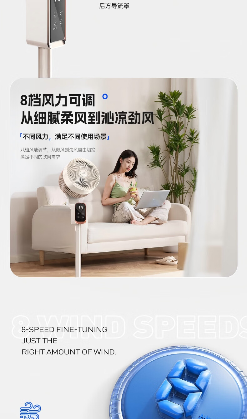 智慧语音控制。舒爽柔风一呼即应;舒柔自然风感,久吹不头疼;8档风力可调,从细腻柔风到沁凉劲风