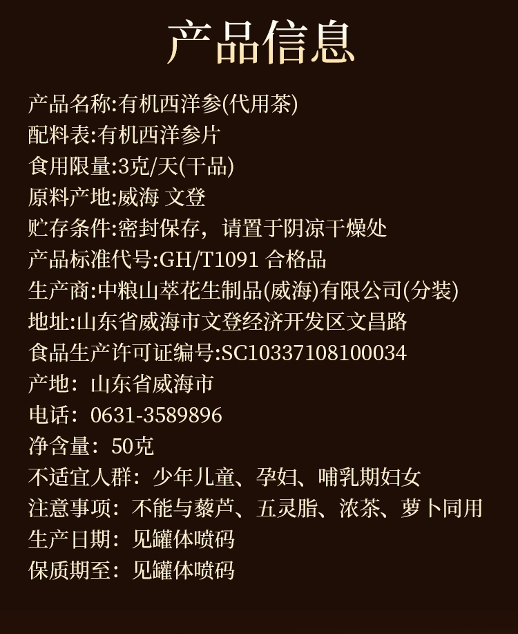配置清单:净含量:100g 中粮山萃有机西洋参50g*2