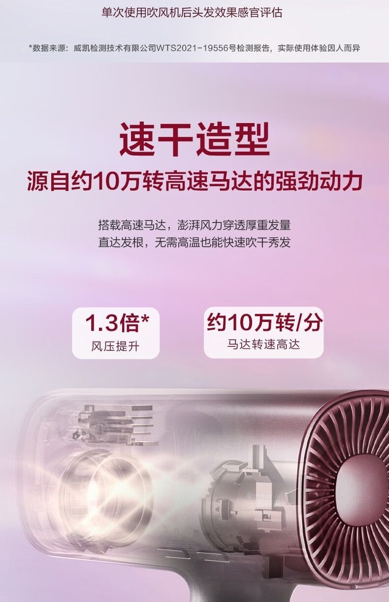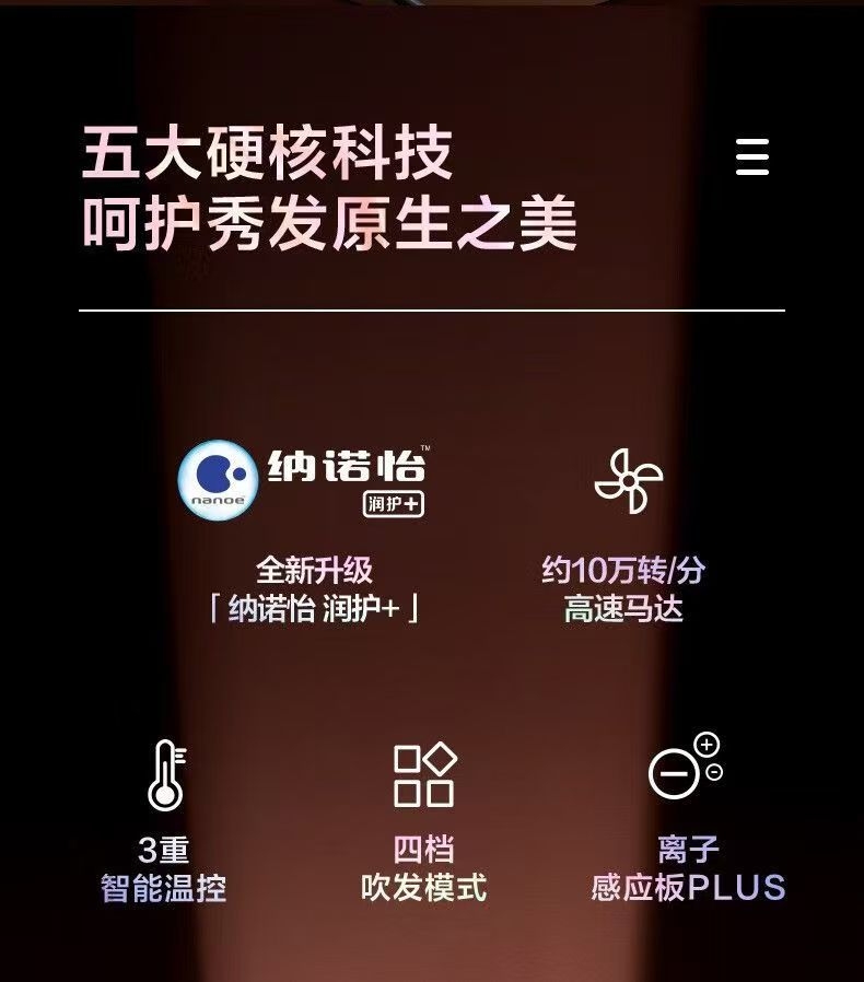 简化外观设计,搭配渐变色彩,赋予视觉一份美好的体验;风力集中,轻松造型;进风口细密滤网设计,有效防止头发卷入