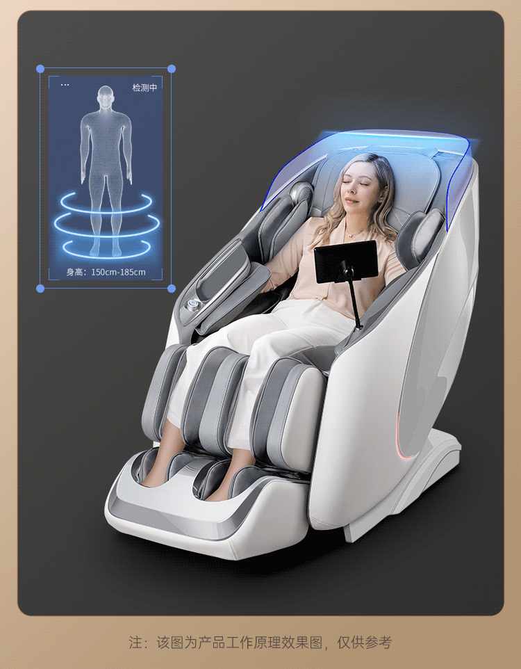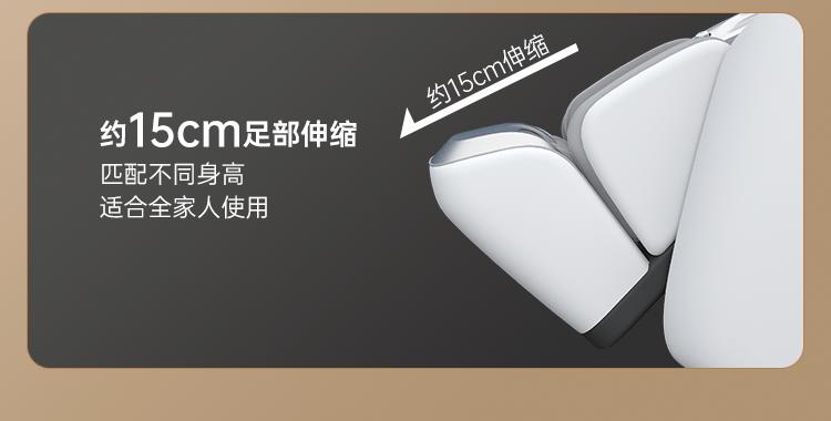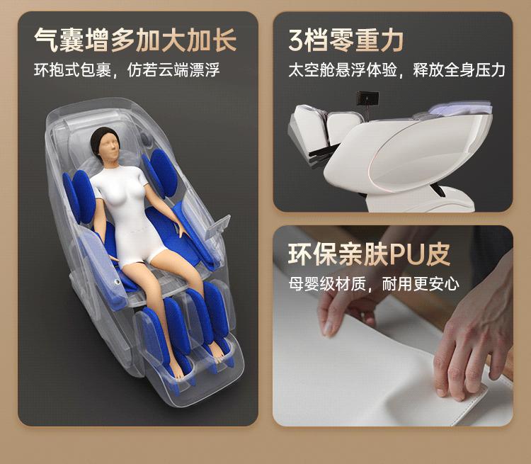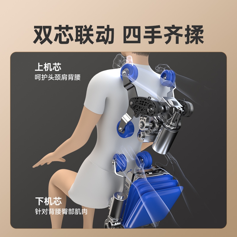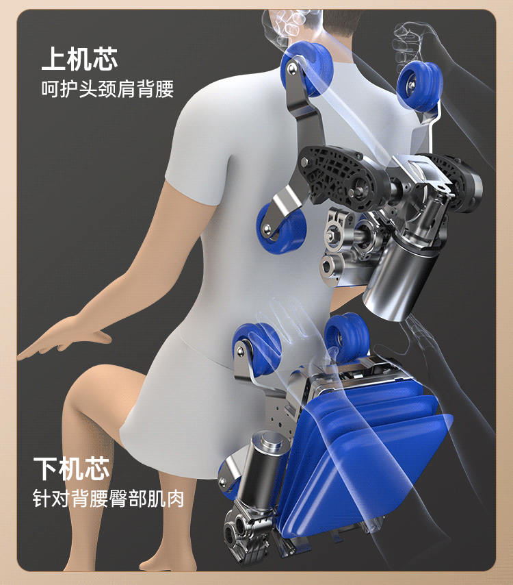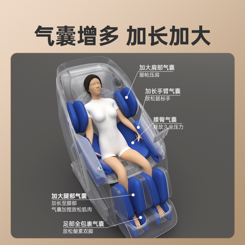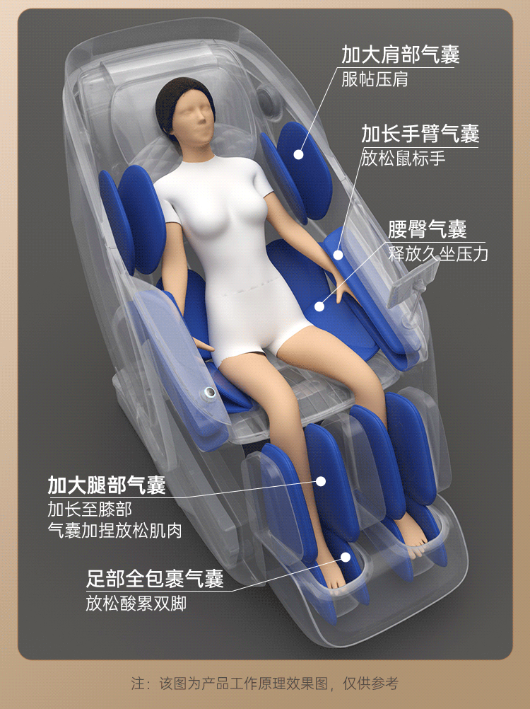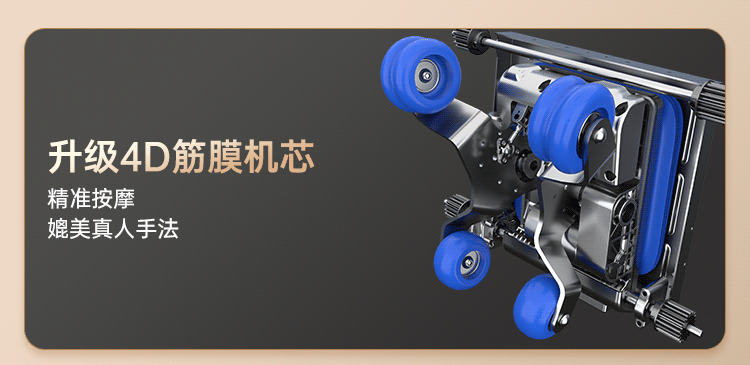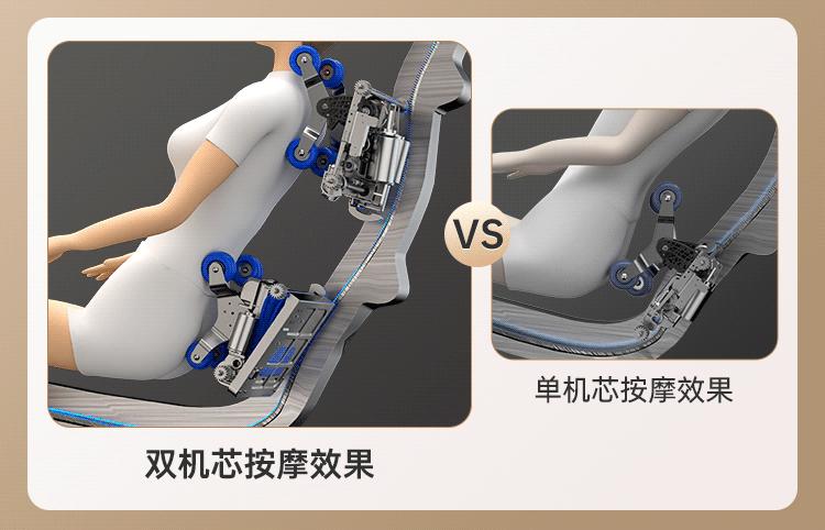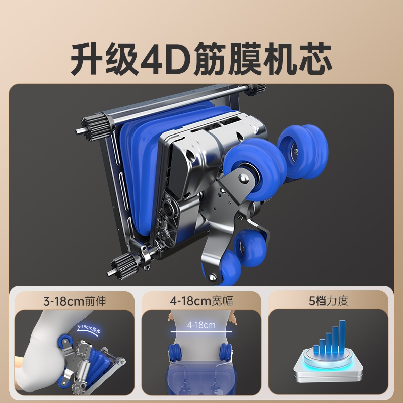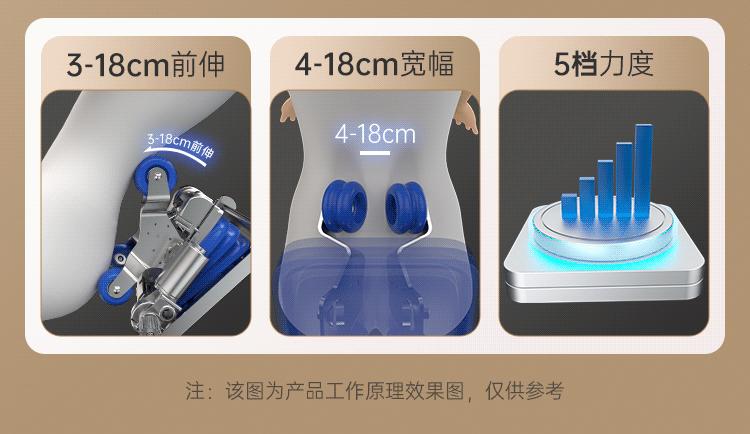 3D上机芯+4D气悬下机芯双芯同按;下机芯5档强度可调8cm前伸,5档速度可调,4-1;加高小腿气囊按摩,足底滚轮刮痧;