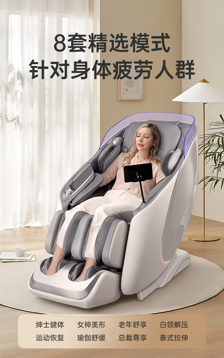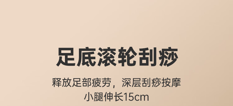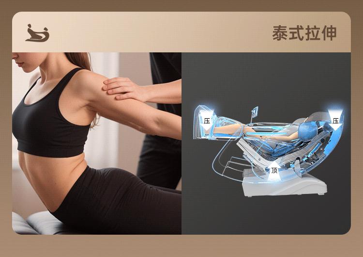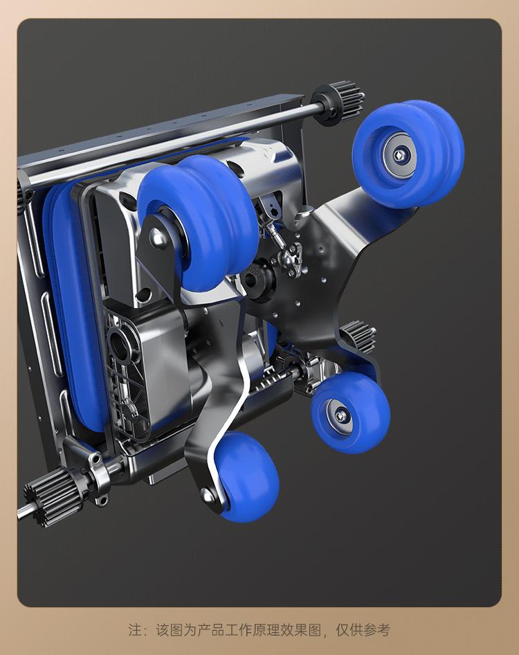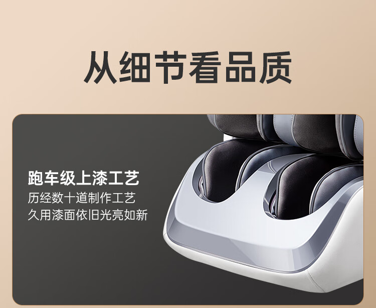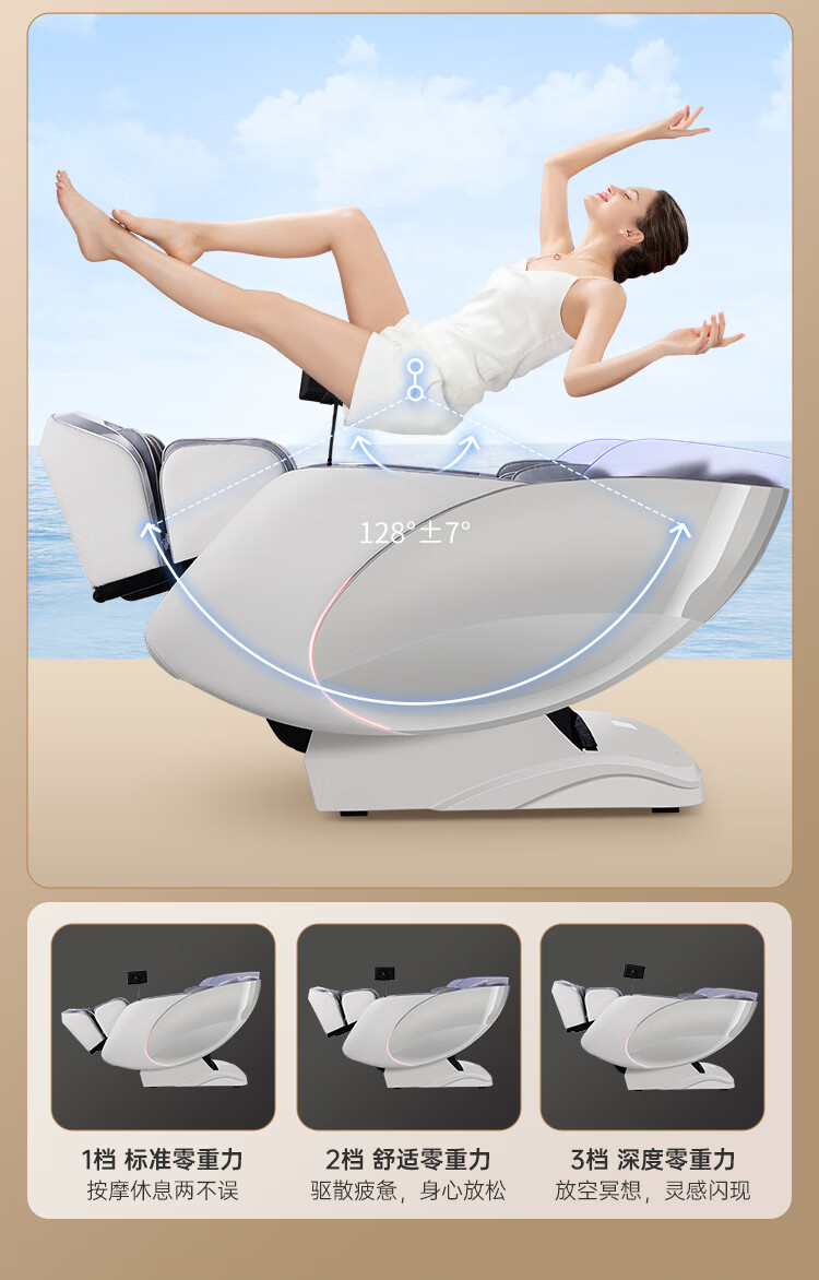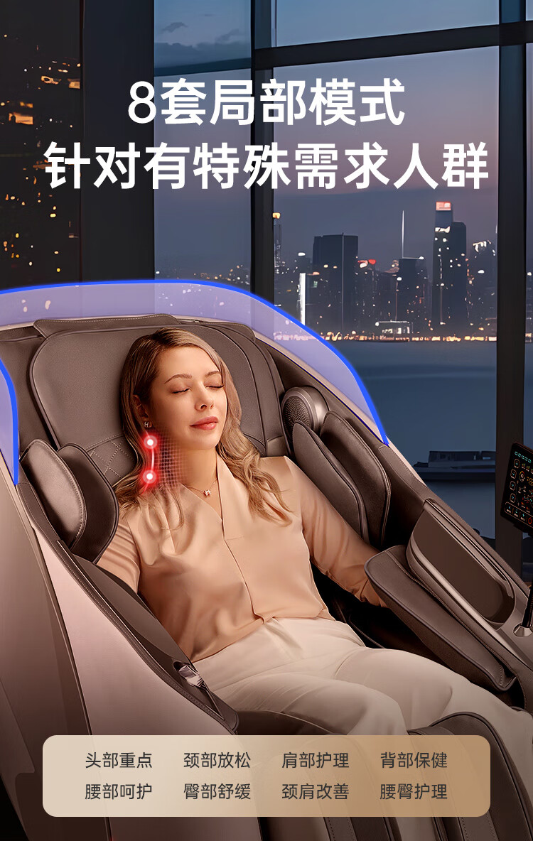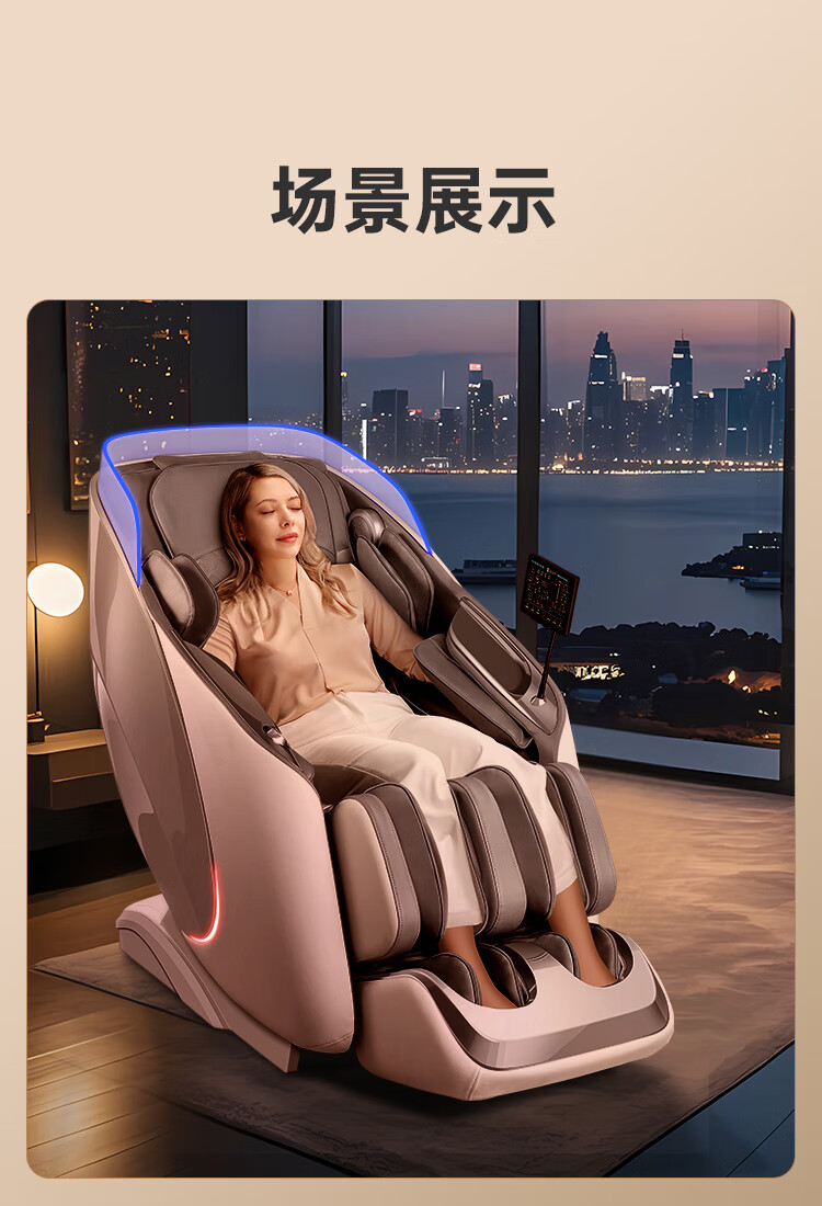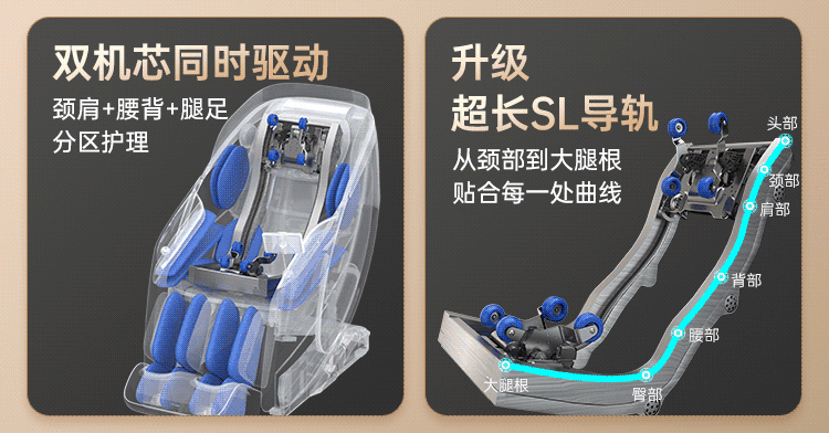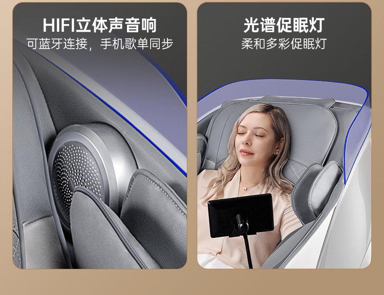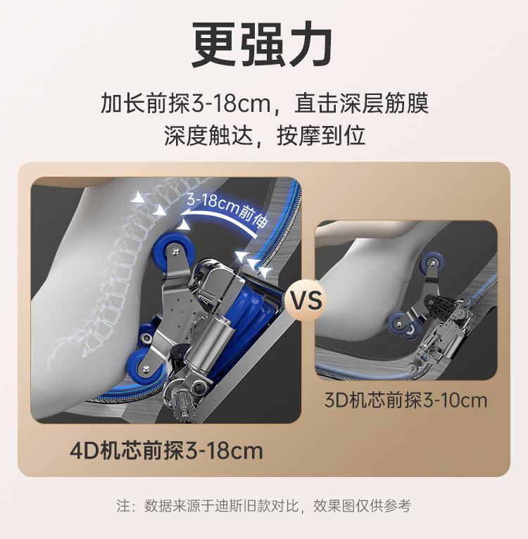 3D上机芯+4D气悬下机芯双芯同按;下机芯5档强度可调8cm前伸,5档速度可调,4-1;加高小腿气囊按摩,足底滚轮刮痧;