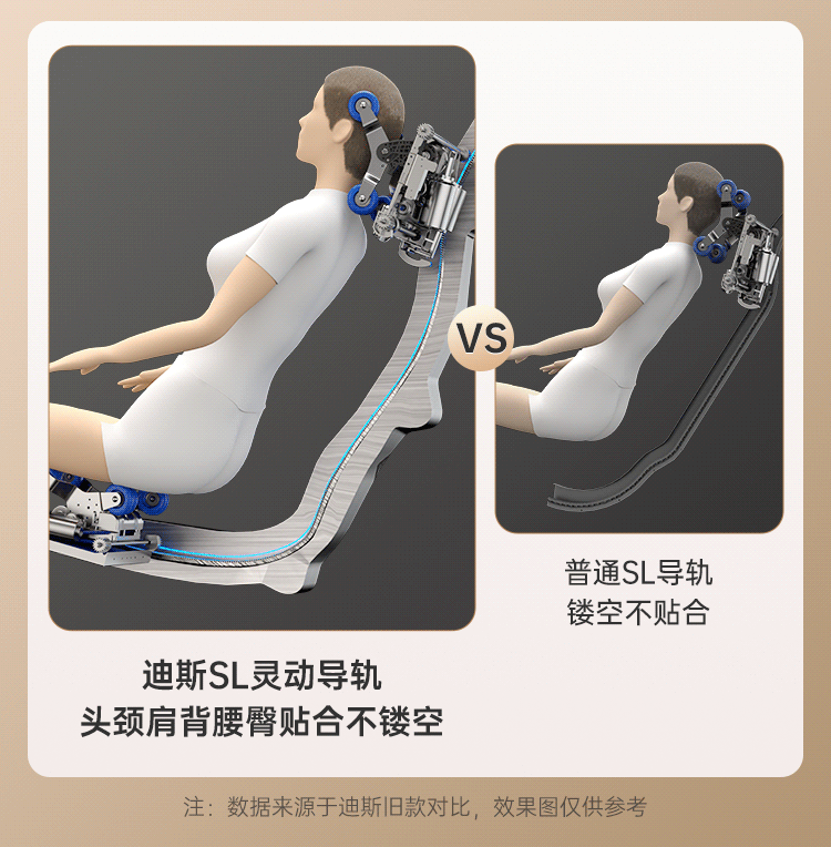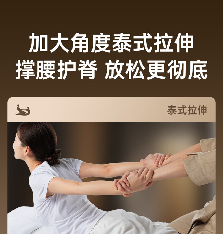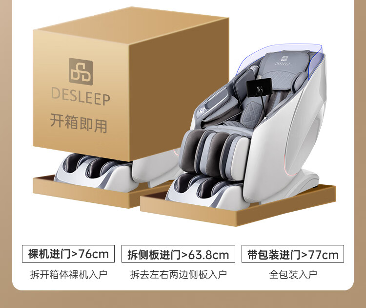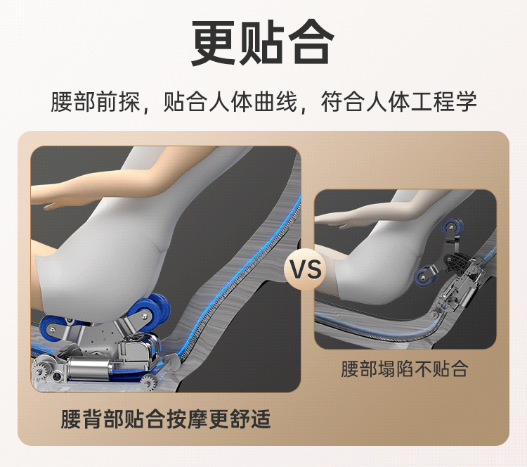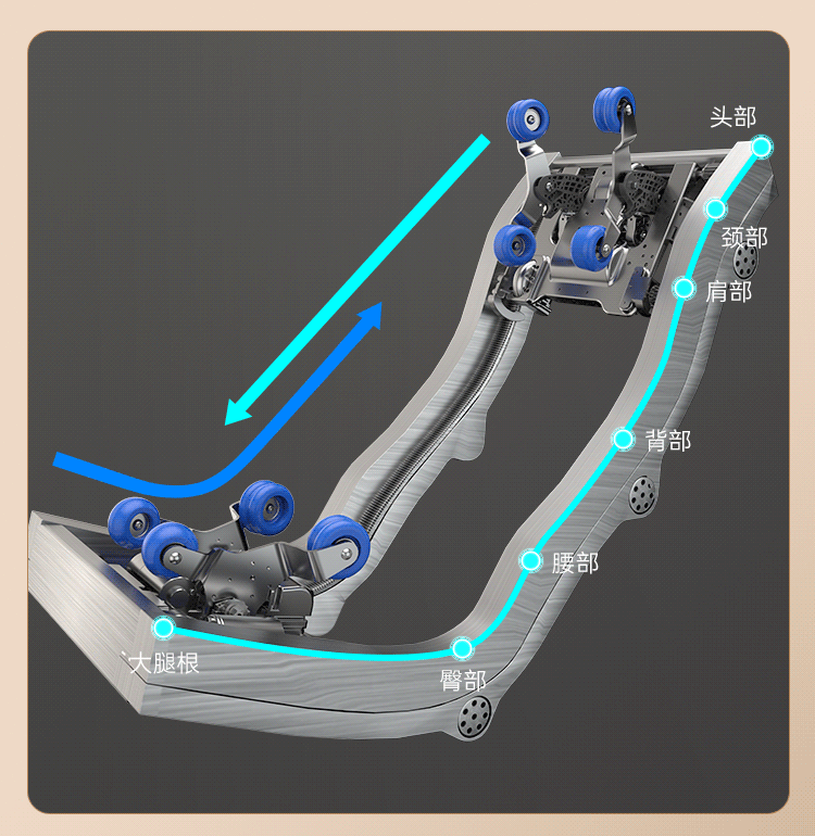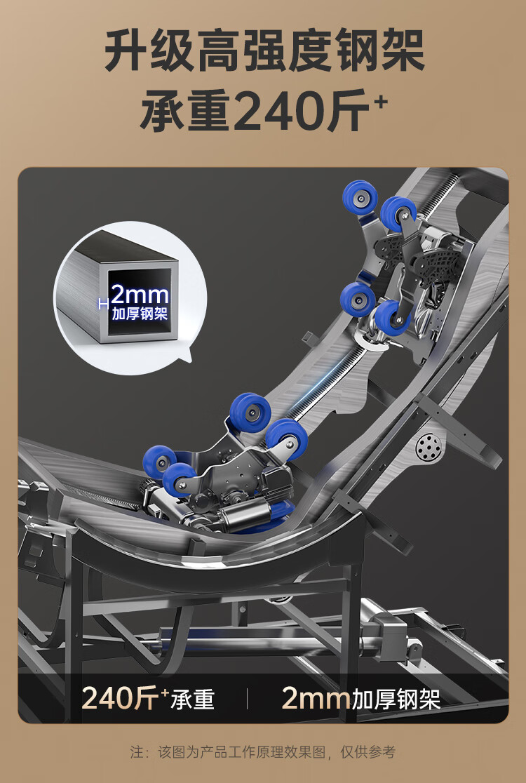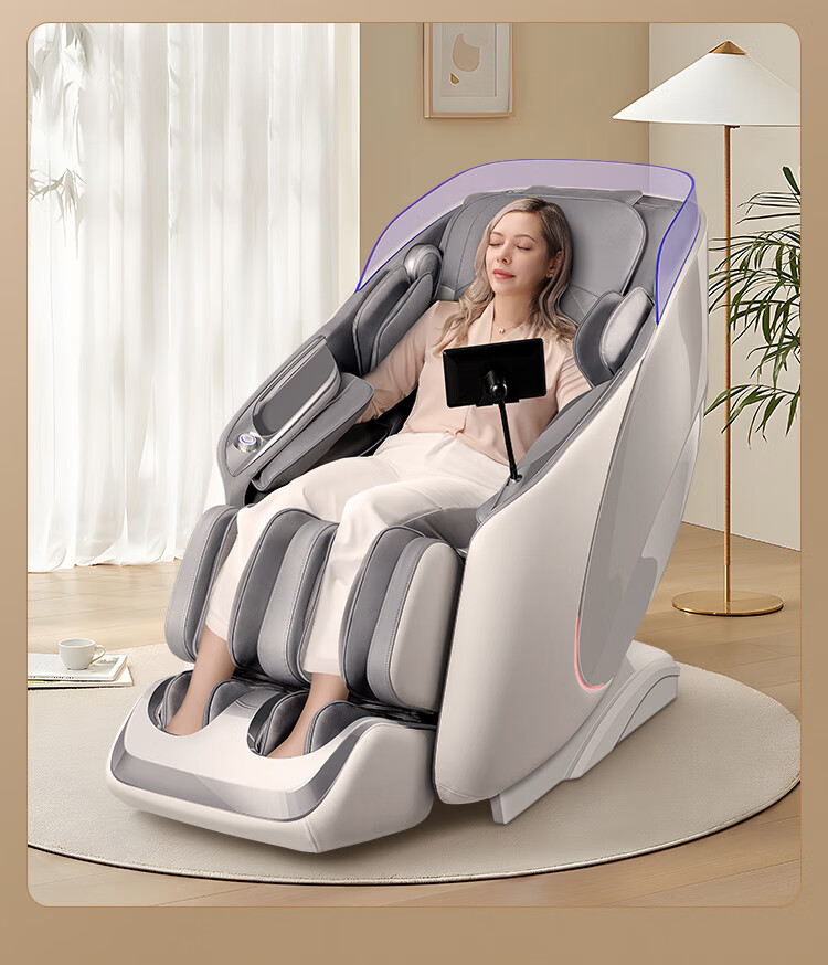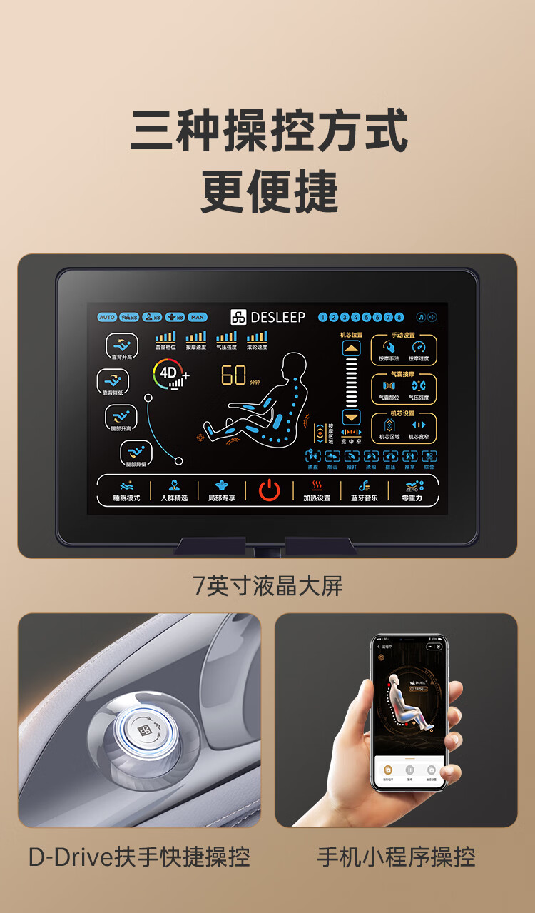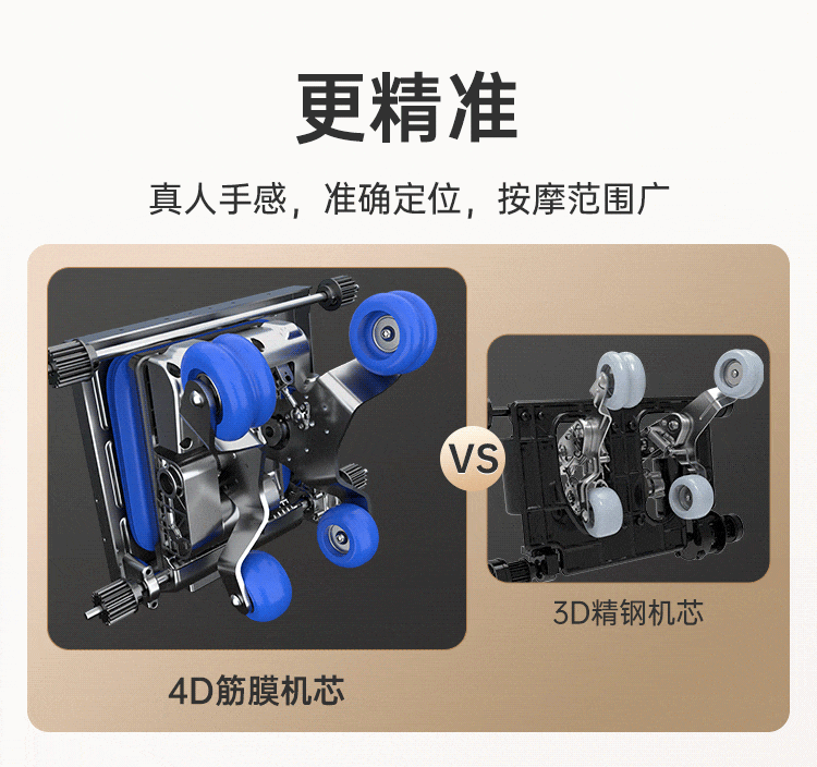 3D上机芯+4D气悬下机芯双芯同按;下机芯5档强度可调8cm前伸,5档速度可调,4-1;加高小腿气囊按摩,足底滚轮刮痧;