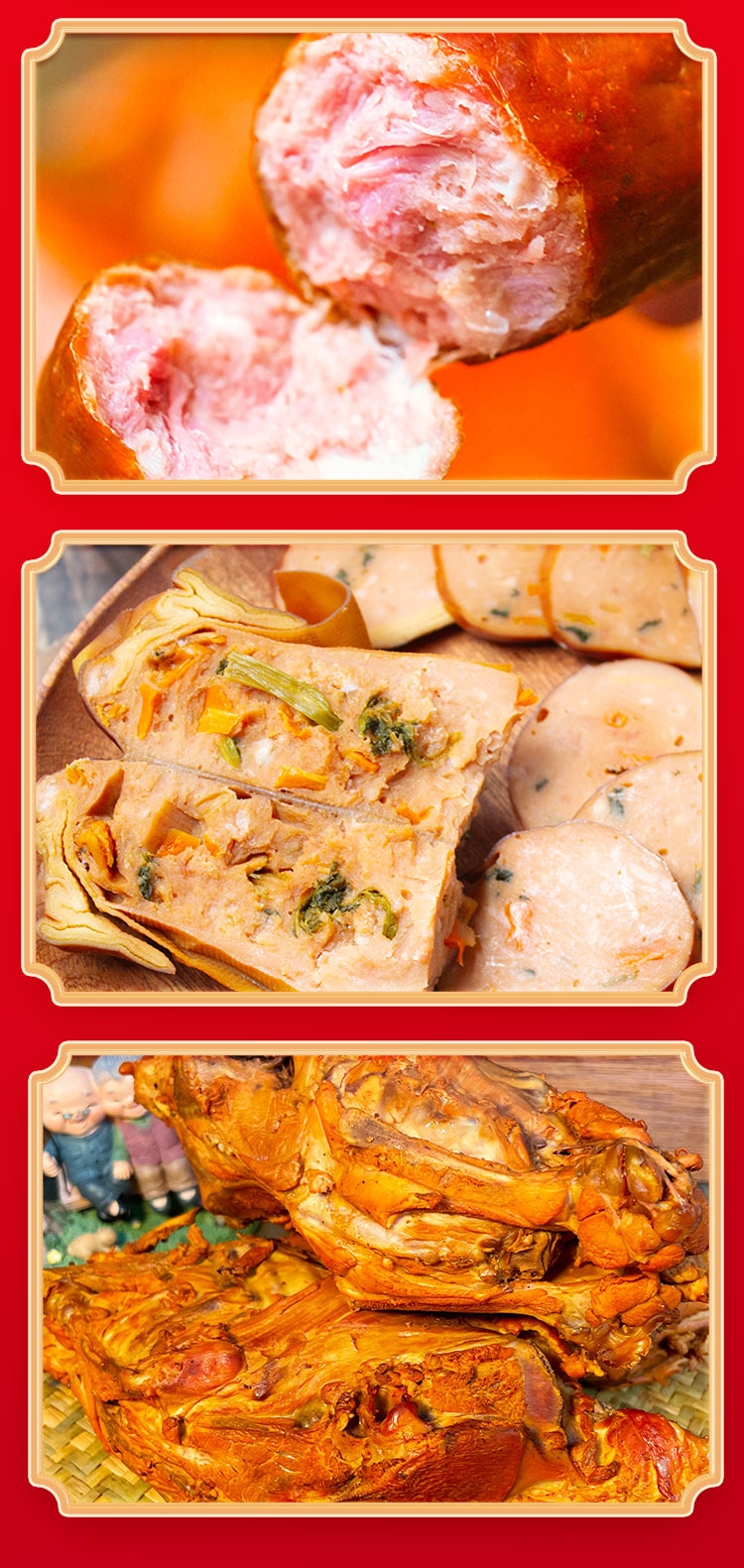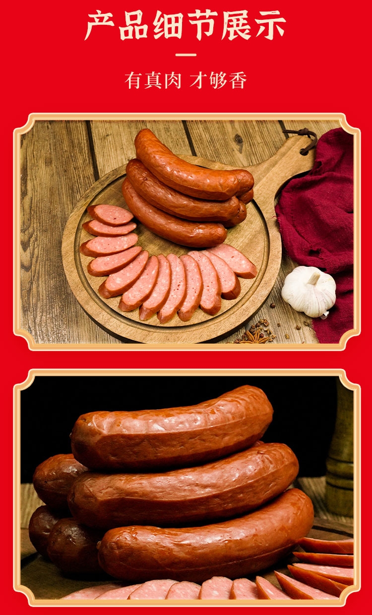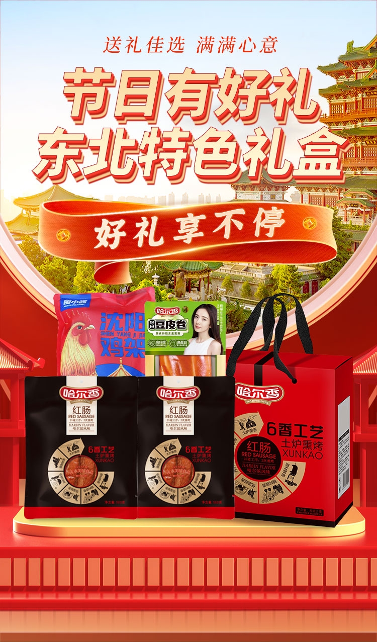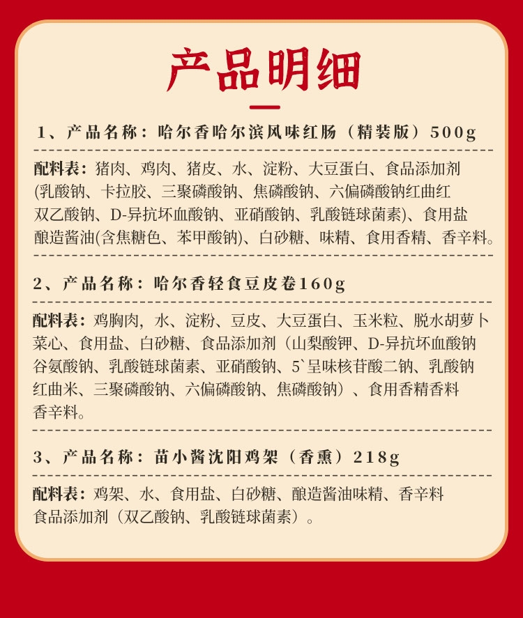 配置清单:哈尔香哈尔滨红肠(精装版)500g*2 哈尔香轻食豆皮卷160g*1 苗小酱沈阳鸡架(香熏)218g*1