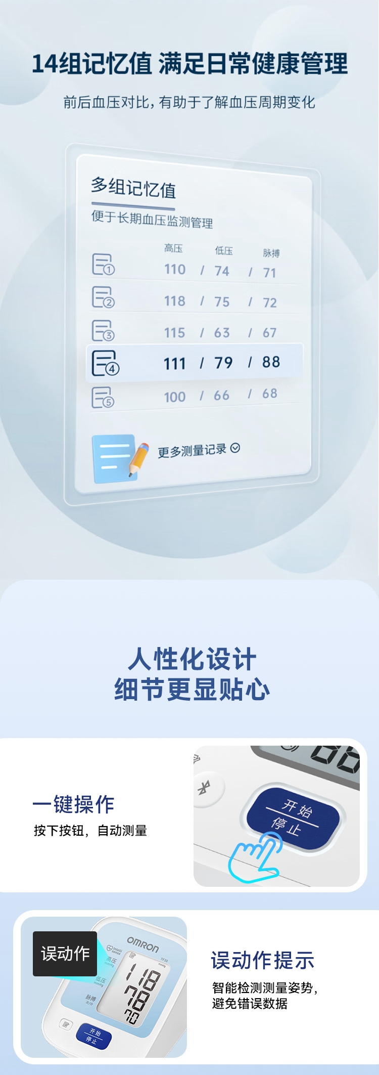 高清大屏;血压偏高警示;14次测量数值记忆