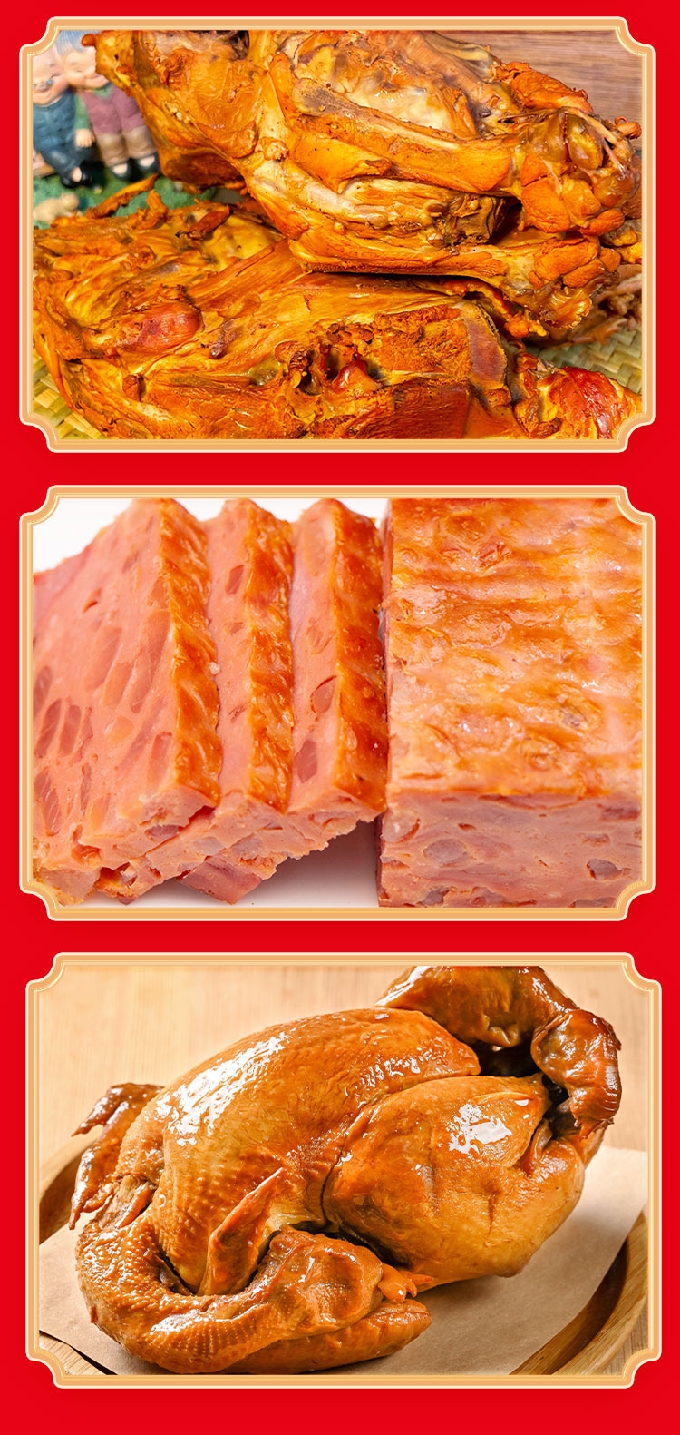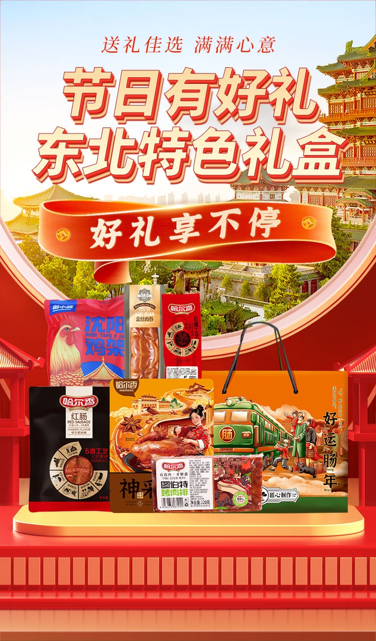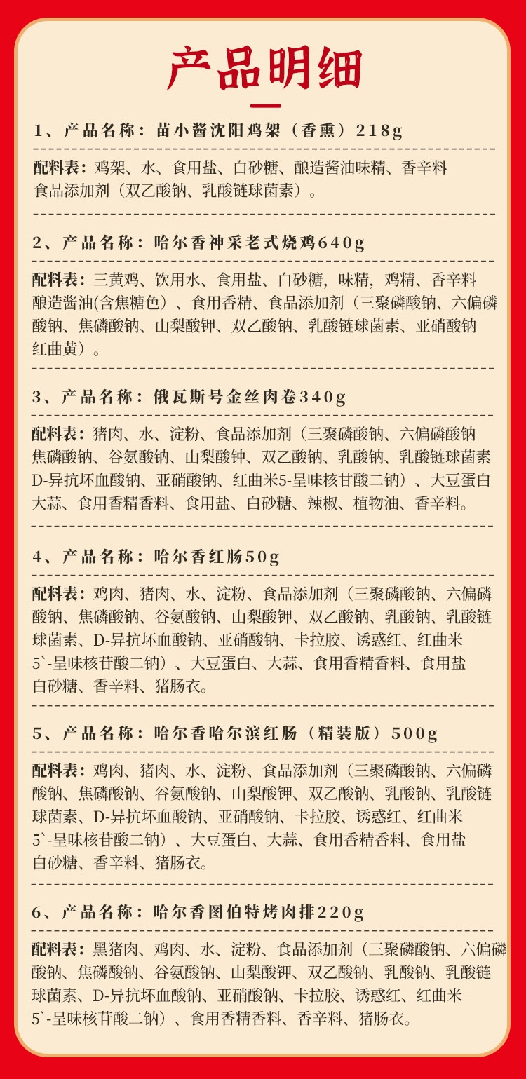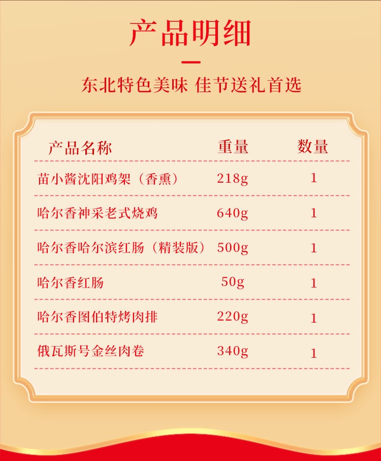配置清单:哈尔香哈尔滨红肠(精装版)500g*1 苗小酱沈阳鸡架(香熏)218g*1 哈尔香图伯特烤肉排220g*1 俄瓦斯号金丝肉卷340g*1 哈尔香红肠50g*1 哈尔香神采老式烧鸡640g*1