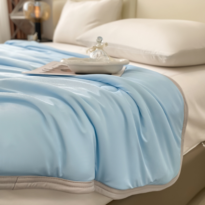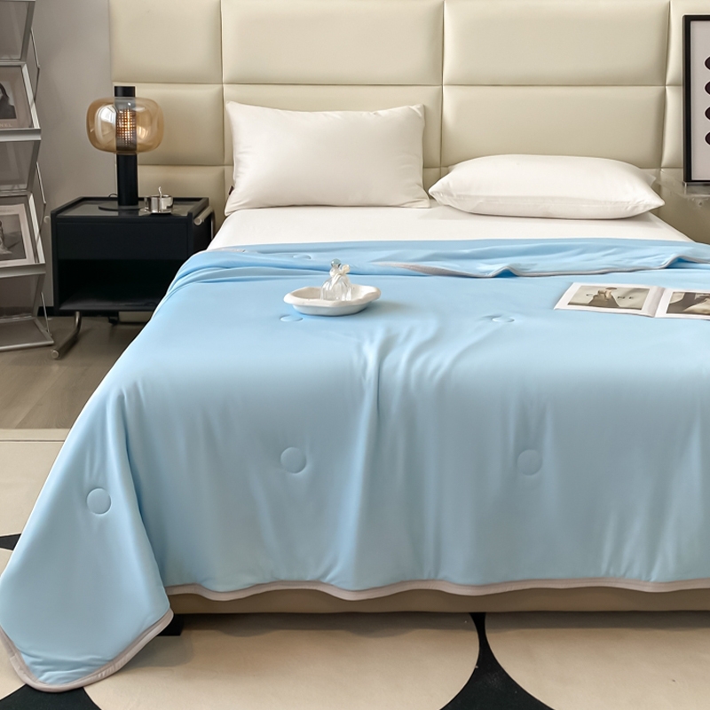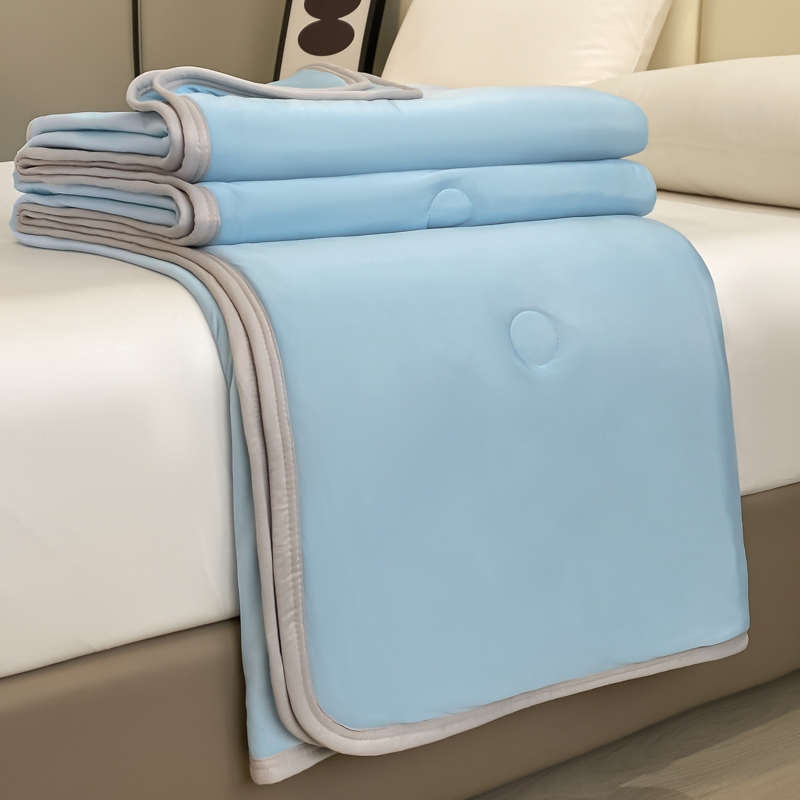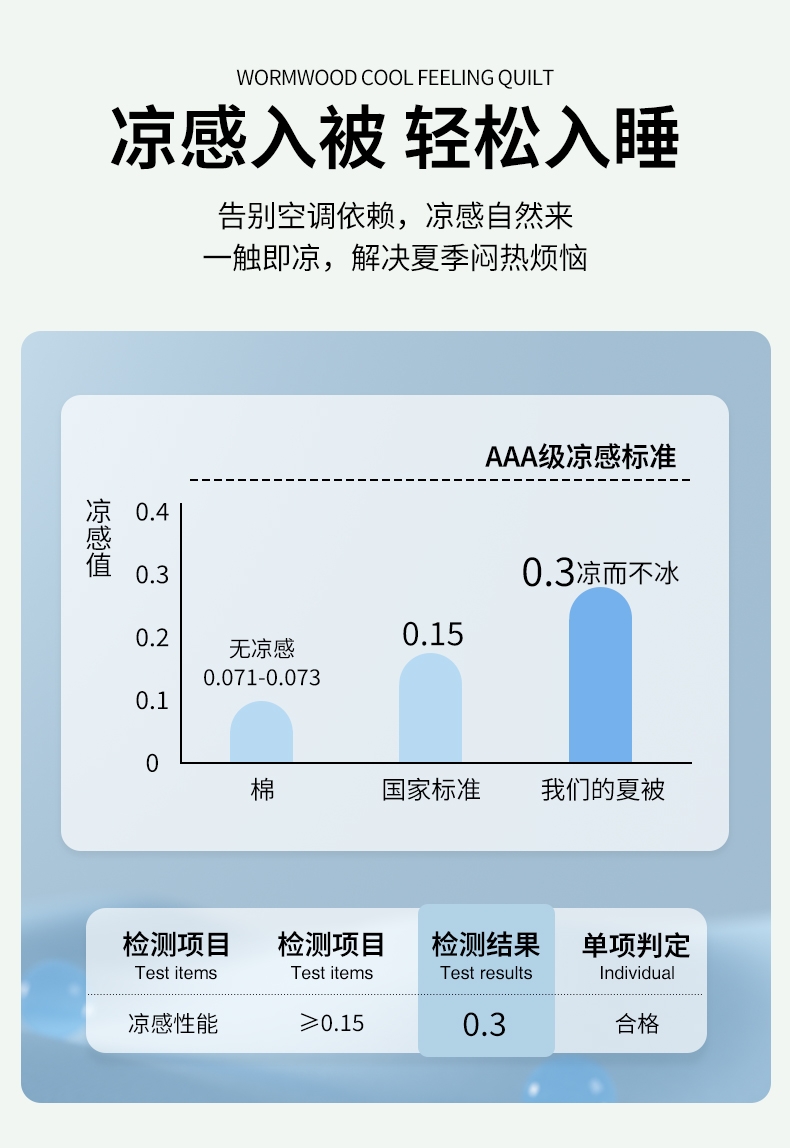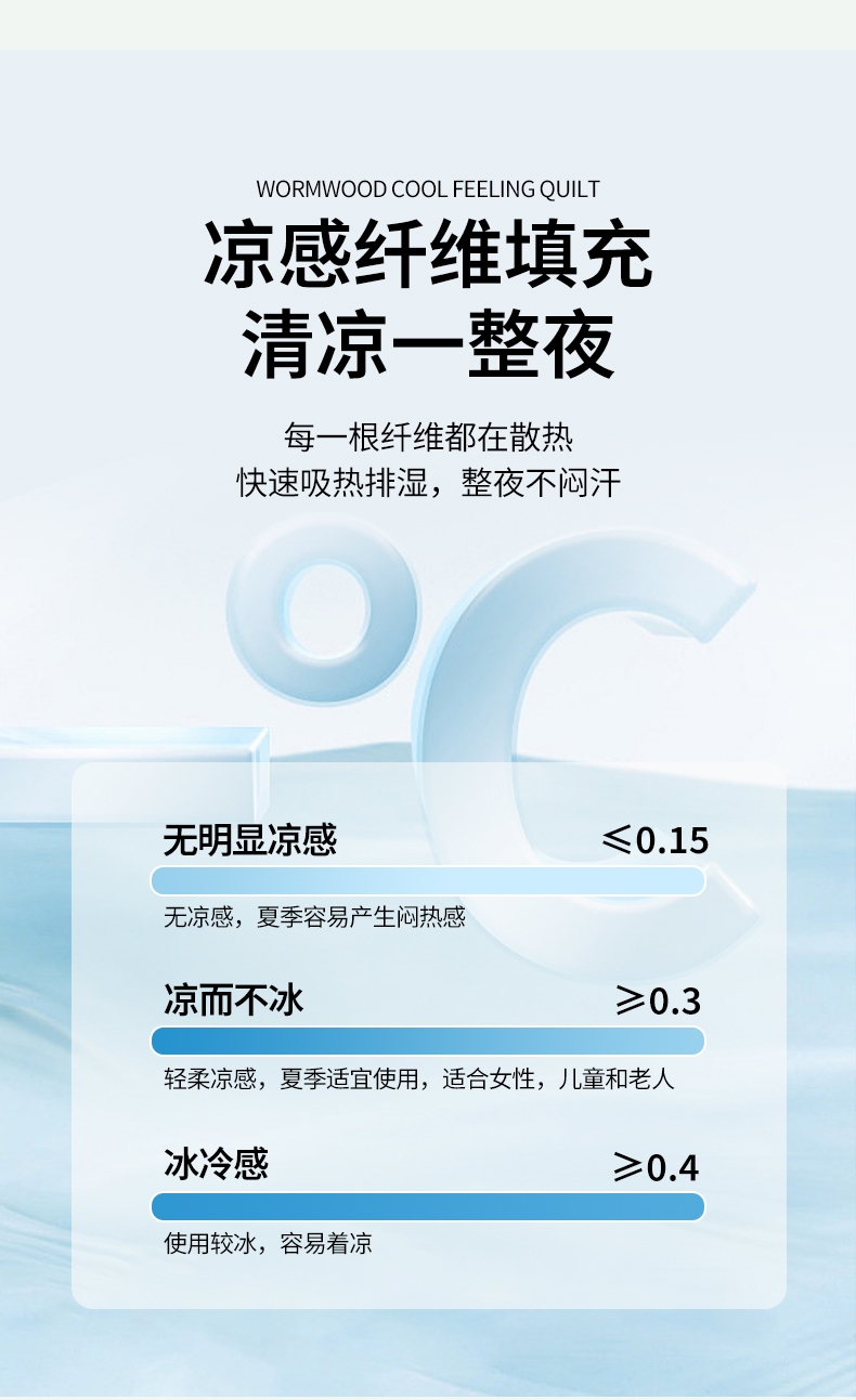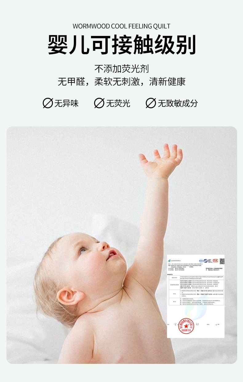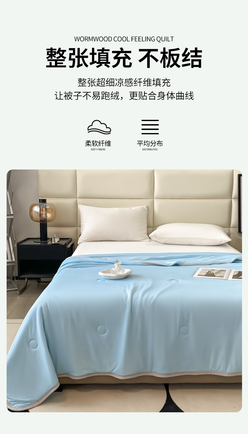 采用柔软凉感的凉感丝制作成的面料;艾草优质超细纤维,柔软亲肤 导湿透气;活性印染工艺 高级感十足压花工艺