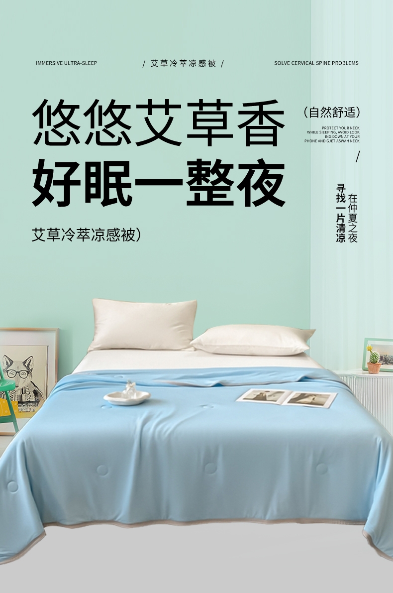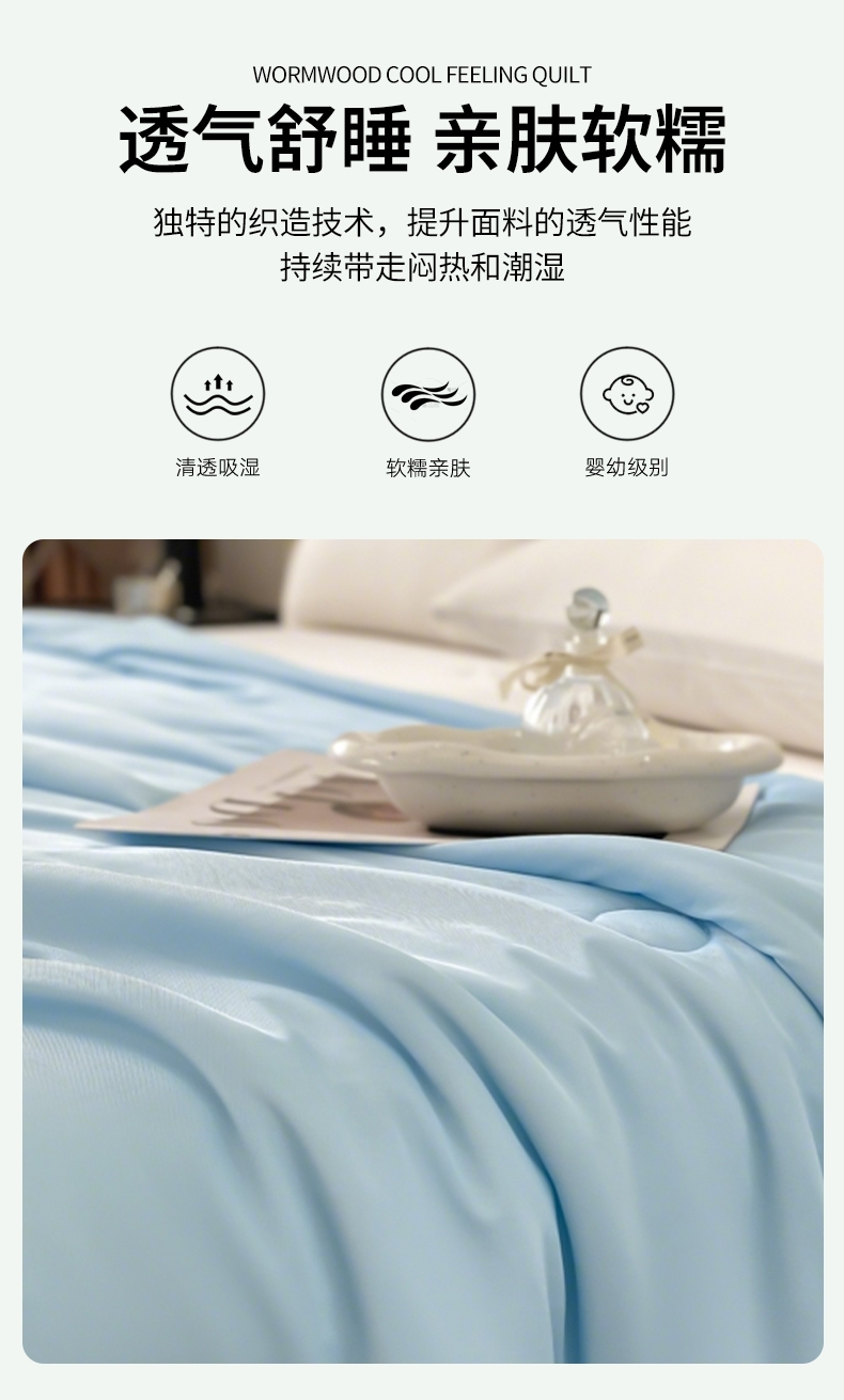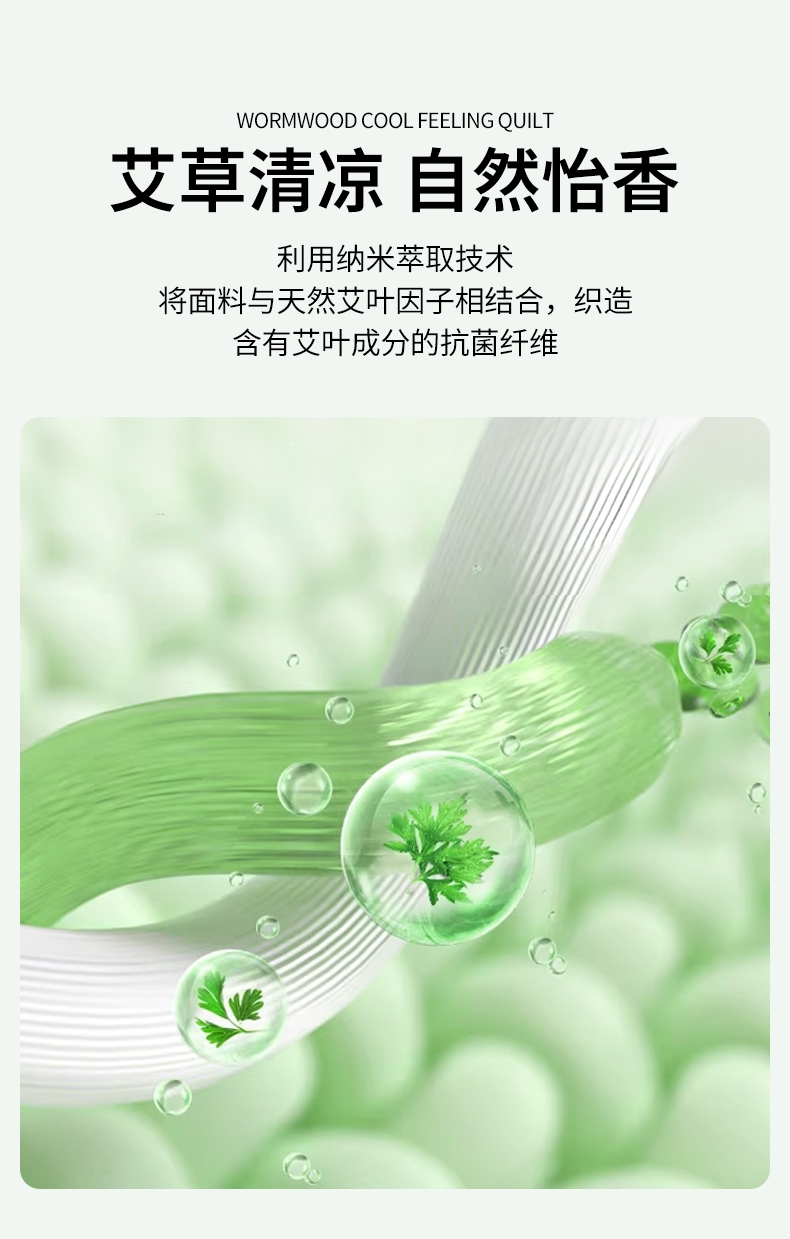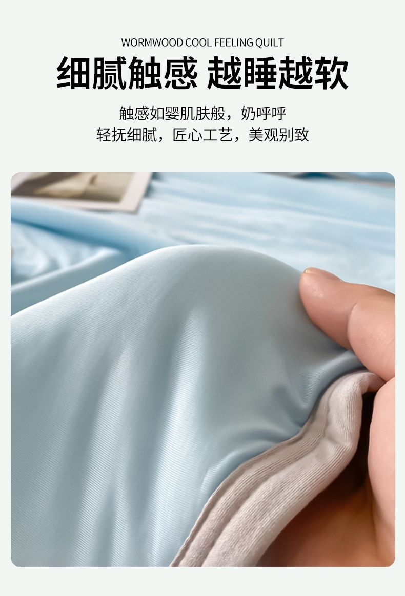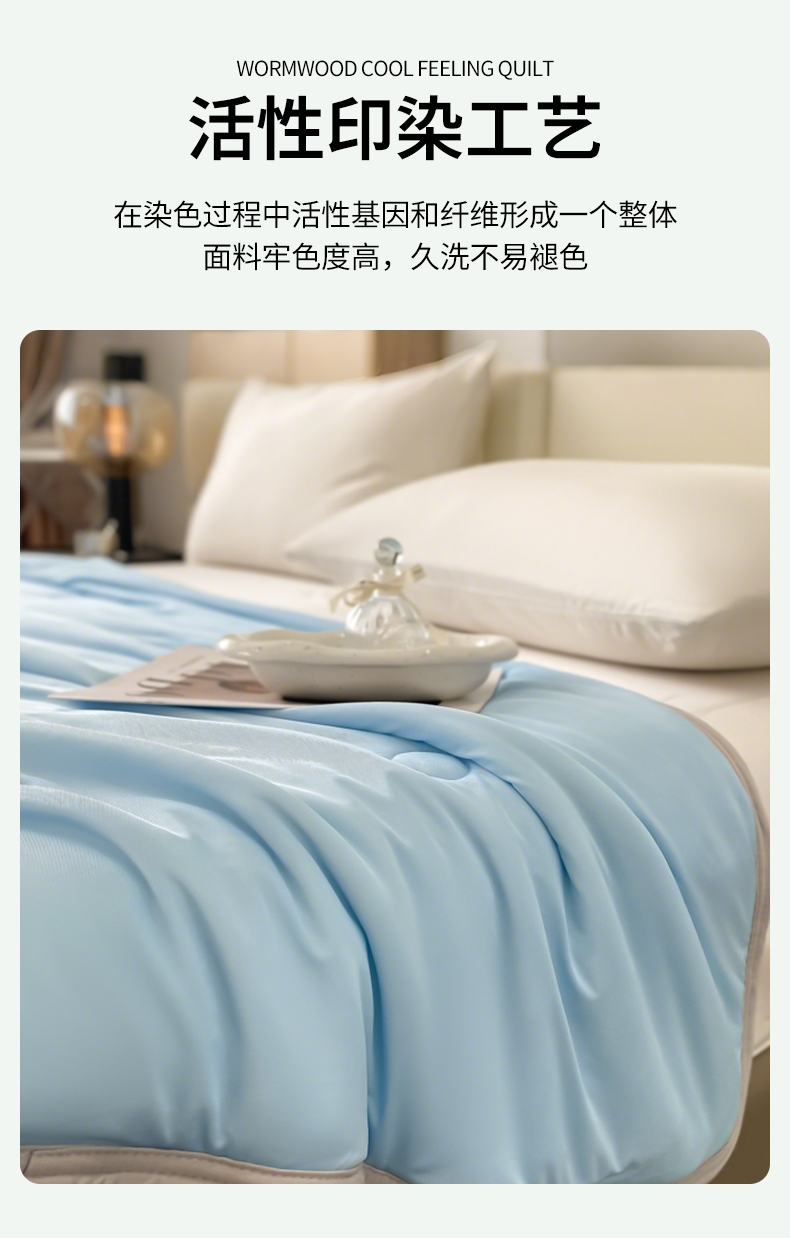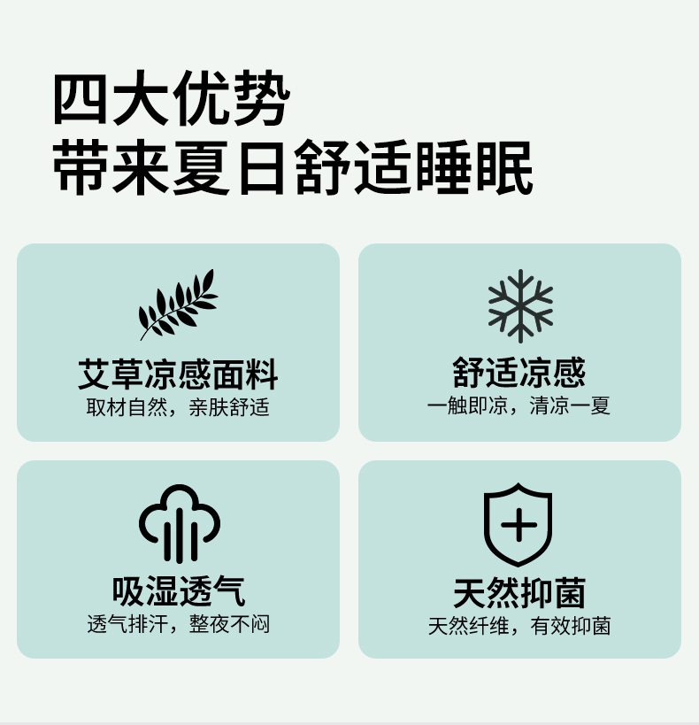 : 采用柔软凉感的凉感丝制作成的面料;艾草优质超细纤维,柔软亲肤 导湿透气;活性印染工艺 高级感十足压花工艺
