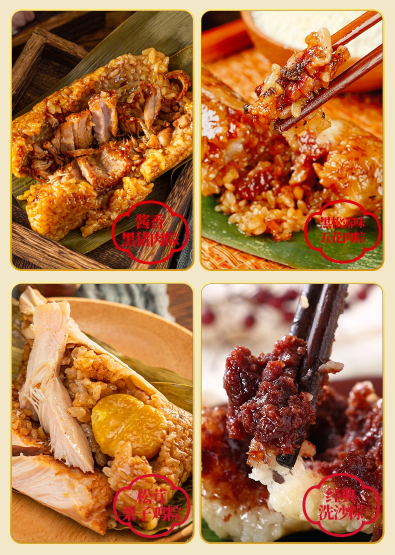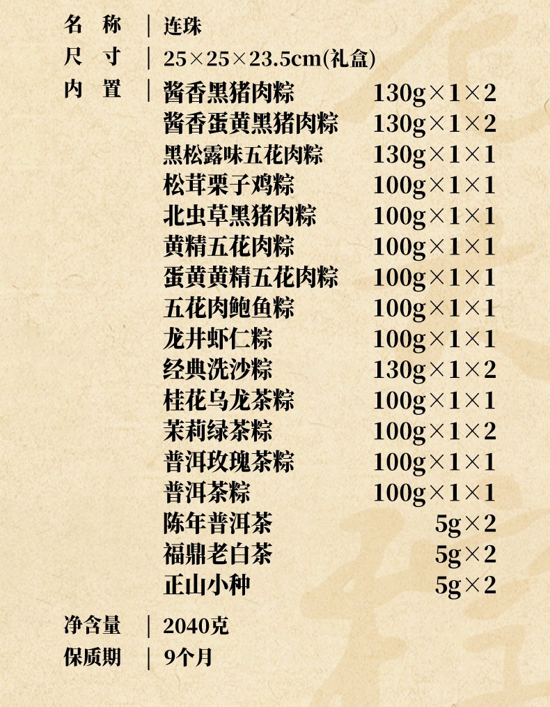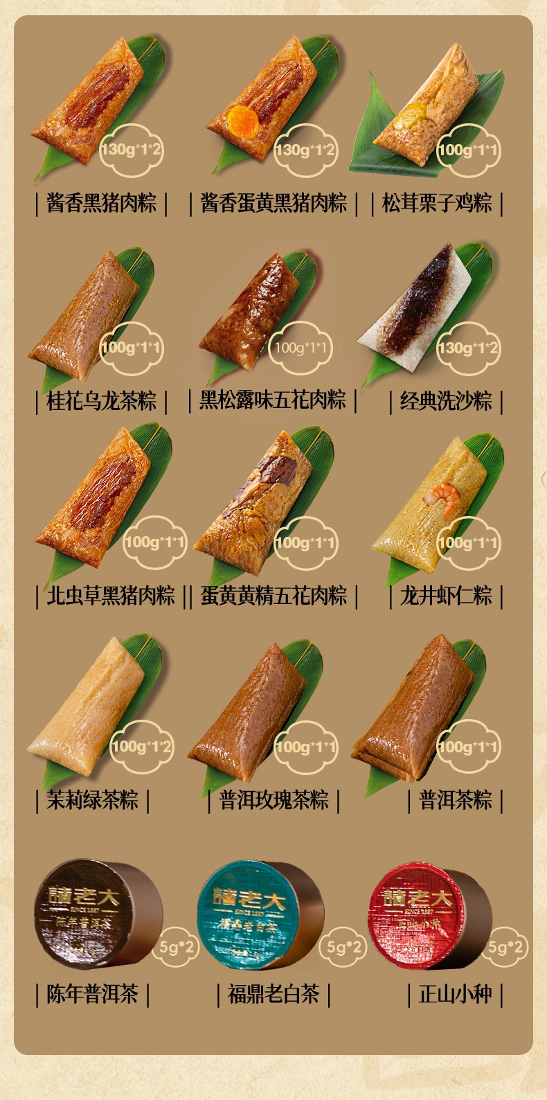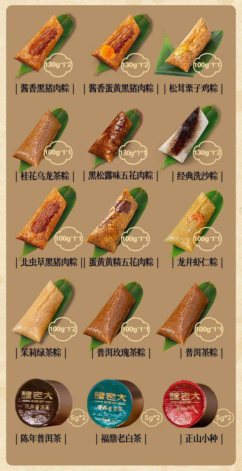 配置清单:130克*1*2真空酱香黑猪肉粽 130克*1*2真空酱香蛋黄黑猪肉粽 130克*1真空黑松露味五花肉粽 100克*1真空松茸栗子鸡粽 100克*1真空北虫草黑猪肉粽 100克*1真空黄精五花肉粽 100克*1真空蛋黄黄精五花肉粽 100克*1真空五花肉鲍鱼粽 100克*1真空龙井虾仁粽 130克*1*2真空经典洗沙粽 100克*1真空桂花乌龙茶粽 100克*1*2真空茉莉绿茶粽 100克*1真空普洱玫瑰茶粽 100克*1真空普洱茶粽 5克*1*2陈年普洱茶(咖啡罐) 5克*1*2福鼎老白茶(绿罐) 5克*1*2正山小种(红罐)