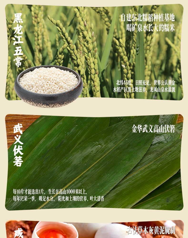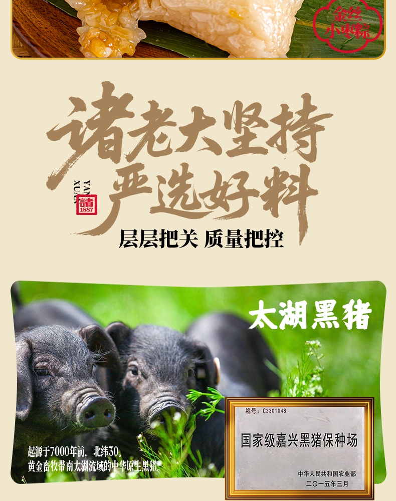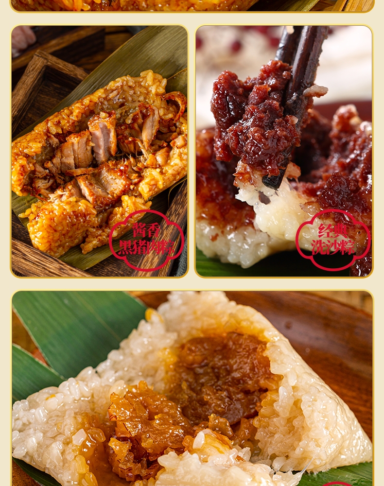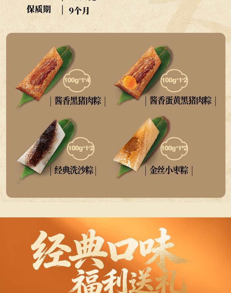 配置清单:100克*1*4真空酱香黑猪肉粽 100克*1*2真空酱香蛋黄黑猪肉粽 100克*1*2真空金丝小枣粽 100克*1*2真空经典洗沙粽