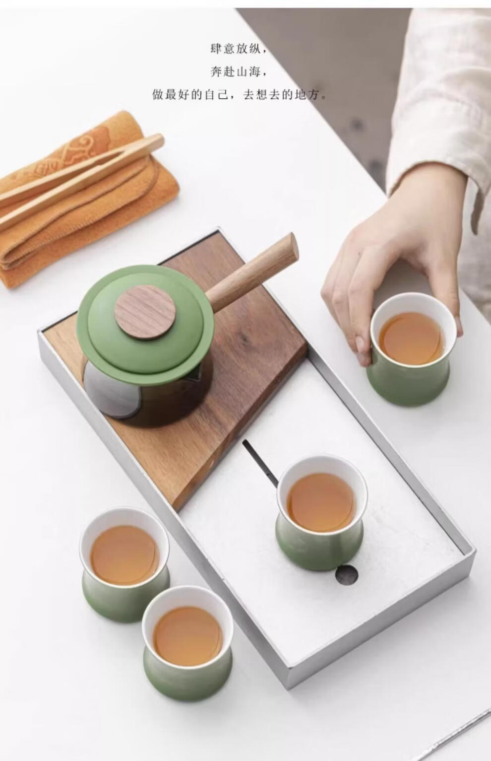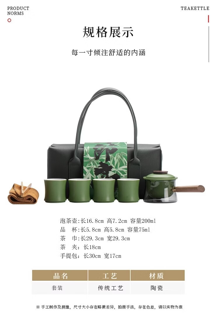 配置清单:1壶,1茶巾,1茶夹,4茶杯,旅行包
