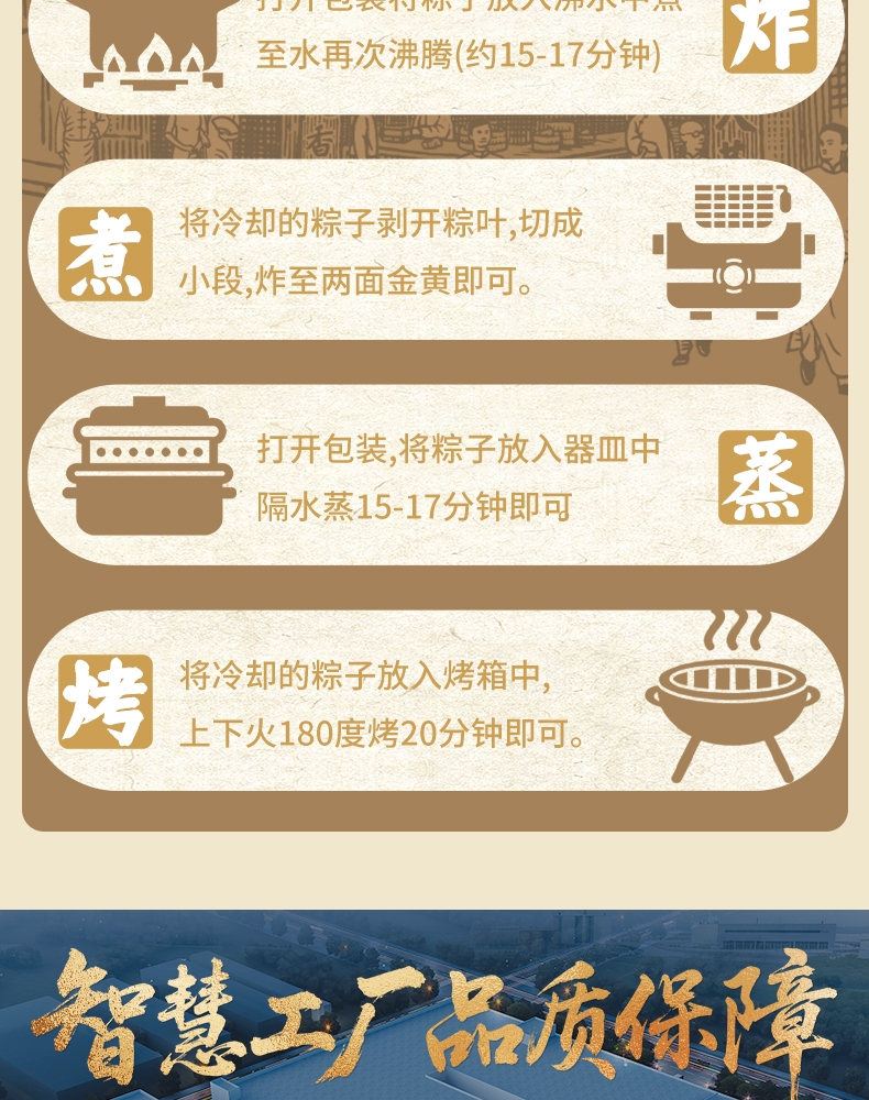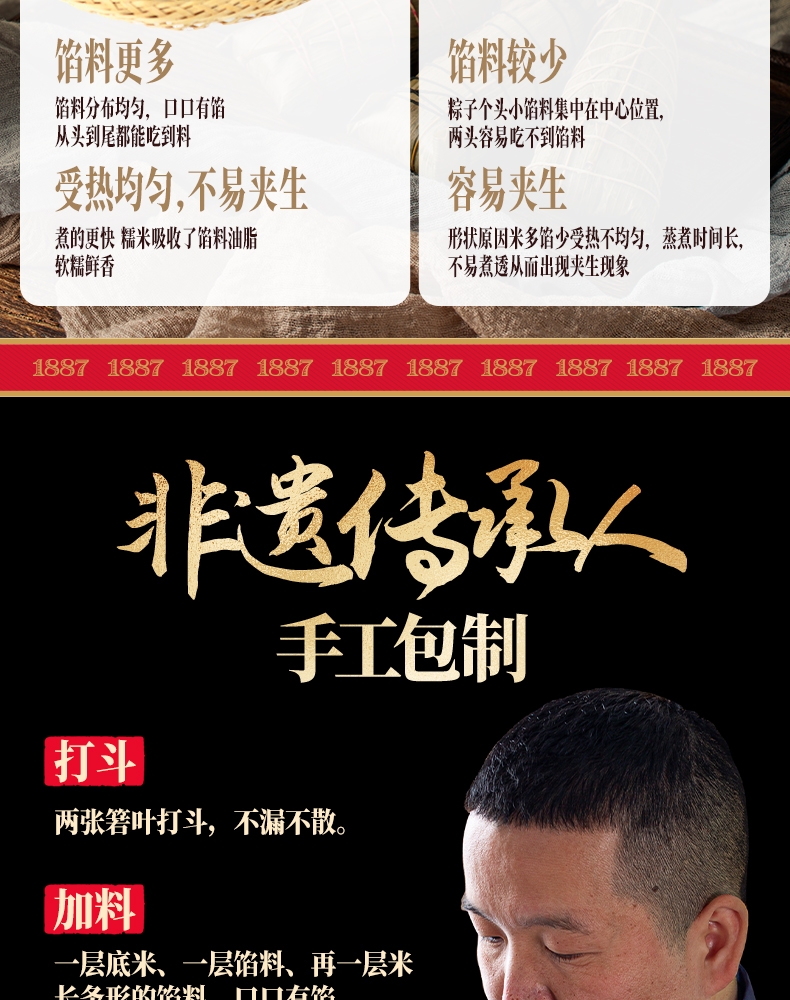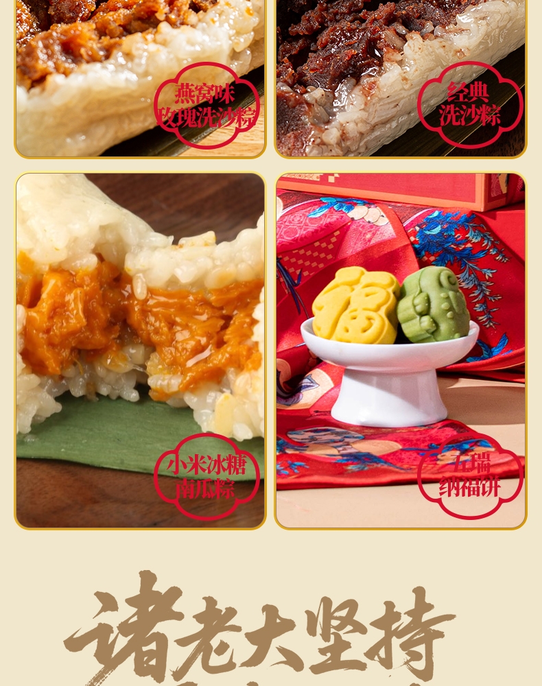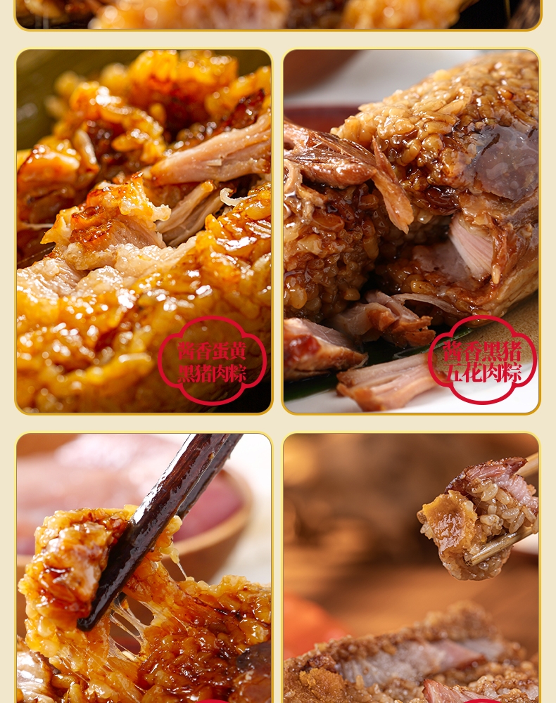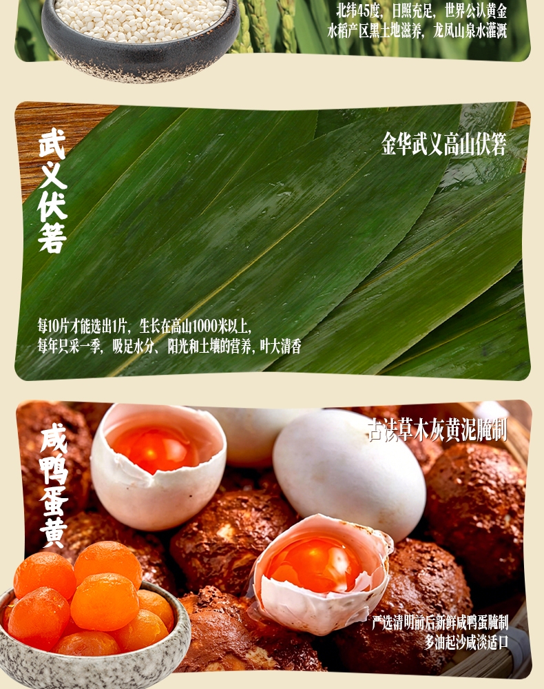 选用优质糯米、新鲜肉类、海鲜等食材,确保粽子的口感;采用传统手工制作工艺,确保粽子的形状、口感和风味符;严格遵守食品安全标准,确保产品的卫生和安全。