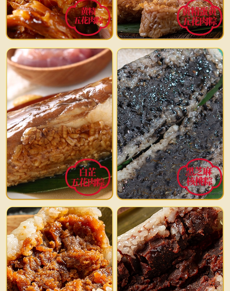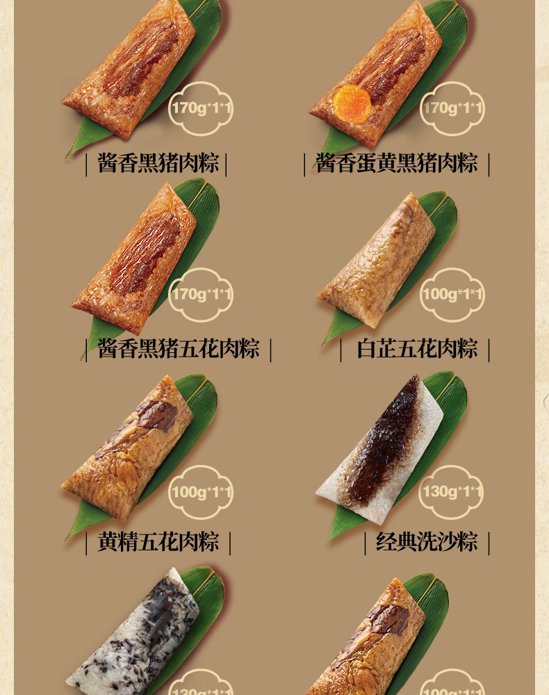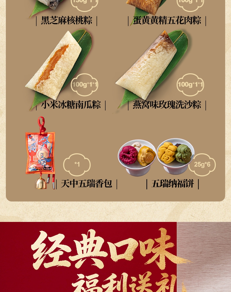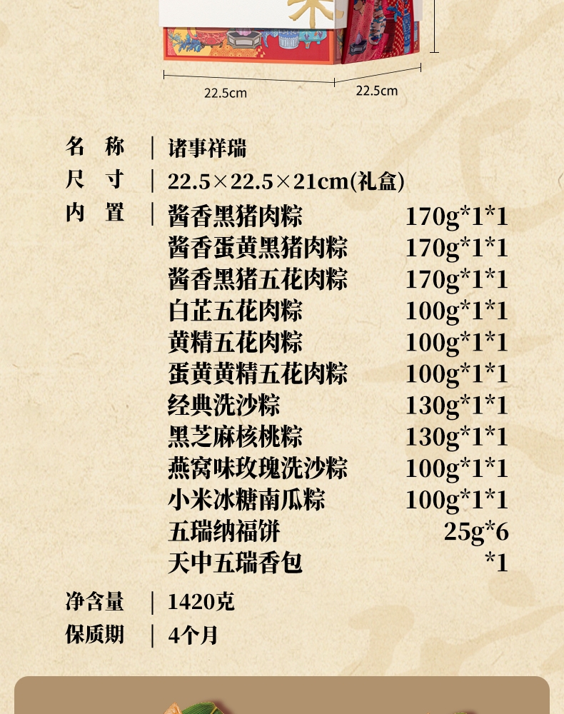 配置清单:170克*1真空酱香黑猪肉粽 170克*1真空酱香蛋黄黑猪肉粽 170克*1真空酱香黑猪五花肉粽 100克*1真空白芷五花肉粽 100克*1真空黄精五花肉粽 100克*1真空蛋黄黄精五花肉粽 130克*1真空经典洗沙粽 130克*1真空黑芝麻核桃粽 100克*1真空燕窝味玫瑰洗沙粽 100克*1真空小米冰糖南瓜粽 25克*6五瑞纳福饼 天中五瑞香包