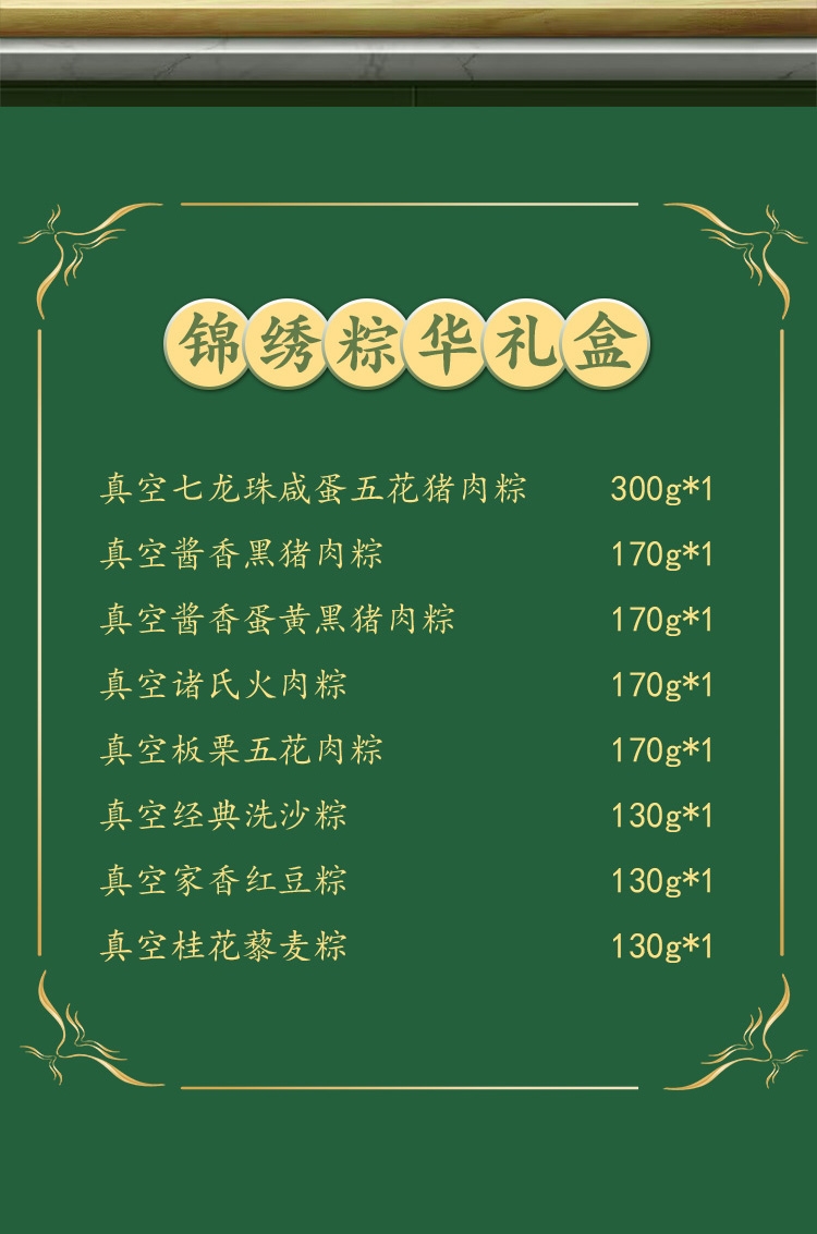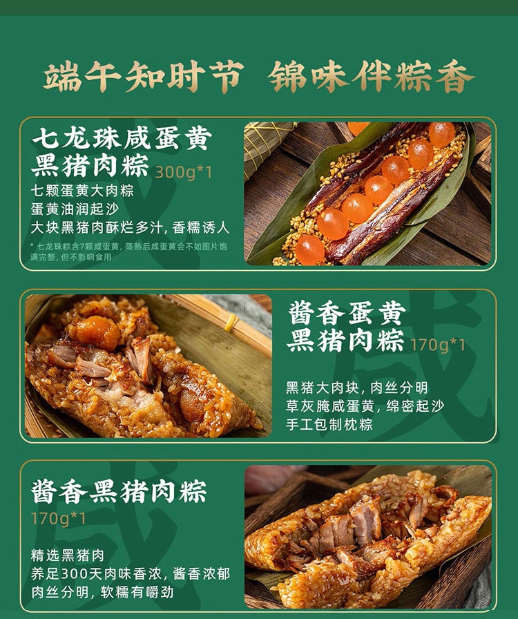配置清单:300克*1真空七龙珠咸蛋五花猪肉粽 170克*1真空酱香黑猪肉粽 170克*1真空酱香蛋黄黑猪肉粽 170克*1真空诸氏火肉粽 170克*1真空板栗五花肉粽 130克*1真空经典洗沙粽 130克*1真空家香红豆粽 130克*1真空桂花藜麦粽