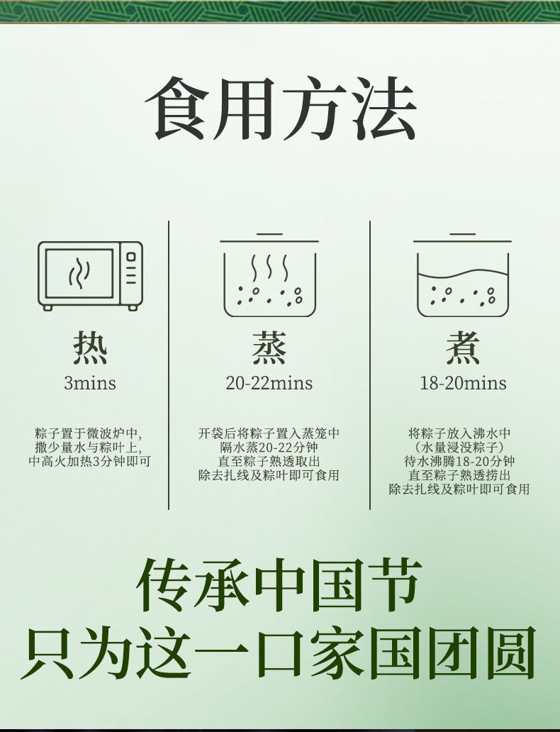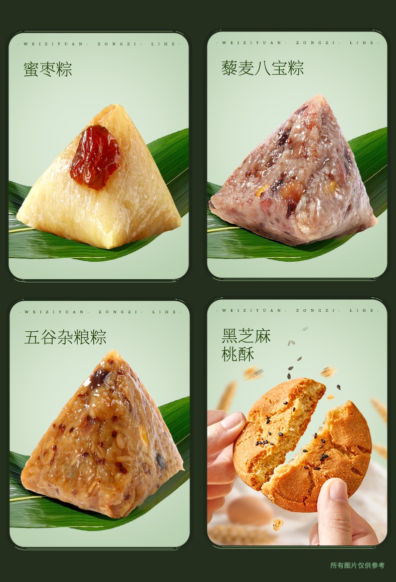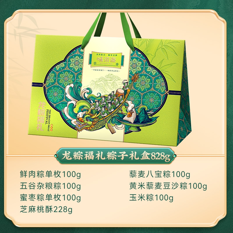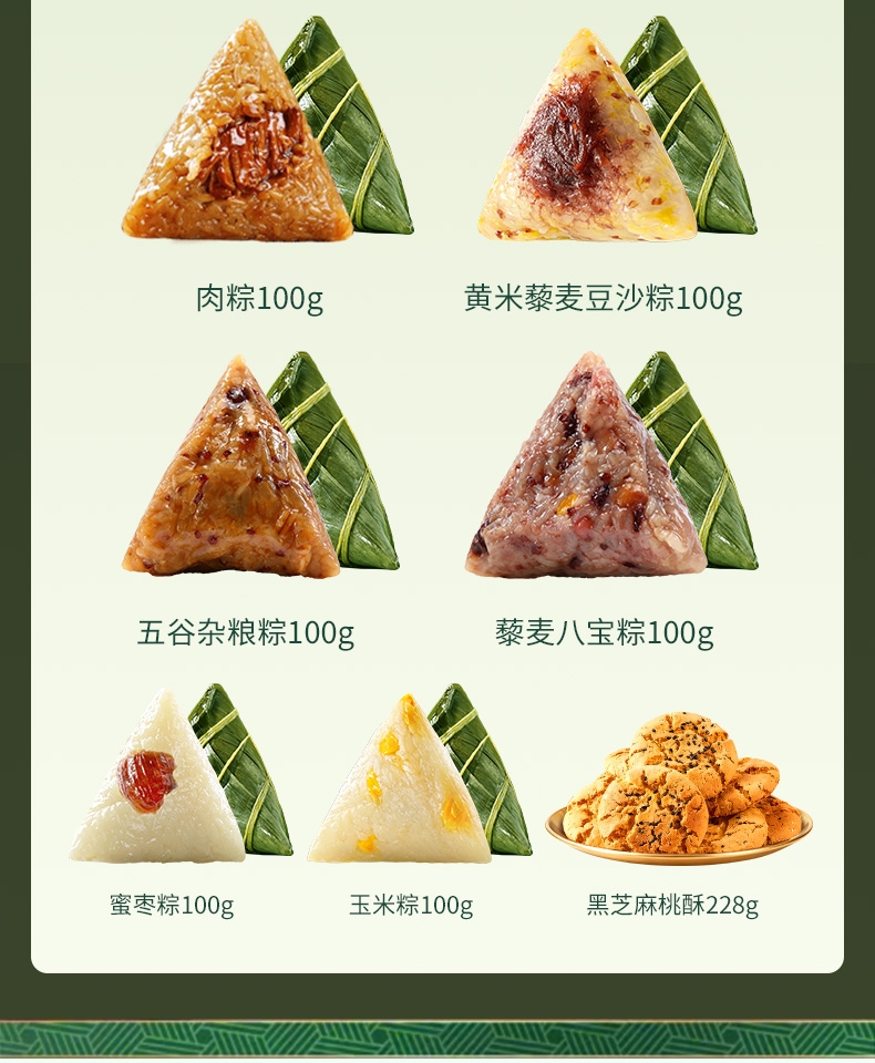 配置清单:味滋源 鲜肉粽单枚100g 味滋源 藜麦八宝粽100g 味滋源 五谷杂粮粽100g 味滋源 黄米藜麦豆沙粽100g 味滋源 蜜枣粽单枚100g 味滋源 玉米粽100g 味滋源 黑芝麻桃酥228g