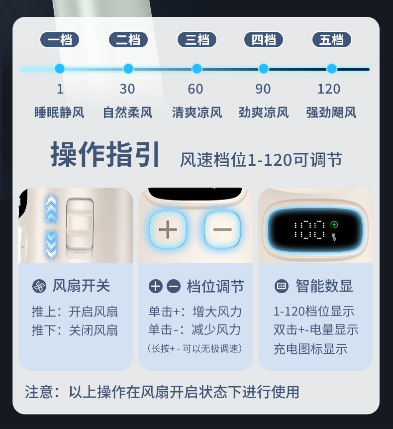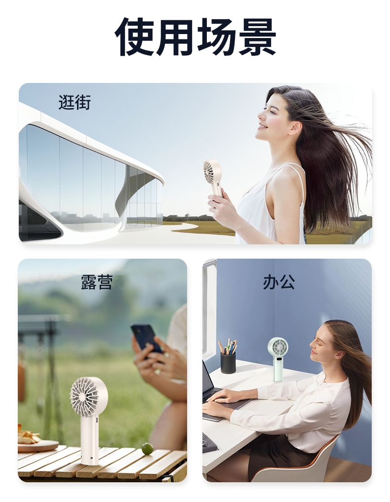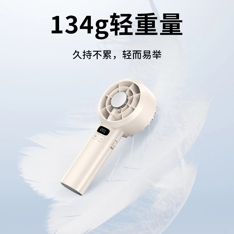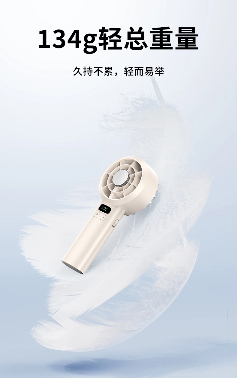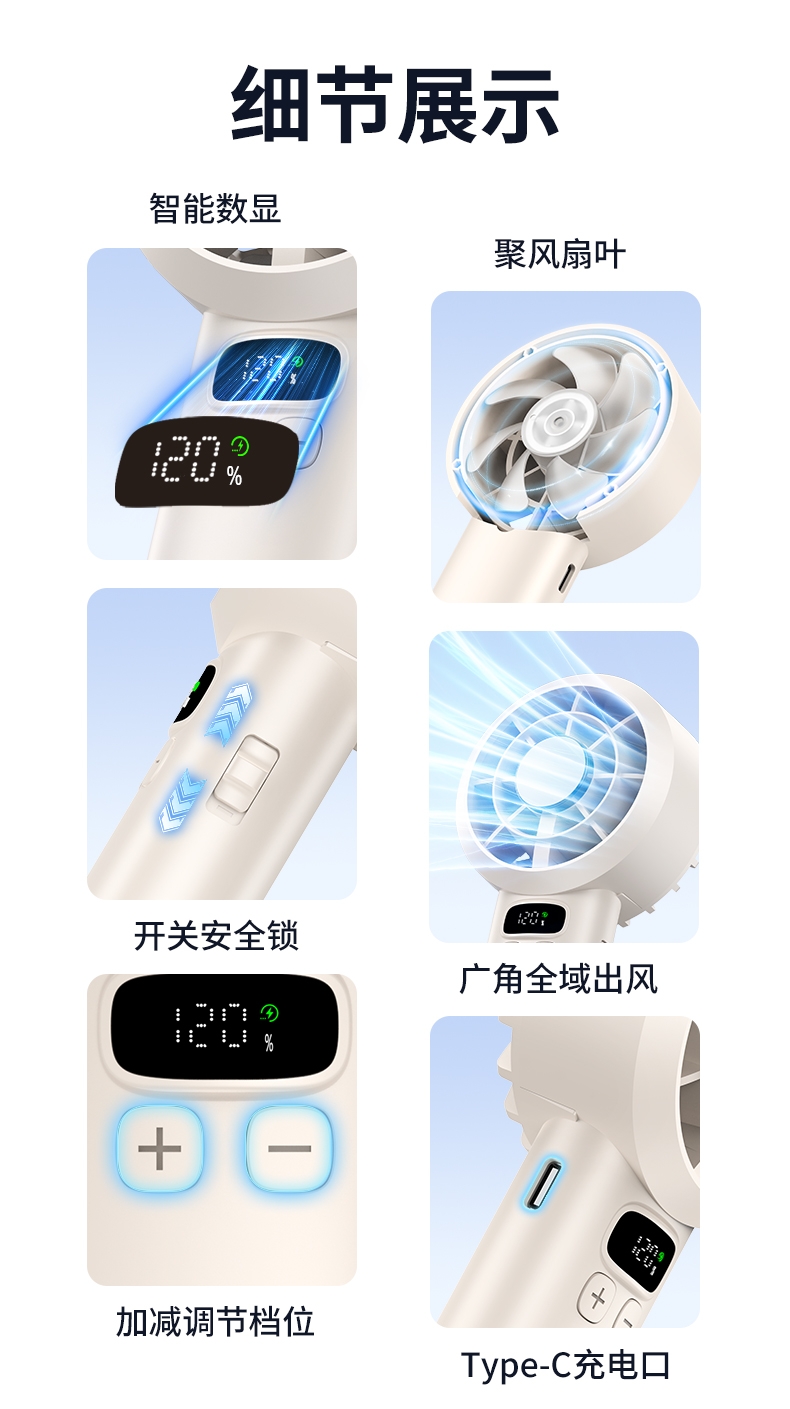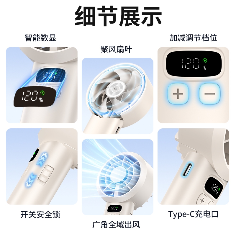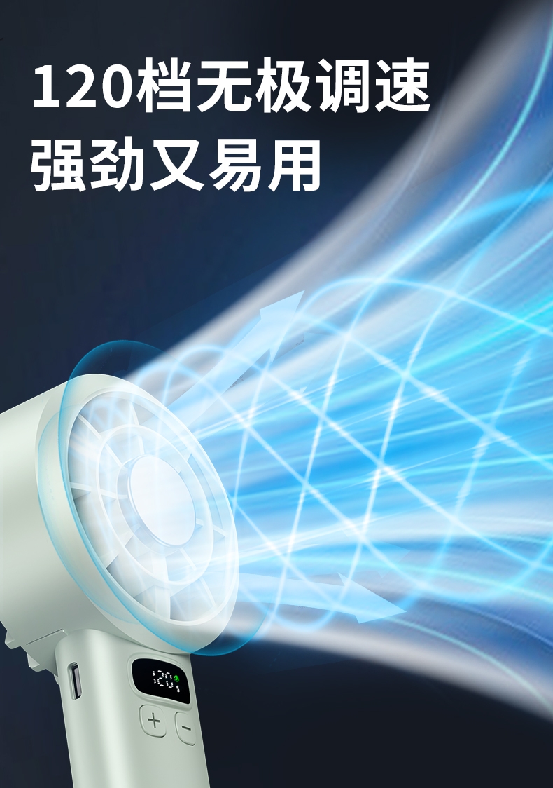 产品风量120档可调,超强风力,无噪音;数显电量、手机通用Type-c充电接口、手持桌面两;产品小巧携带方便,可定制企业LOGO