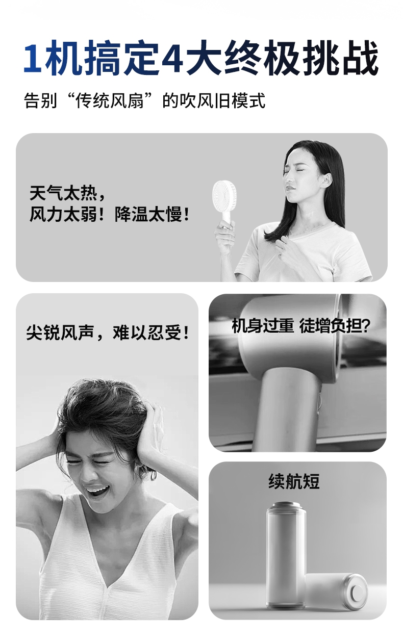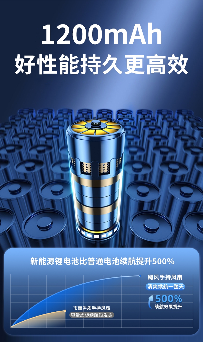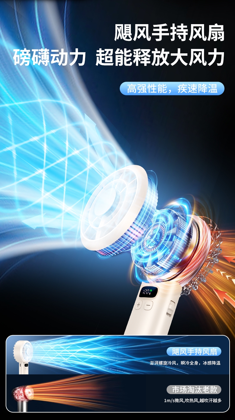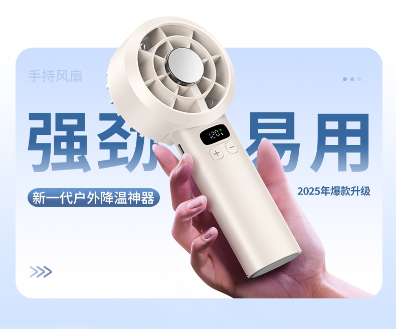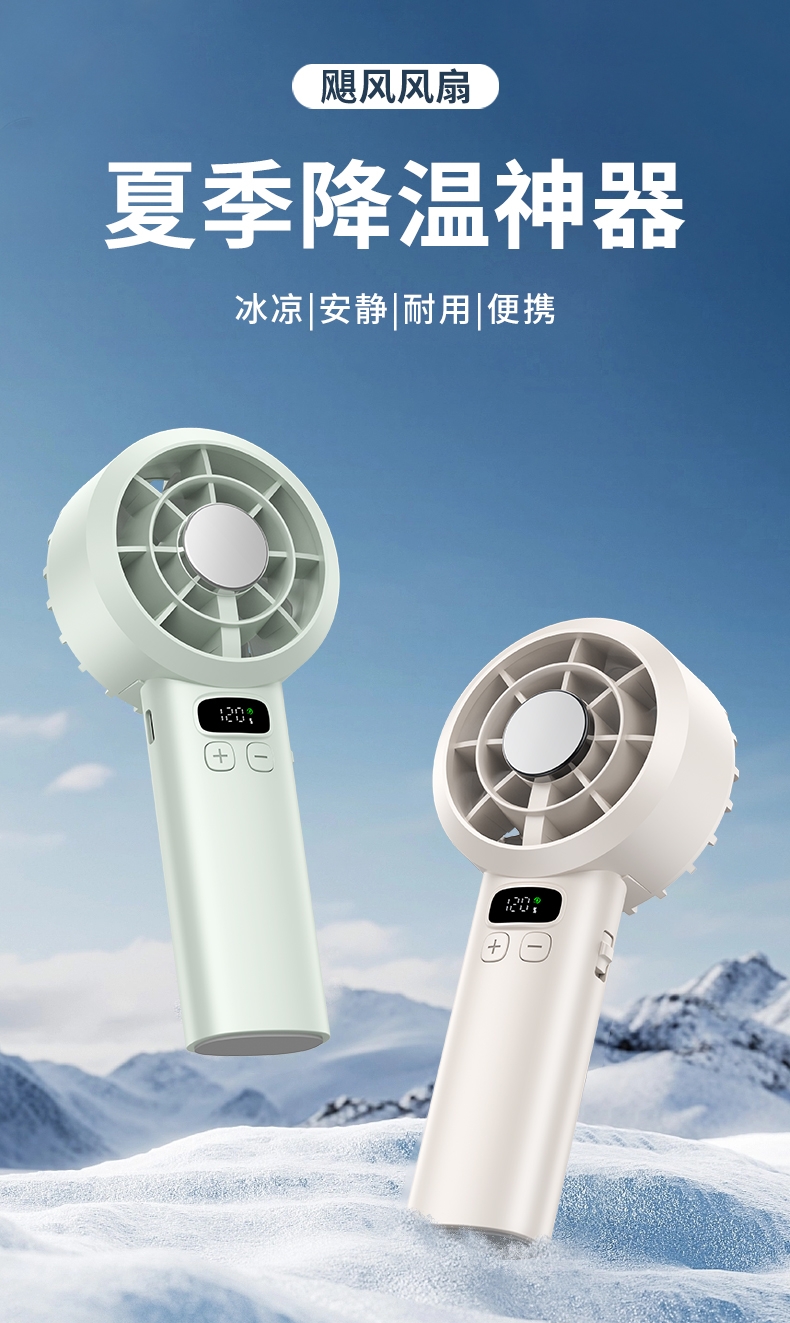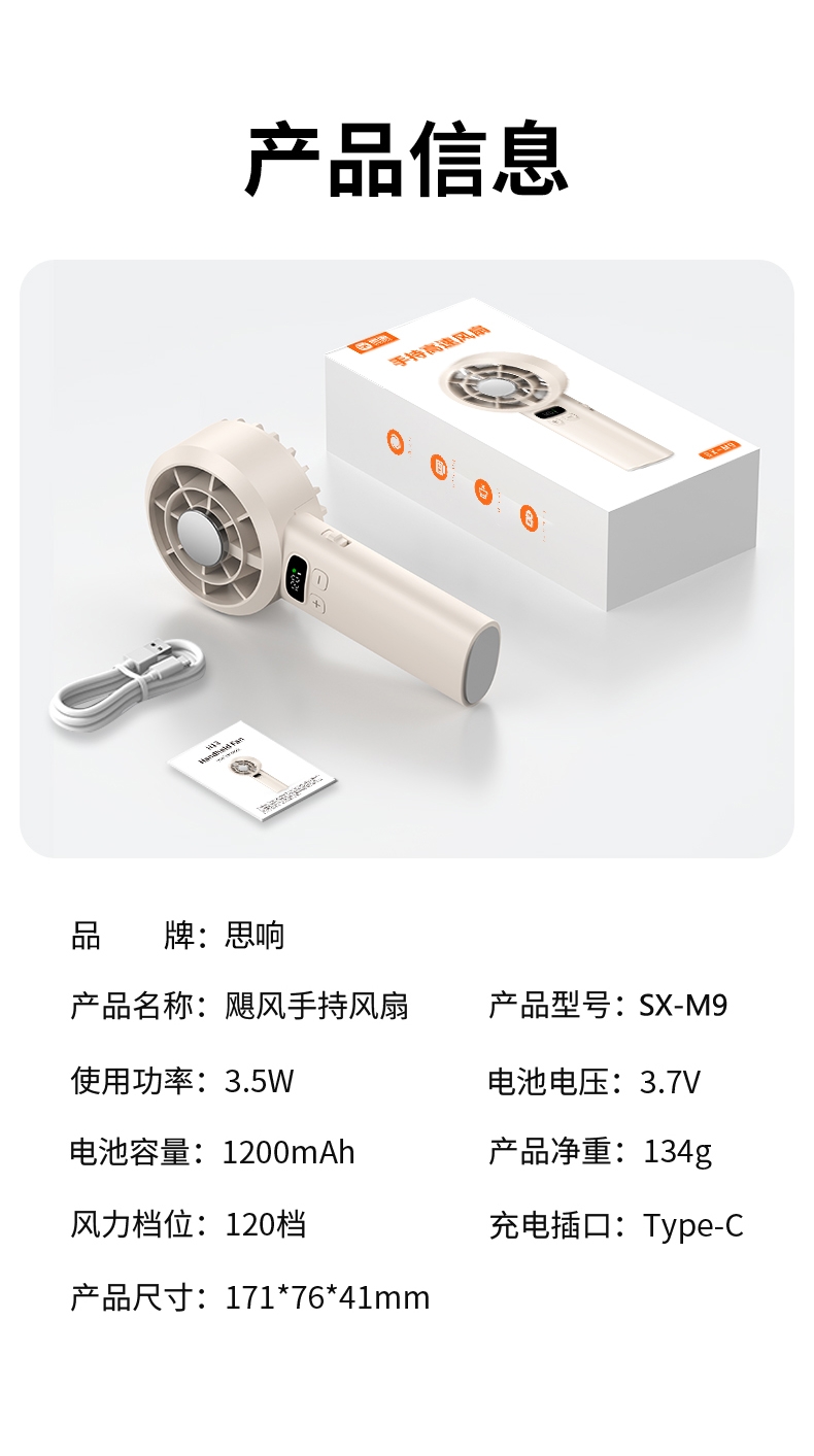 产品风量120档可调,超强风力,无噪音;数显电量、手机通用Type-c充电接口、手持桌面两;产品小巧携带方便,可定制企业LOGO