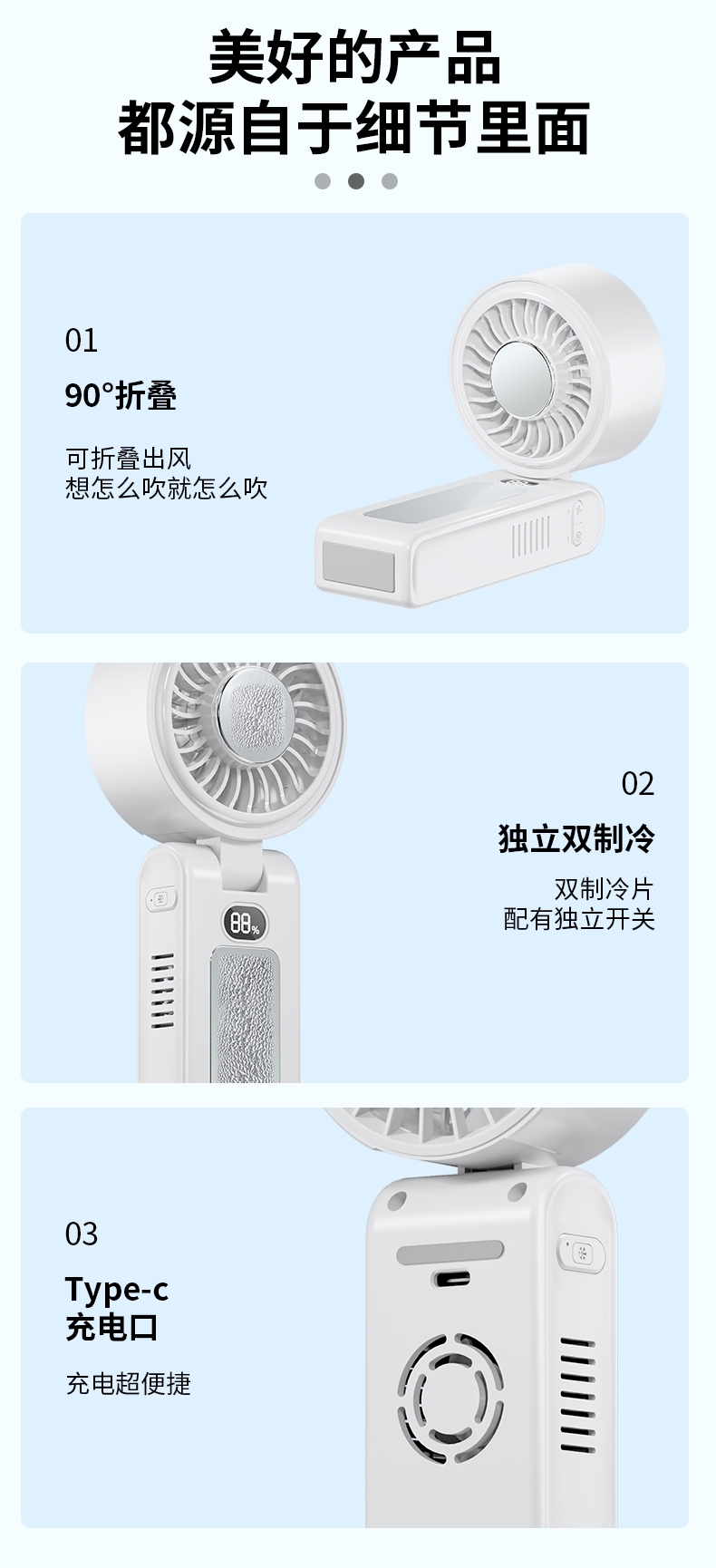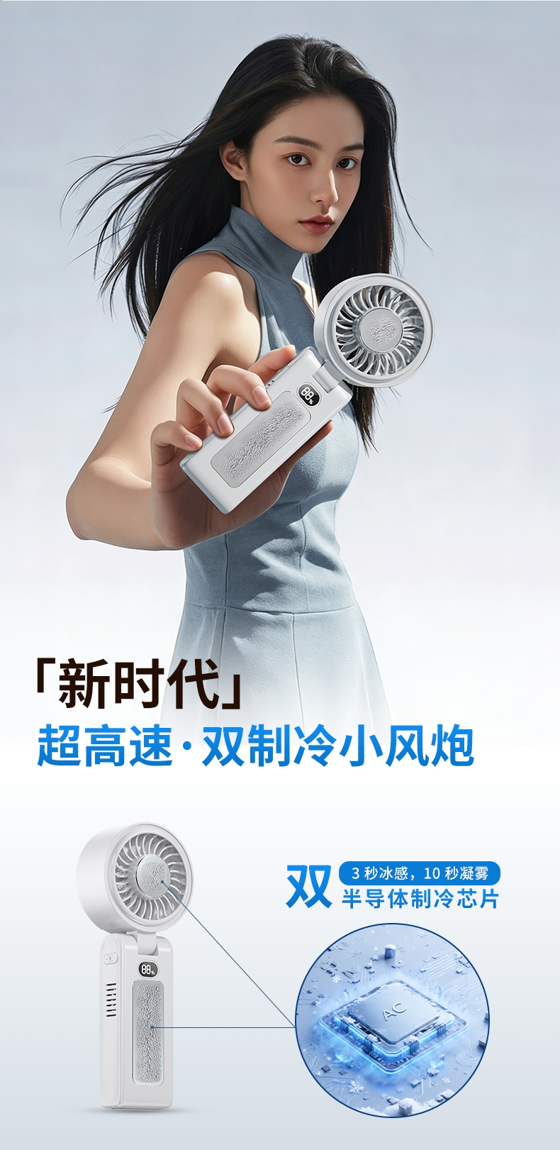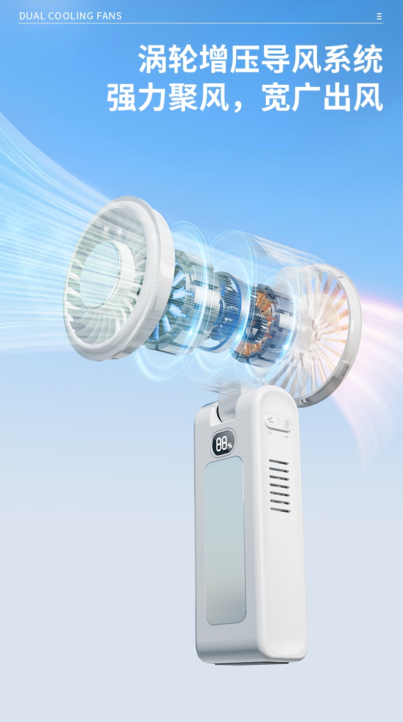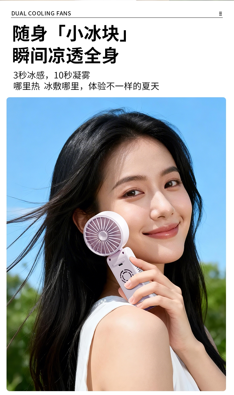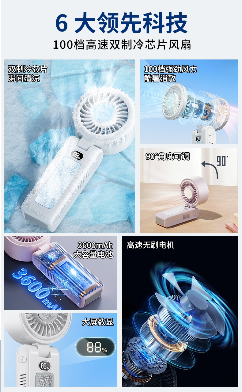 双制冷芯片,冰感直吹;100 档无级调速,风感自由定制;大屏数显,电量一目了然