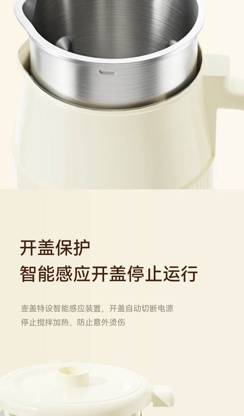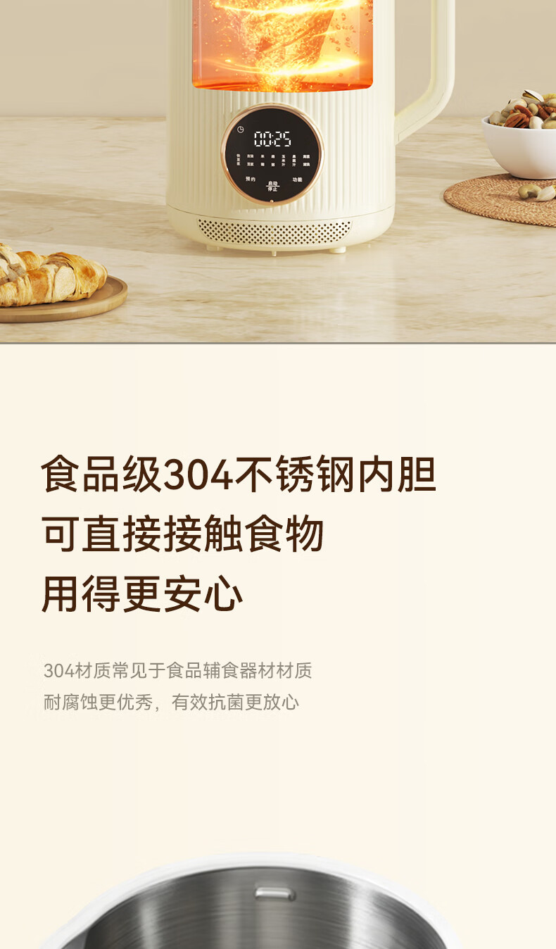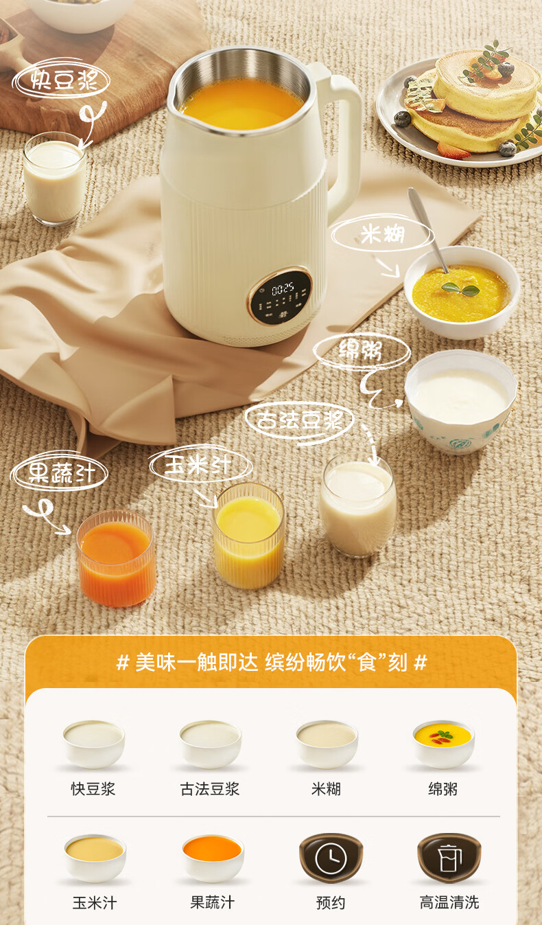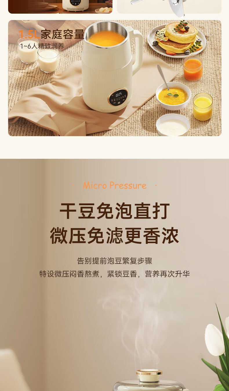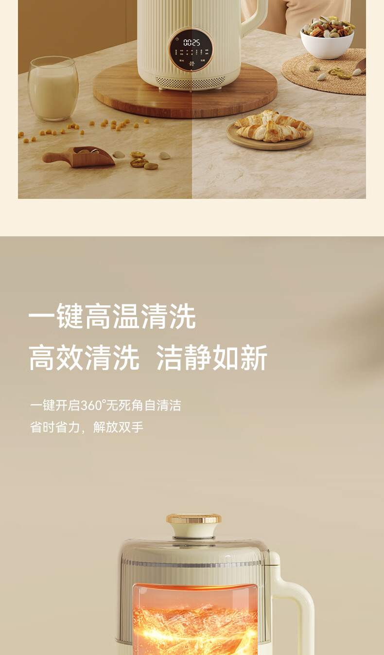 一键高温清洗,解放双手;多重物理降噪,降低噪音更舒心;升级48页花莲刀,丝滑免滤;1.5L精巧容量,不锈钢内胆无涂层无惧刮磨;24H智能预约,美味从早到晚