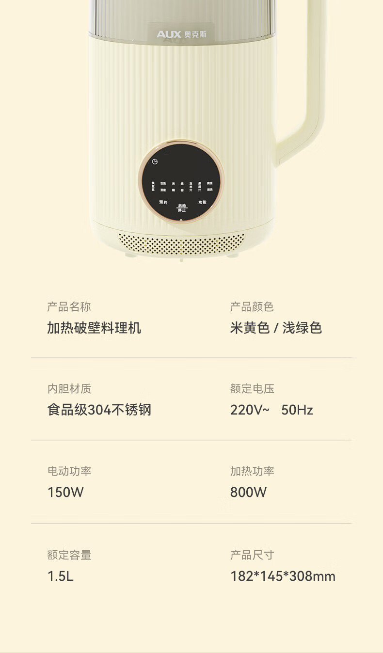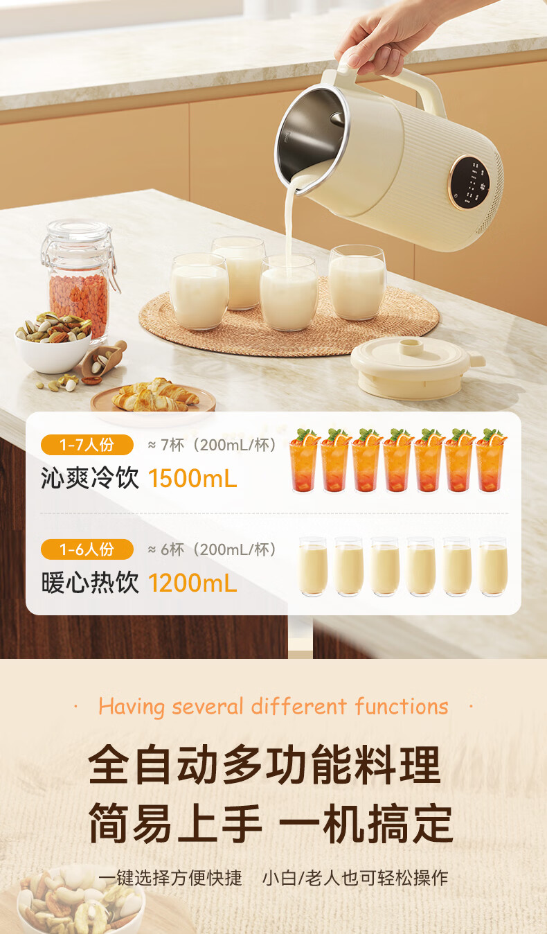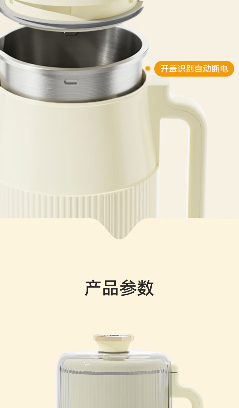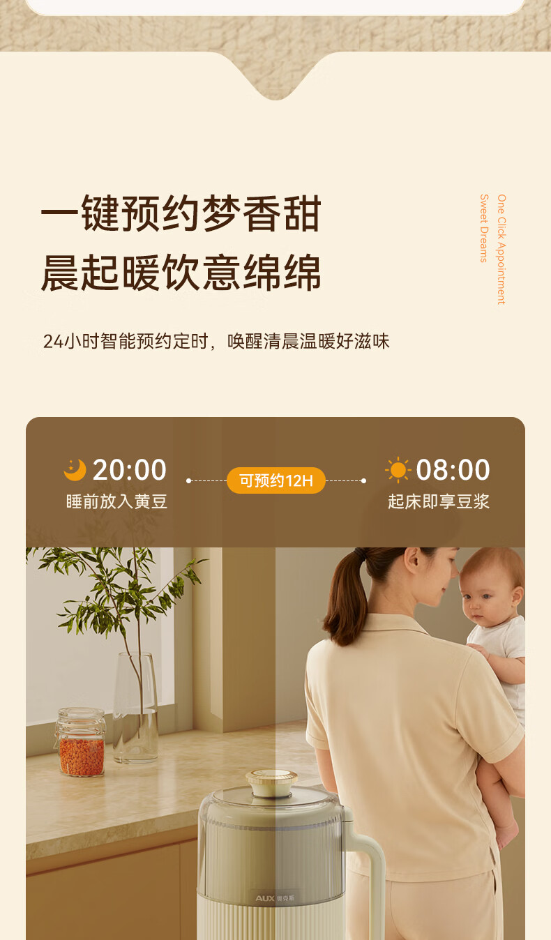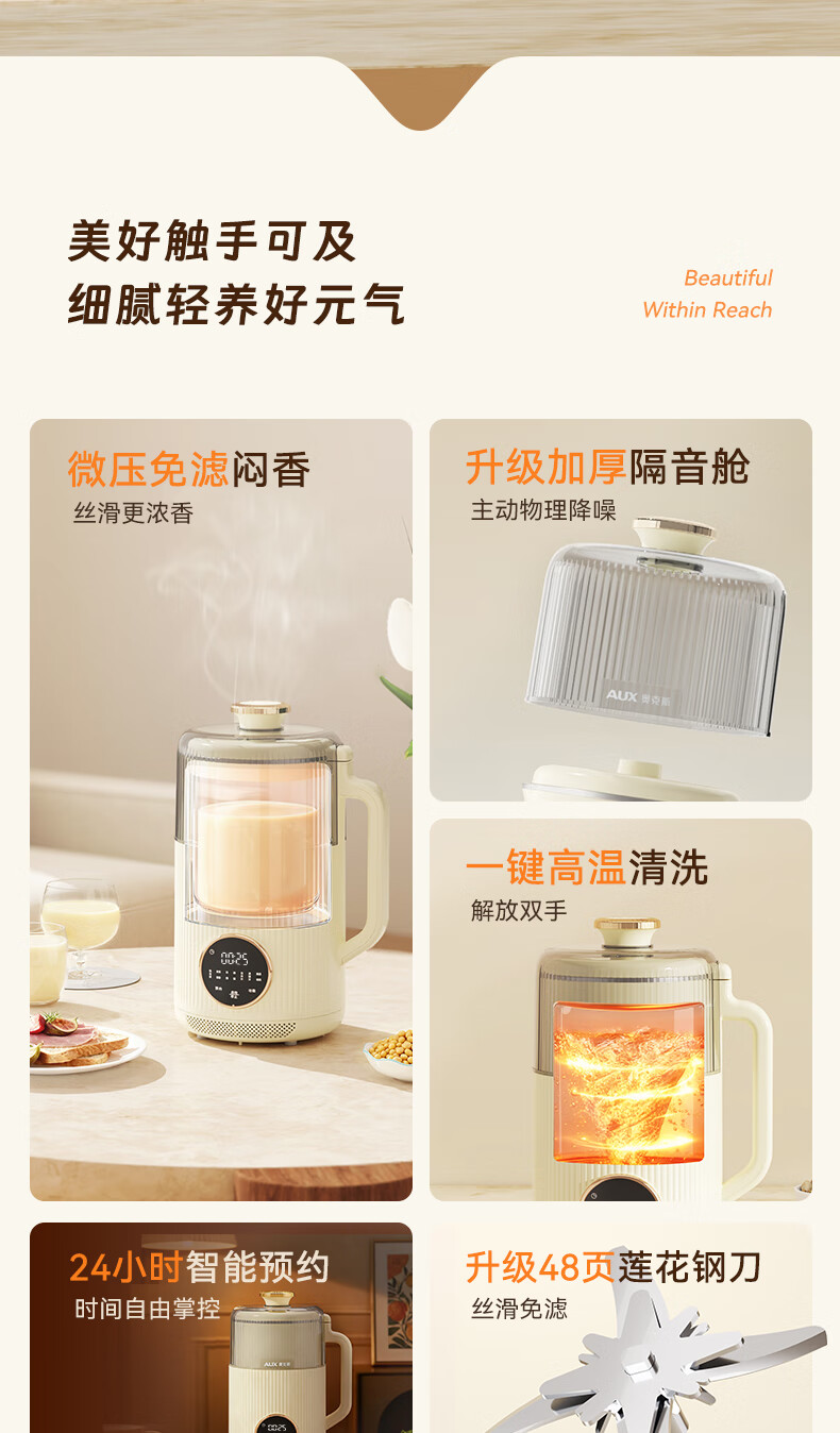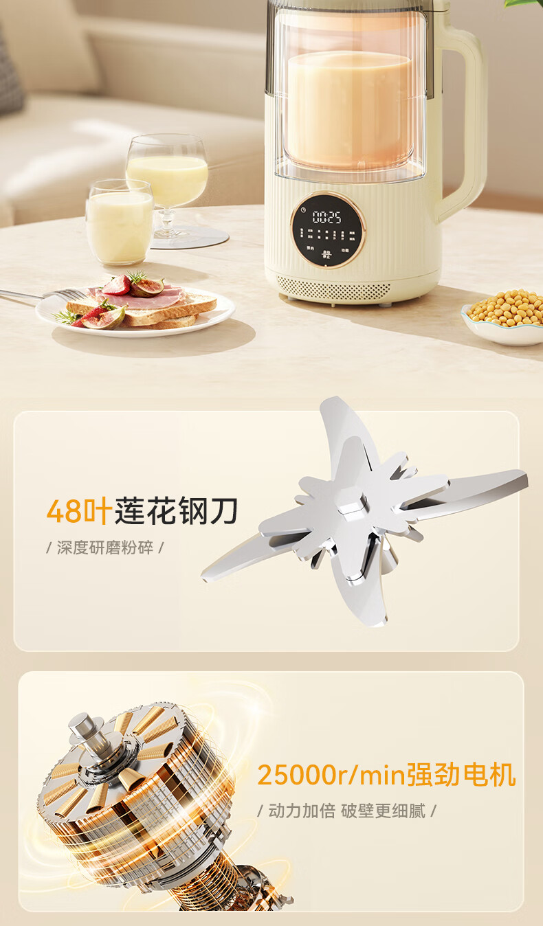 一键高温清洗,解放双手;多重物理降噪,降低噪音更舒心;升级48页花莲刀,丝滑免滤;1.5L精巧容量,不锈钢内胆无涂层无惧刮磨;24H智能预约,美味从早到晚