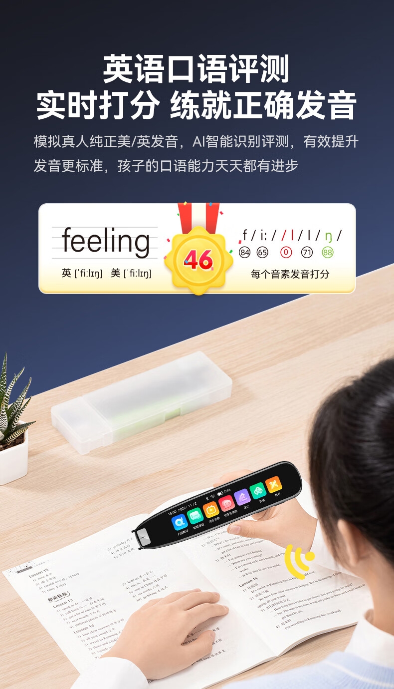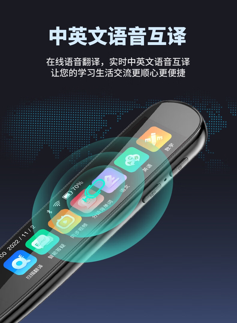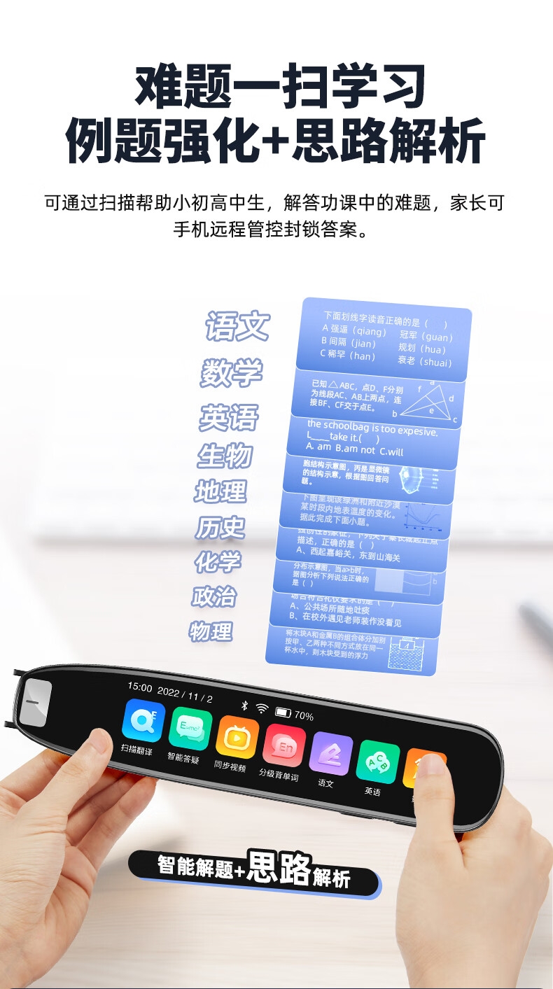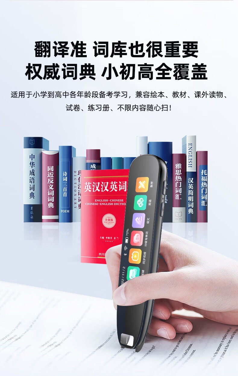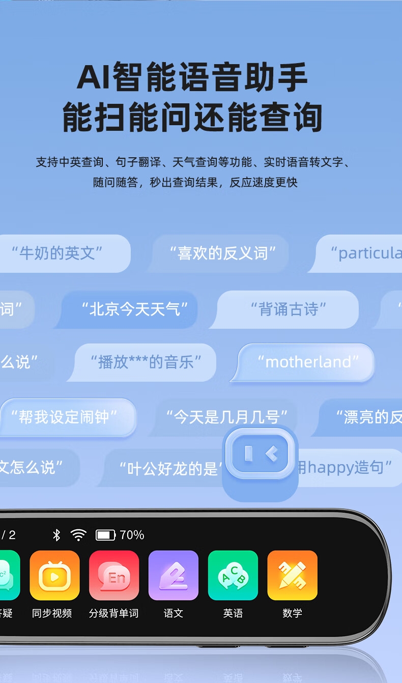 即使没有网络,也能实现翻译功能;海量中,英,日,韩词库,精准解读;AI语音智能助手,答题好帮手