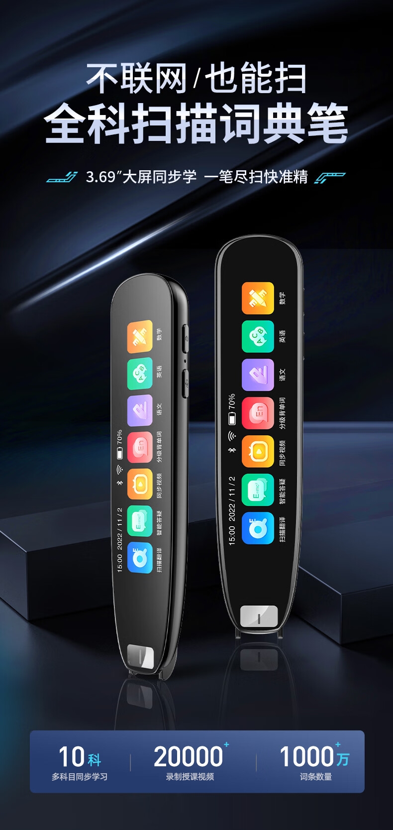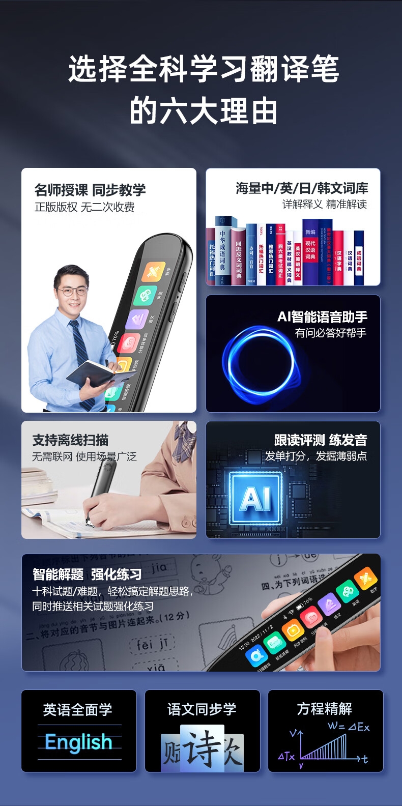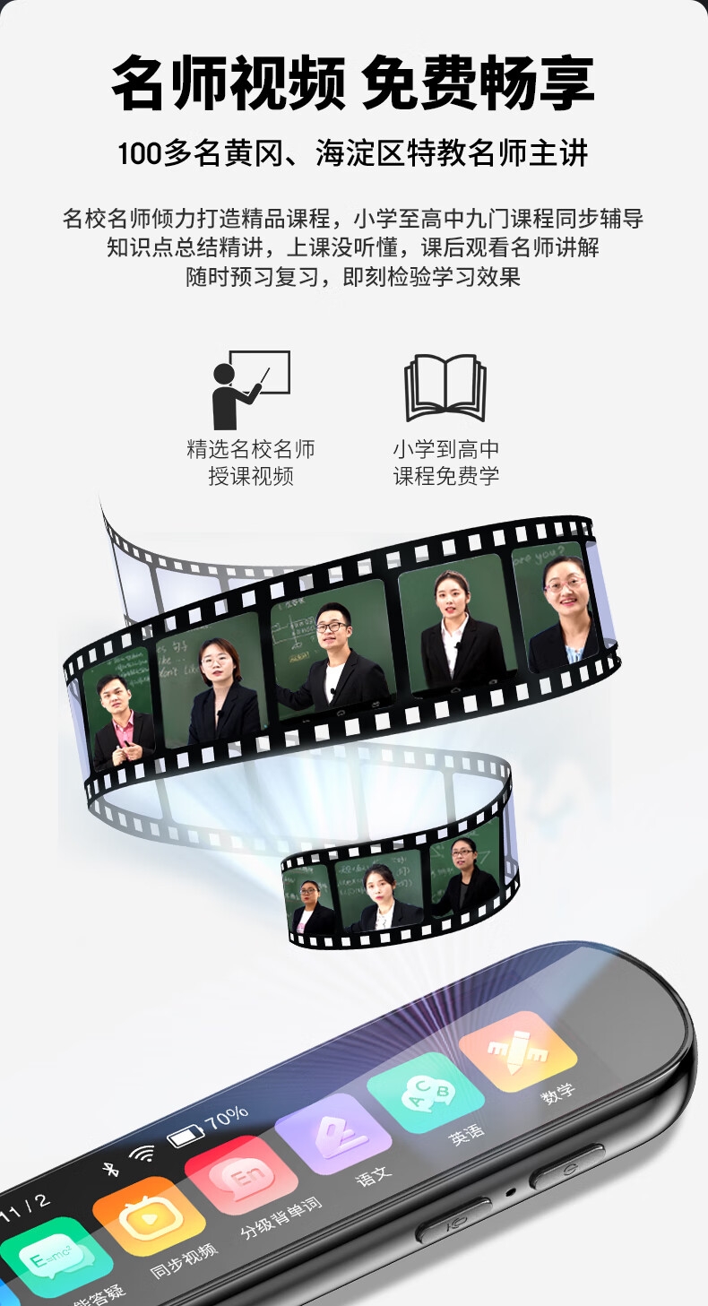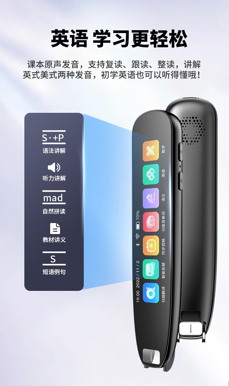 即使没有网络,也能实现翻译功能;海量中,英,日,韩词库,精准解读;AI语音智能助手,答题好帮手
