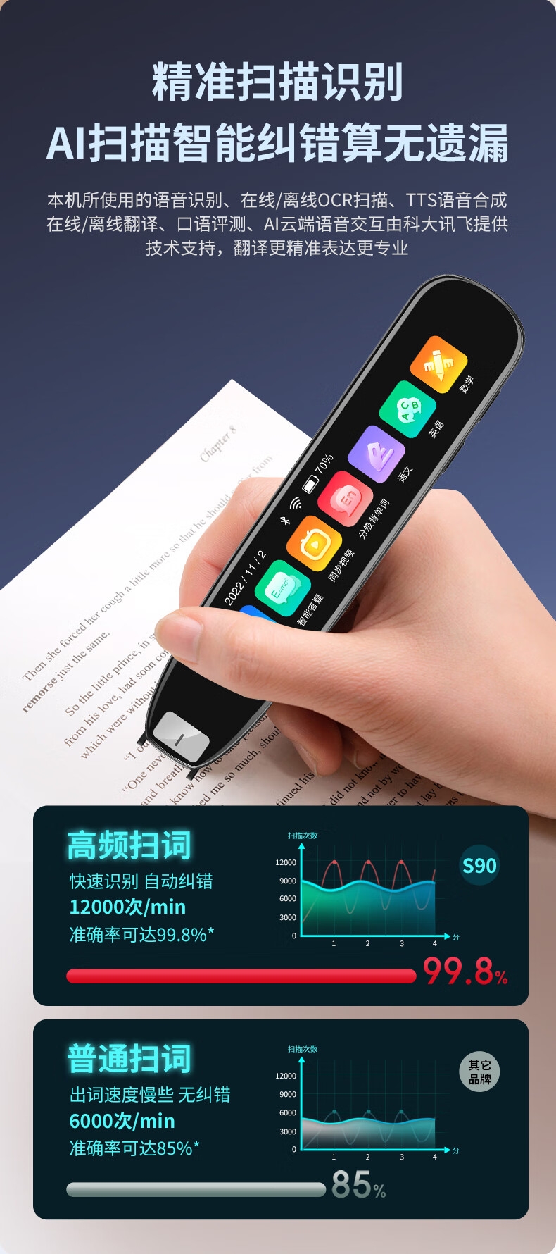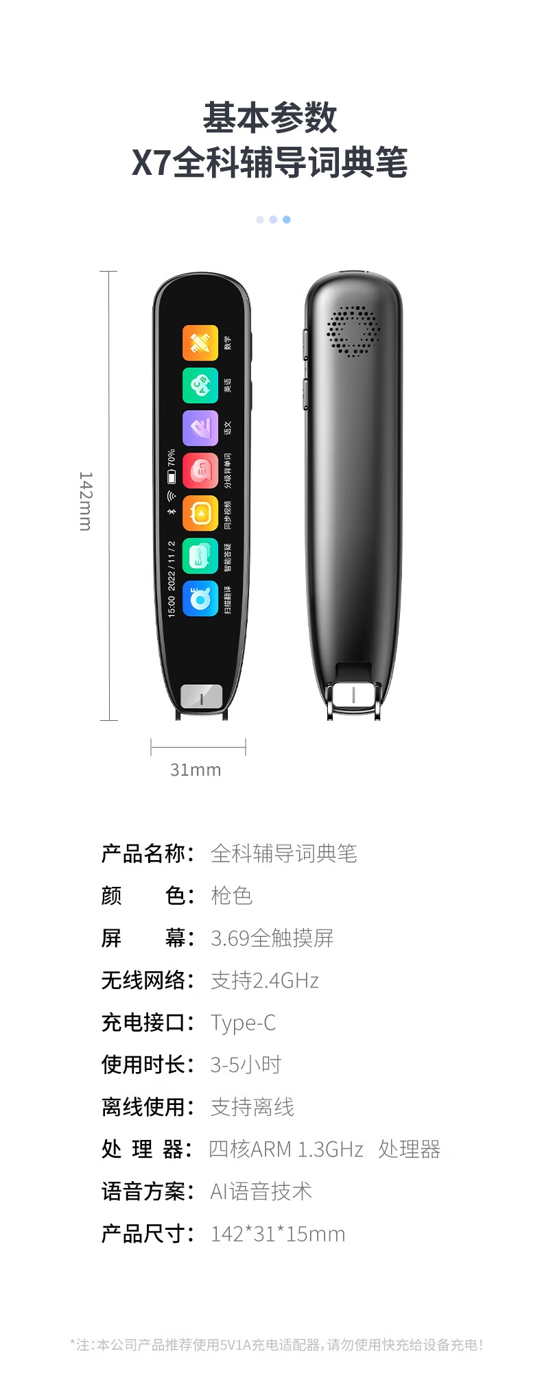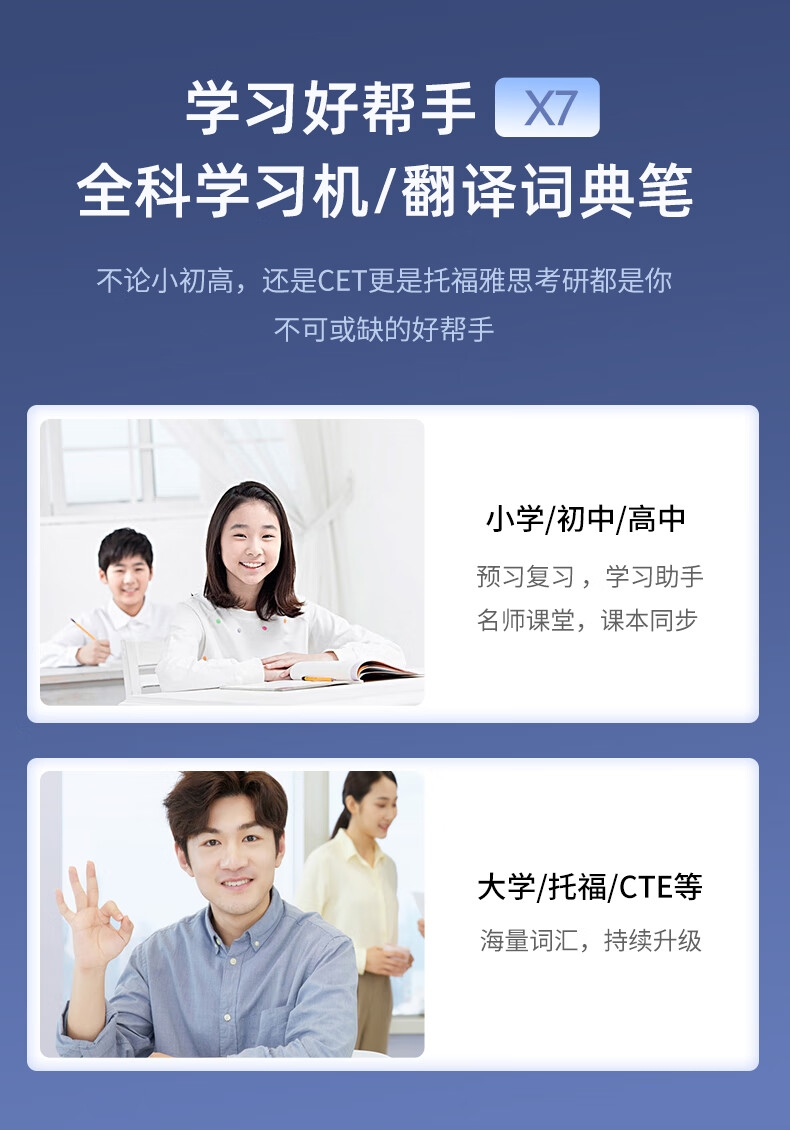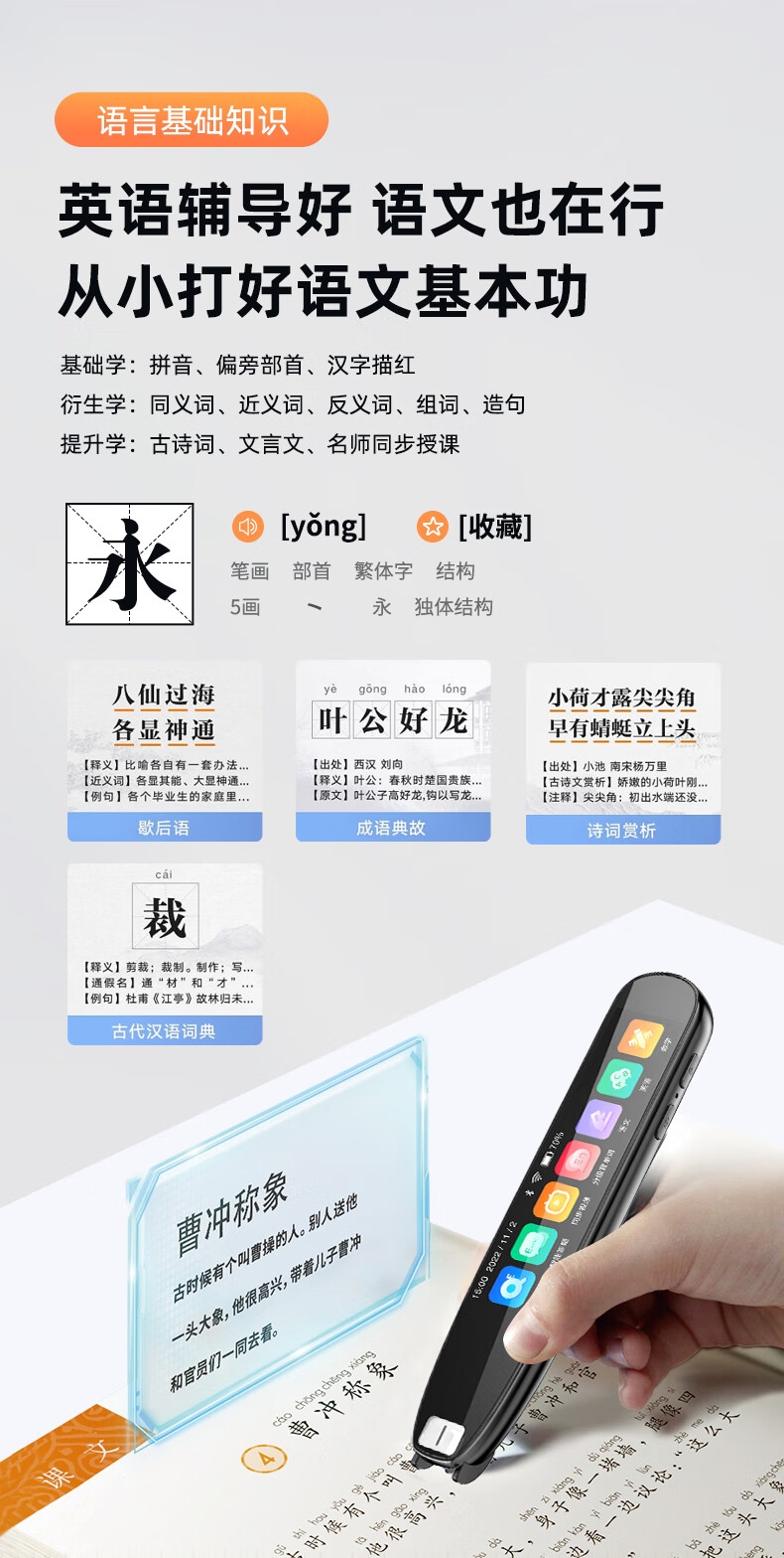 即使没有网络,也能实现翻译功能;海量中,英,日,韩词库,精准解读;AI语音智能助手,答题好帮手
