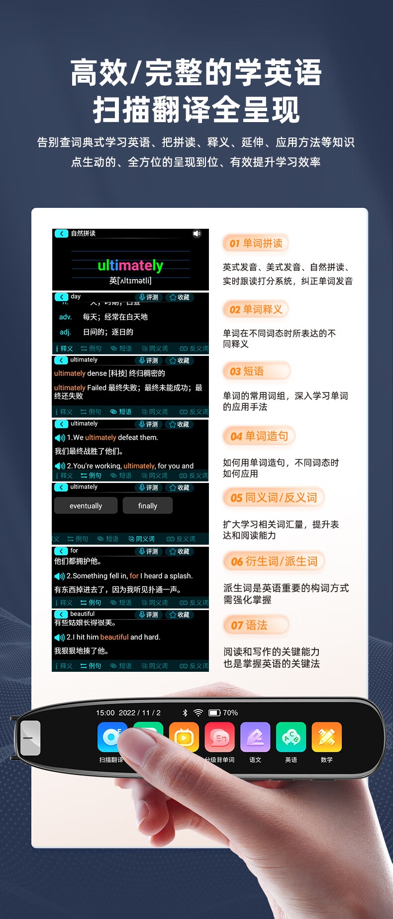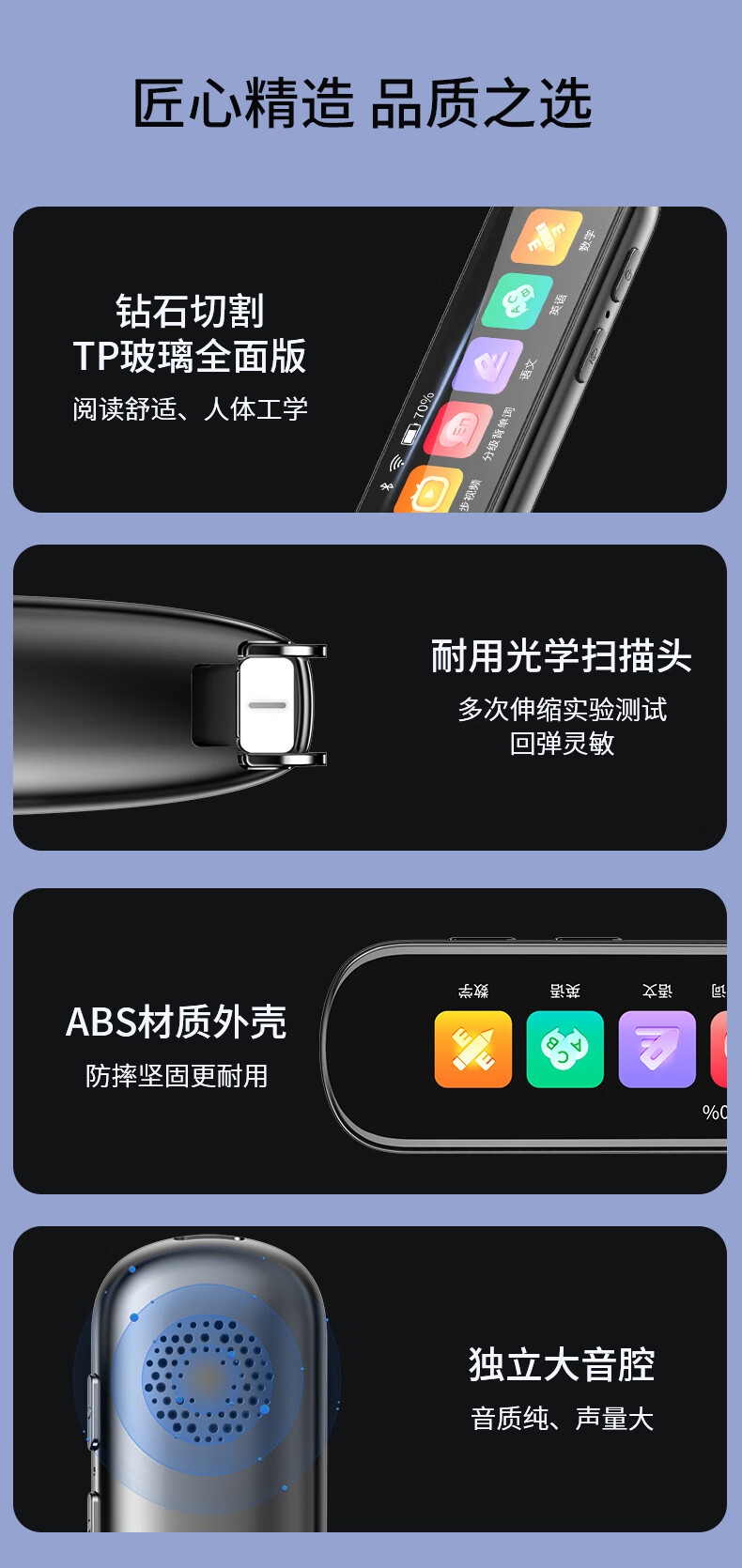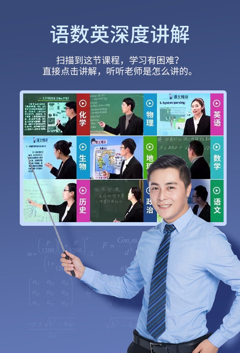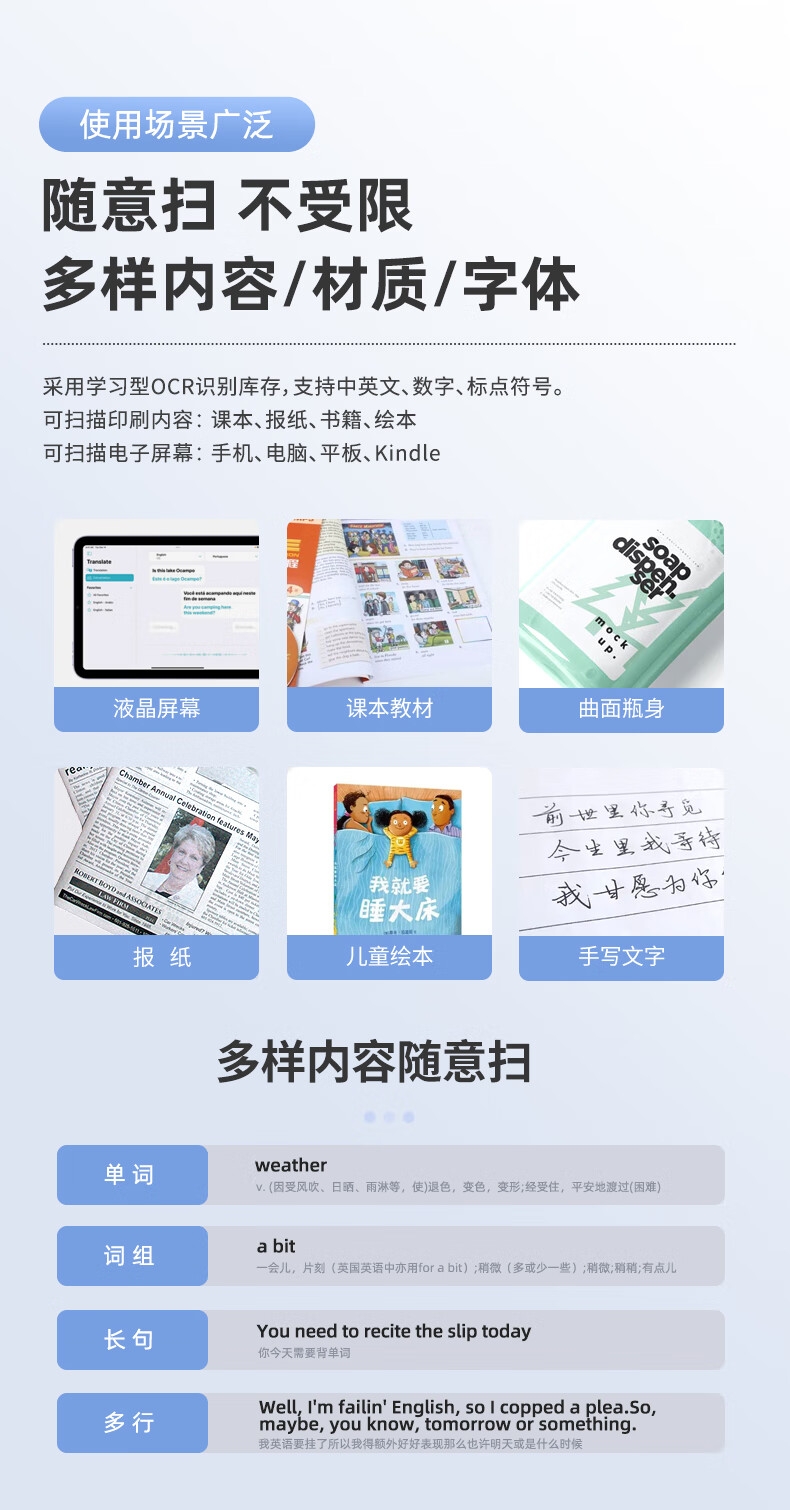 即使没有网络,也能实现翻译功能;海量中,英,日,韩词库,精准解读;AI语音智能助手,答题好帮手