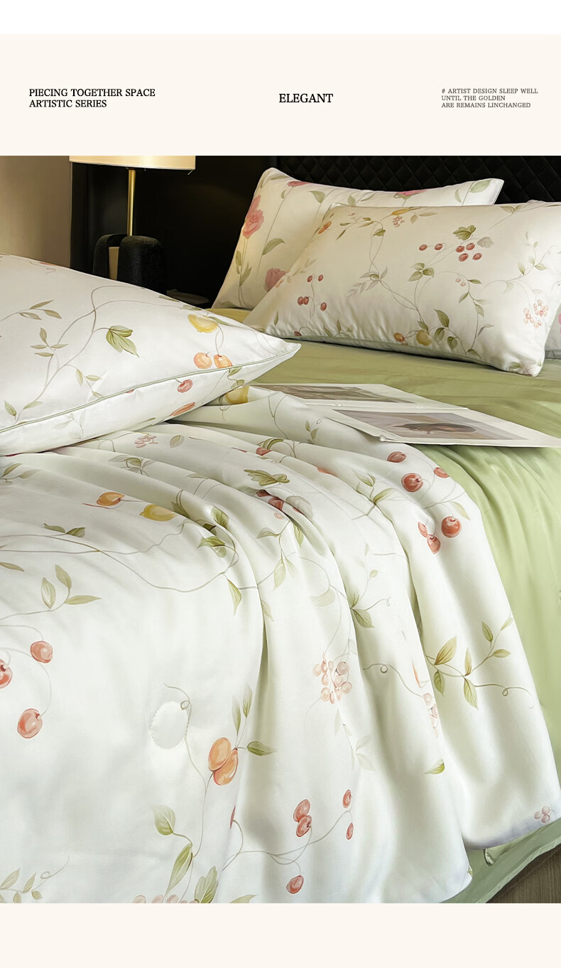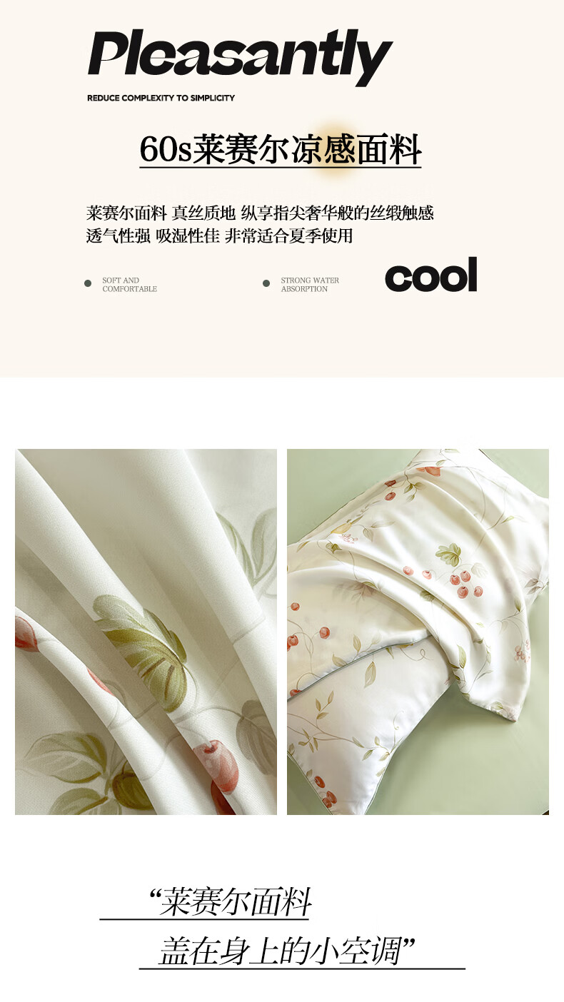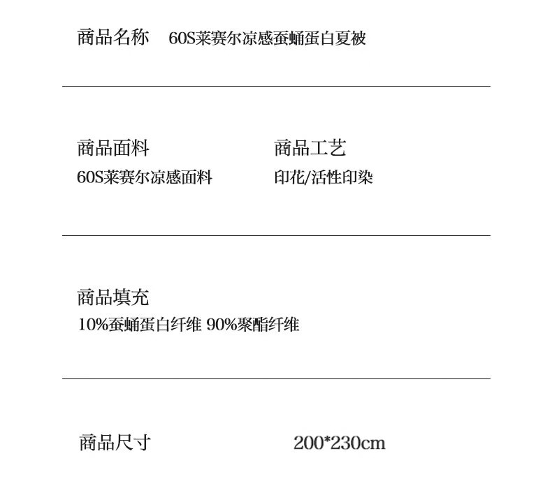 面料采用莱赛尔纯植物天然面料,贴服清爽,质感柔和,;与肌肤无间接触,整个夏季的清凉保障。蚕蛹蛋白; 富含18种人体所需氨基酸被称为“人体的第二肌肤”;睡中滋养悄然变美。