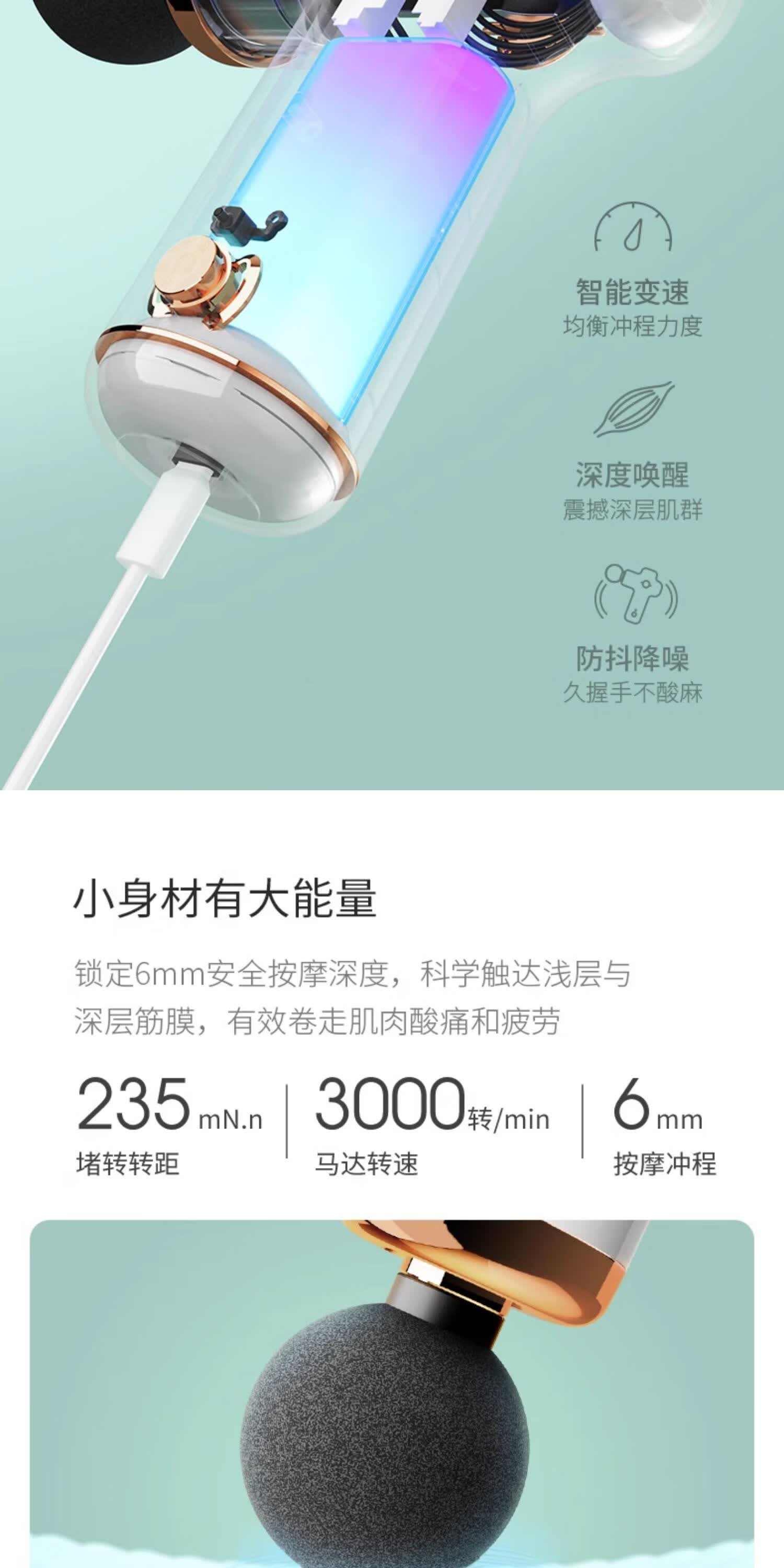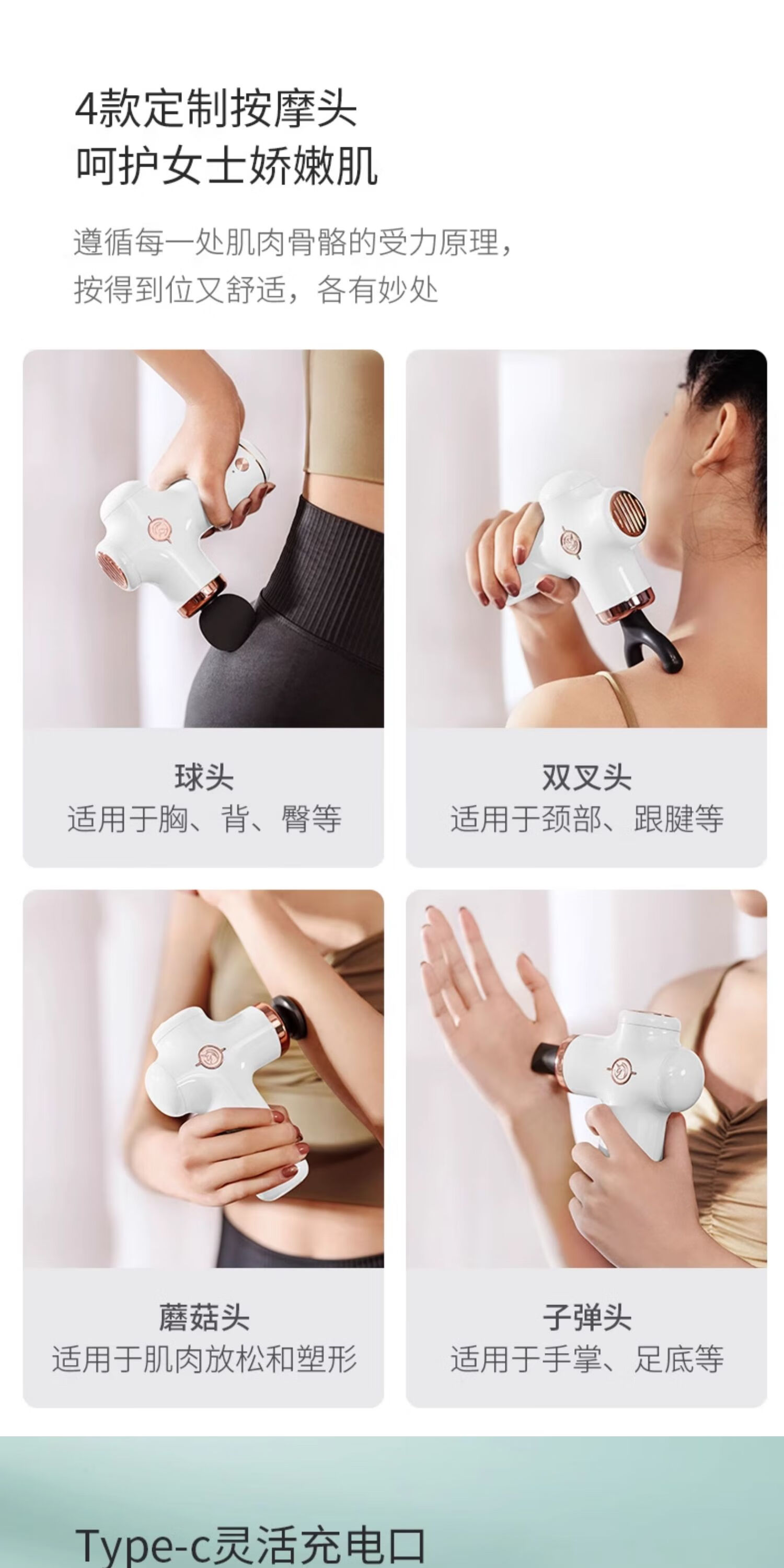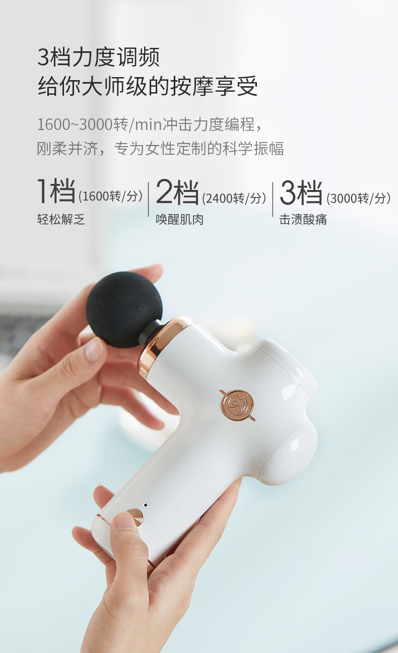 5档力度调频,极致细腻的按摩享受;自带礼盒礼袋,成就私享好礼;4款定制按摩头,遵循每一处肌肉骨骼的受力原理