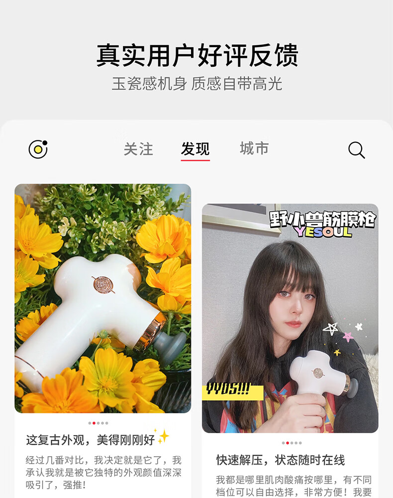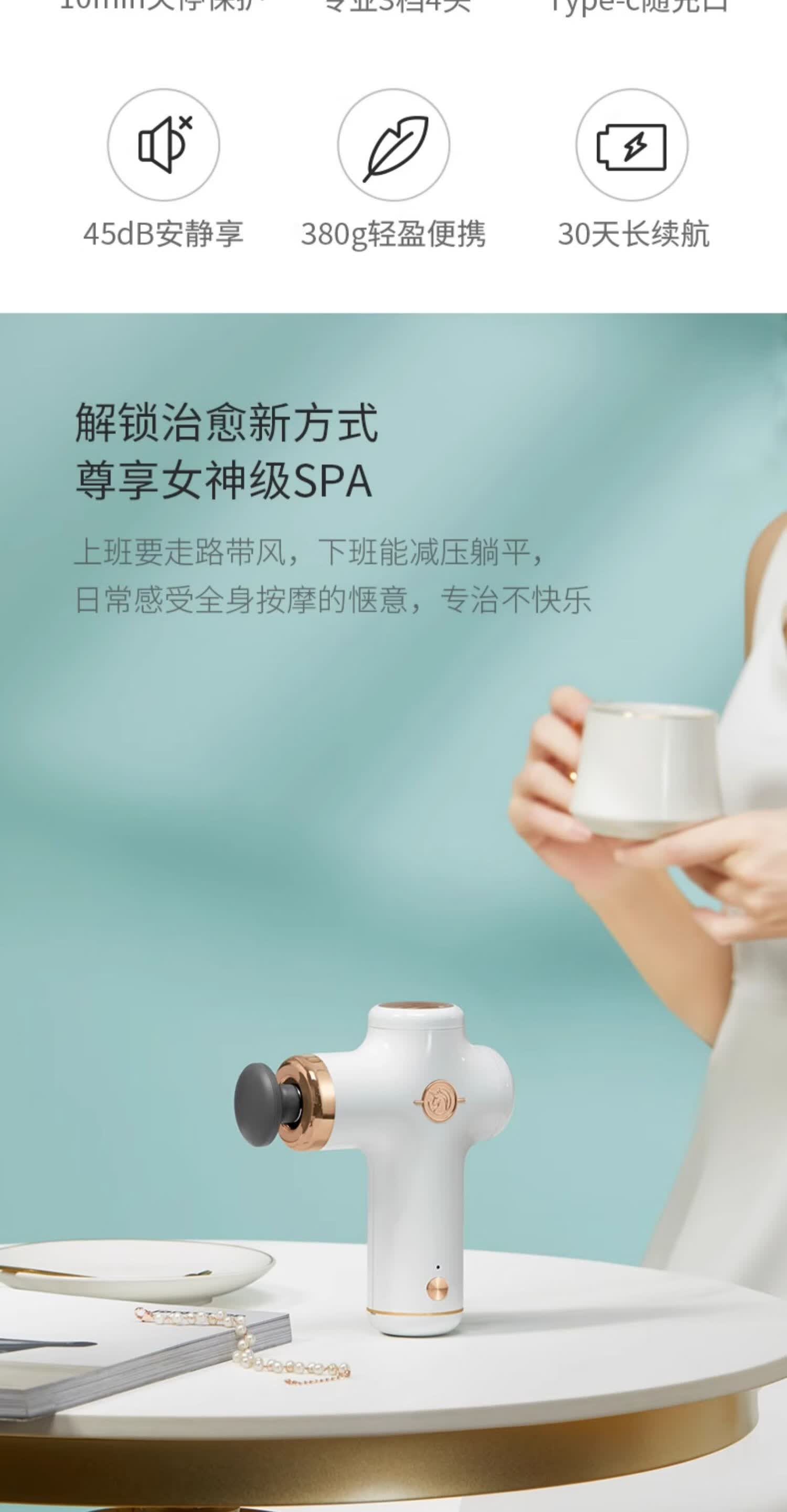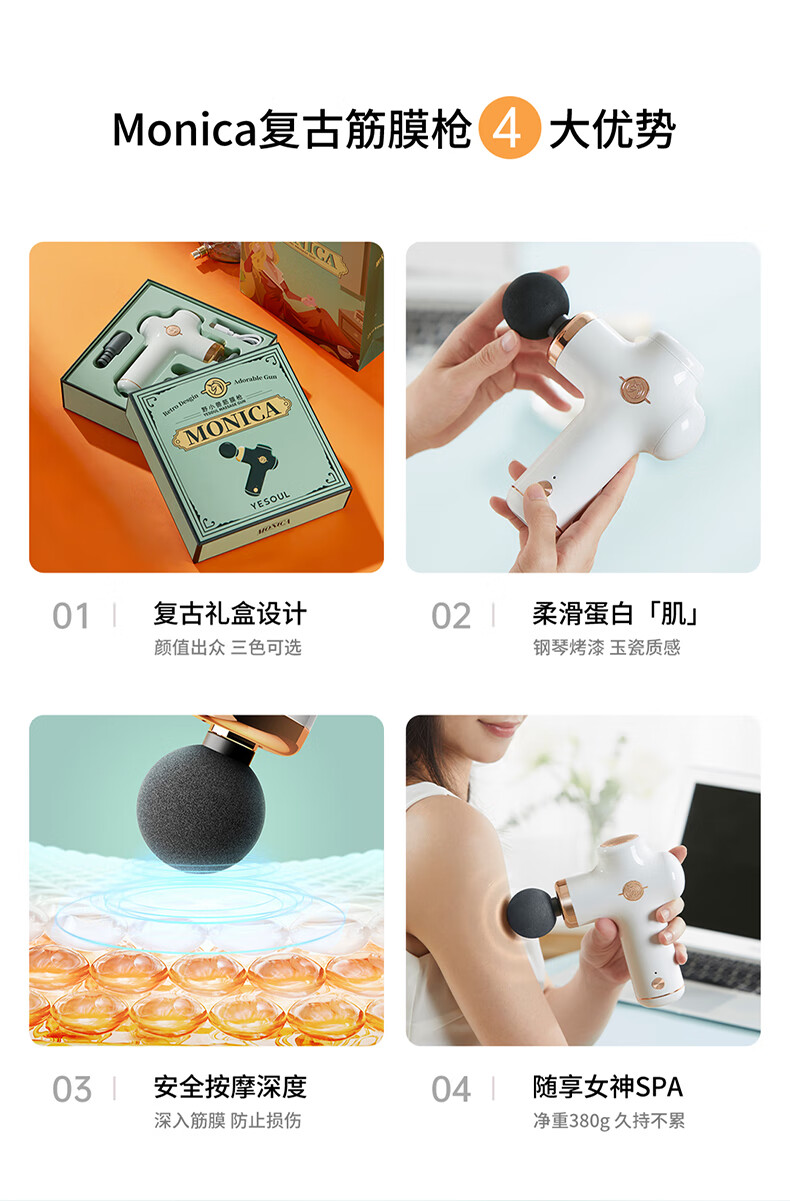 5档力度调频,极致细腻的按摩享受;自带礼盒礼袋,成就私享好礼;4款定制按摩头,遵循每一处肌肉骨骼的受力原理