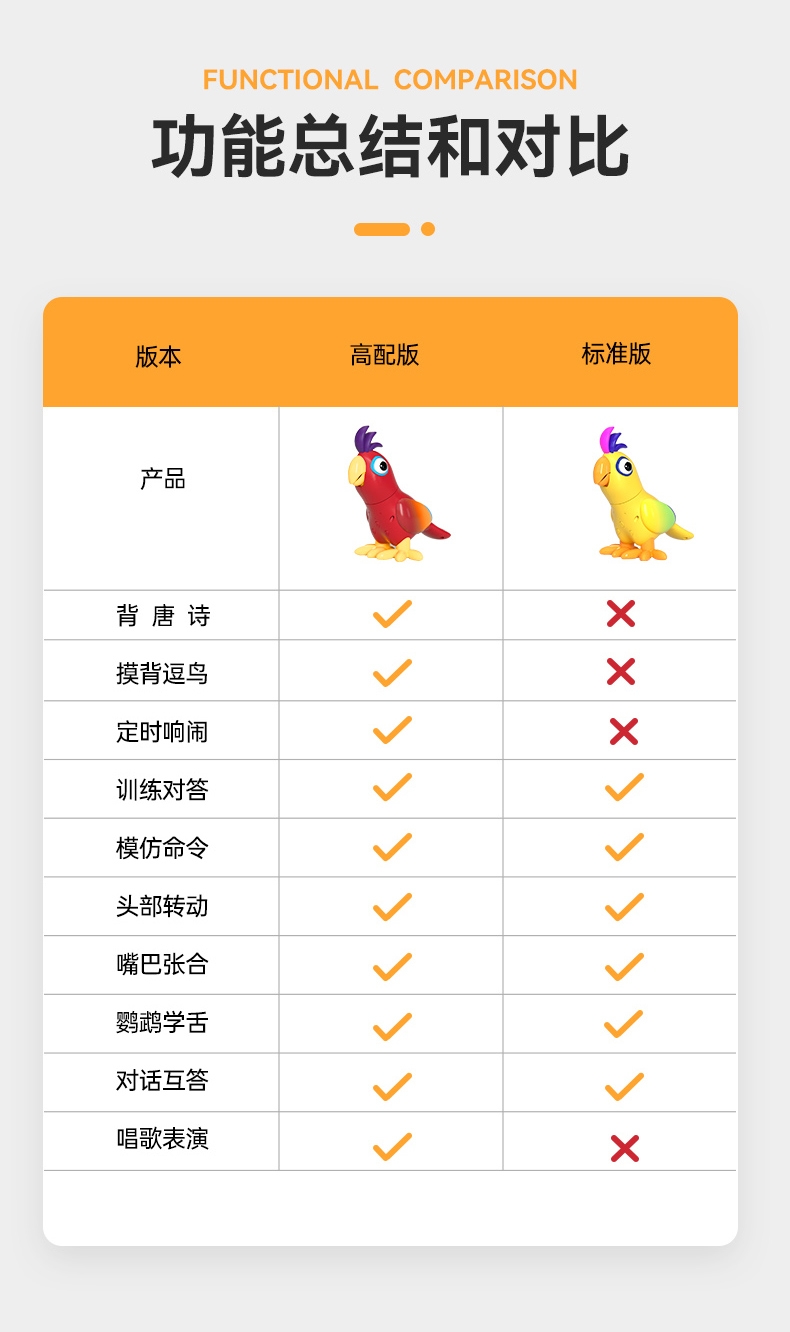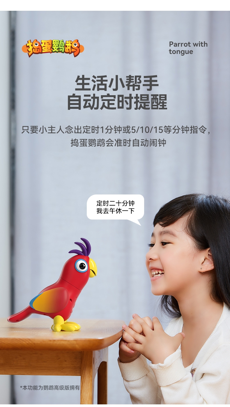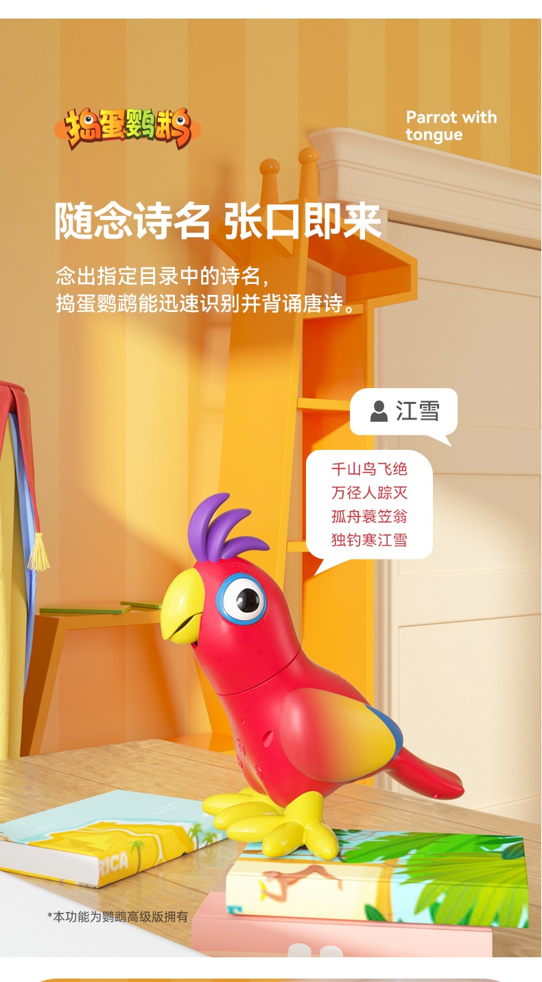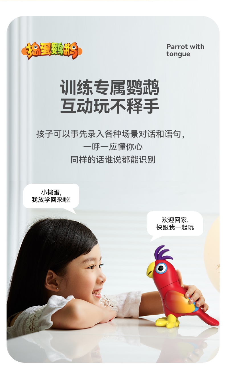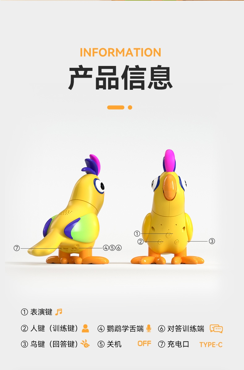 可训练对话,DIY问答、模仿命令、头部灵活转动;嘴巴张合、鹦鹉学舌互动、对话互答、环保材质;孩子玩得放心、背唐诗、摸鸟逗背、唱歌表演