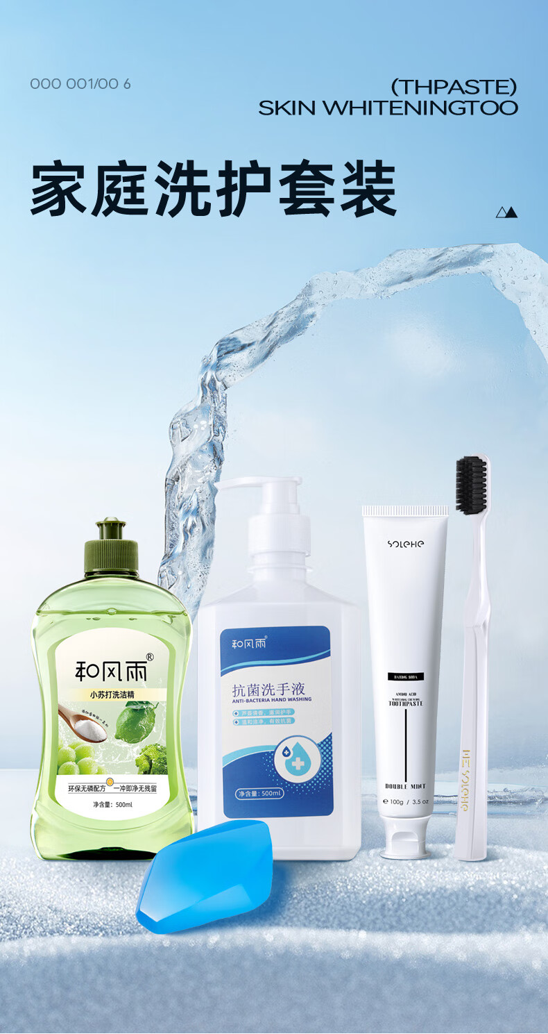 配置清单:洗洁精500ml+洗手液500ml+香皂100g+牙膏100g+牙刷1支